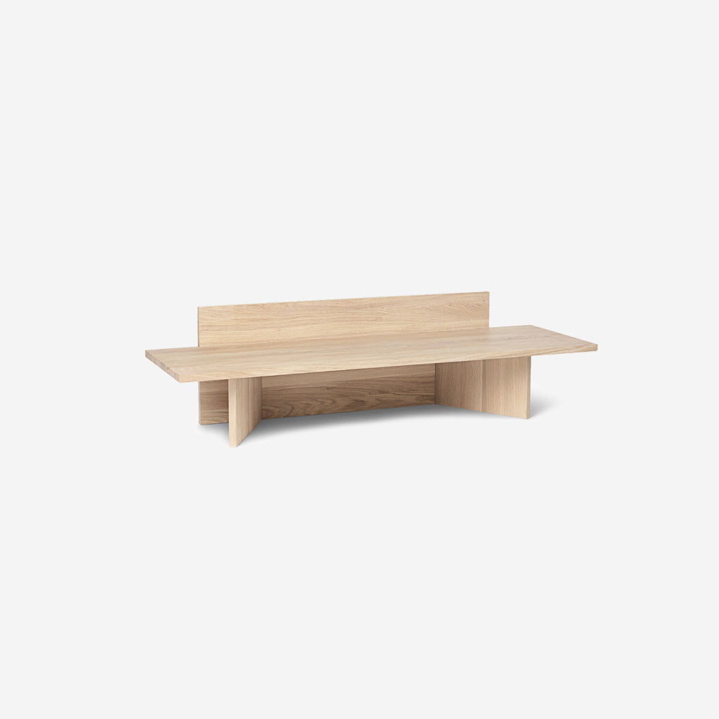 Fusing Japanese woodworking techniques with Scandinavian design sensibilities, the Oblique Bench is simple and sculptural in design and is made with low living in mind. Taking its name from the tilted angles of the few, yet perfectly placed, elements that make up its construction, this solid oak seat with a natural oiled finish elevates objects when used as a display for books, vases and more, and makes light work of putting on and taking off shoes in a hallway.