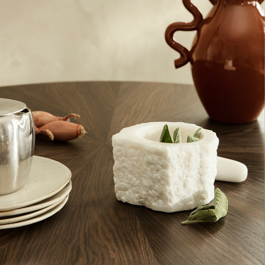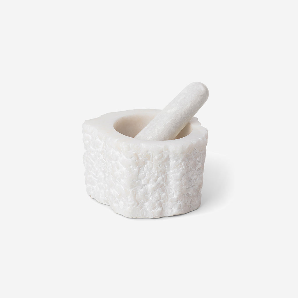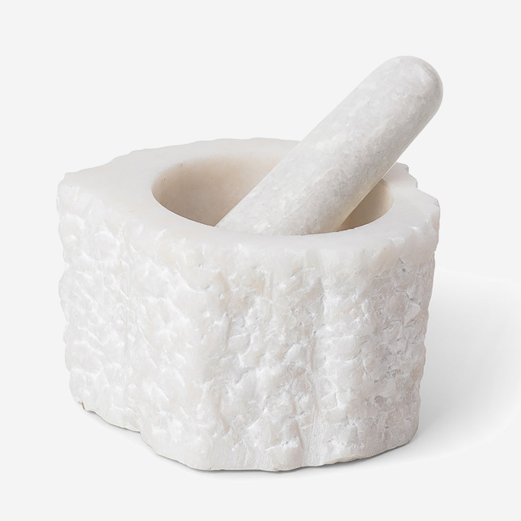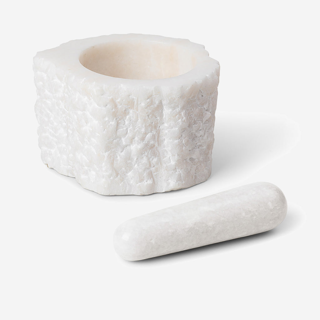 Like magnificent rocks found at a quarry, the bowl of the Petra Mortar is cut from one solid piece of quartz, which is known to be a durable material for kitchen utilities. Celebrating the beauty of its natural material, it has a raw, organic expression. Carved and polished into a mortar, it remains a design object, while the unique capability of the natural quartz speaks for itself. The Petra Mortar is complete with a pestle made of polished quartz. Use the Petra Mortar for herbs, spices and for making aromatic tapenades