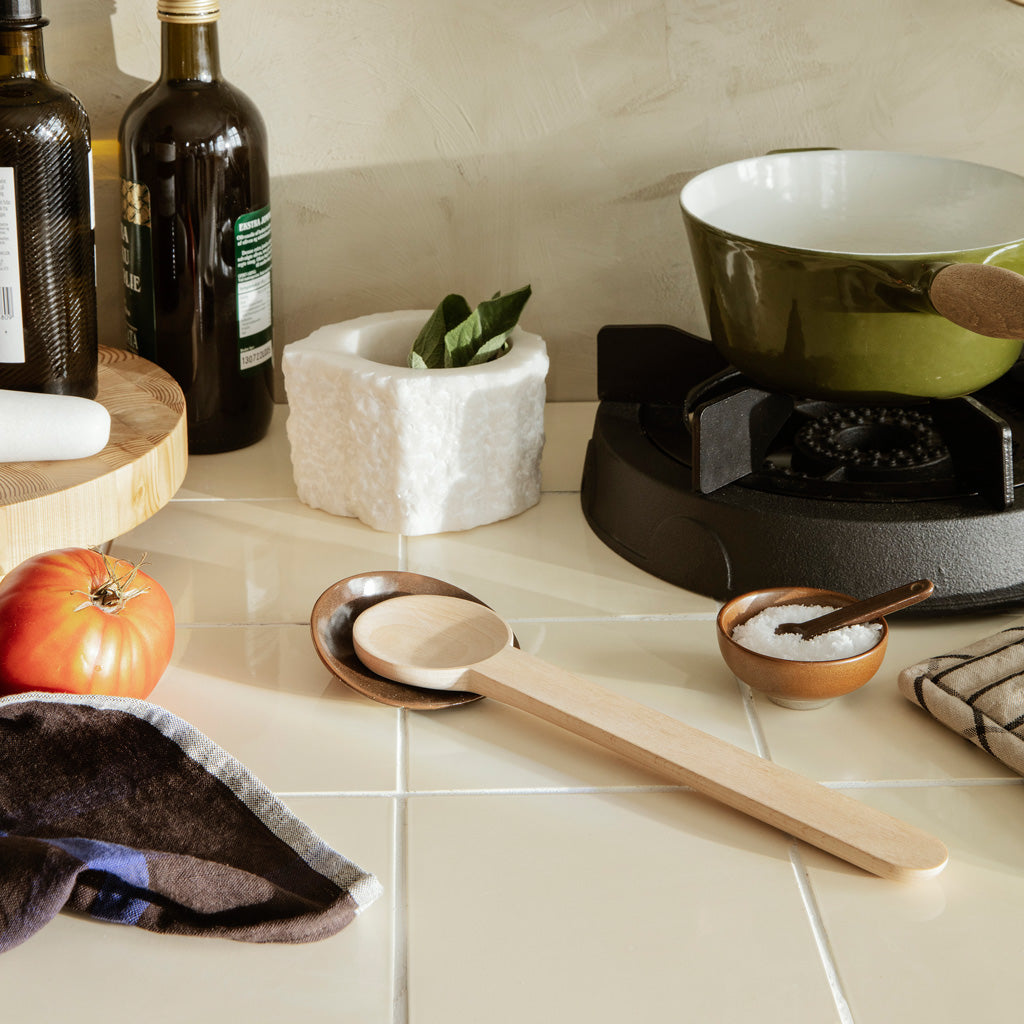 Working as a functional helper in the kitchen, the Resting Spoon Set consists of a large, soft-curved wooden stirring spoon and a porcelain spoon rest. Glazed in a warm nuance, the porcelain spoon rest has a distinct melted side, making it possible for the wooden spoon made of FSC™-certified wood to lay effortlessly in the spoon rest. Minimize the mess that goes into cooking your favourite meals and keep the Resting Spoon Set close to your stove.