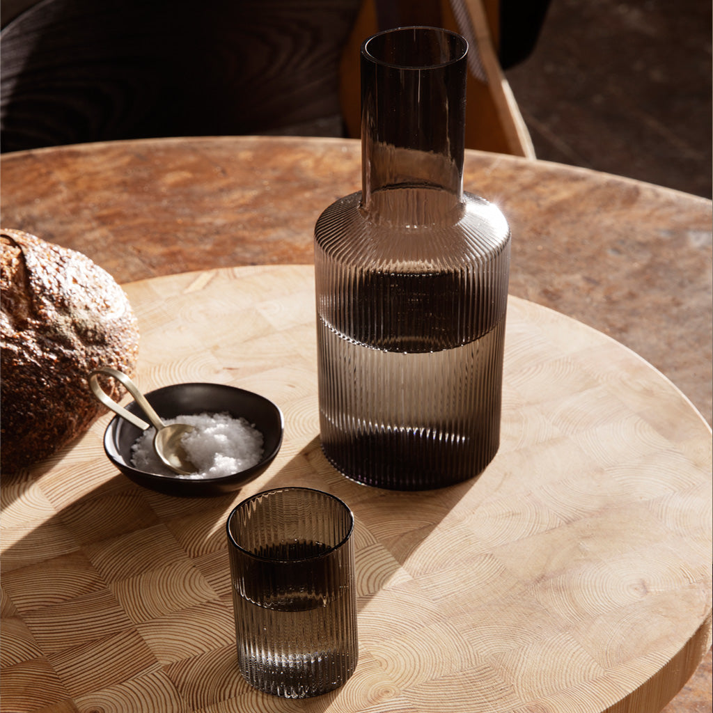 A companion to the Ripple Carafe, this elegant glass functions as both a drinking glass and lid. Inspired by small, delicate glasses traditionally used in French cuisine to serve little appetisers and desserts, the mouth-blown glass has a rippled surface that is distinctive to the series.