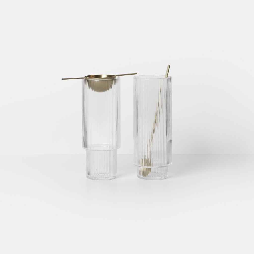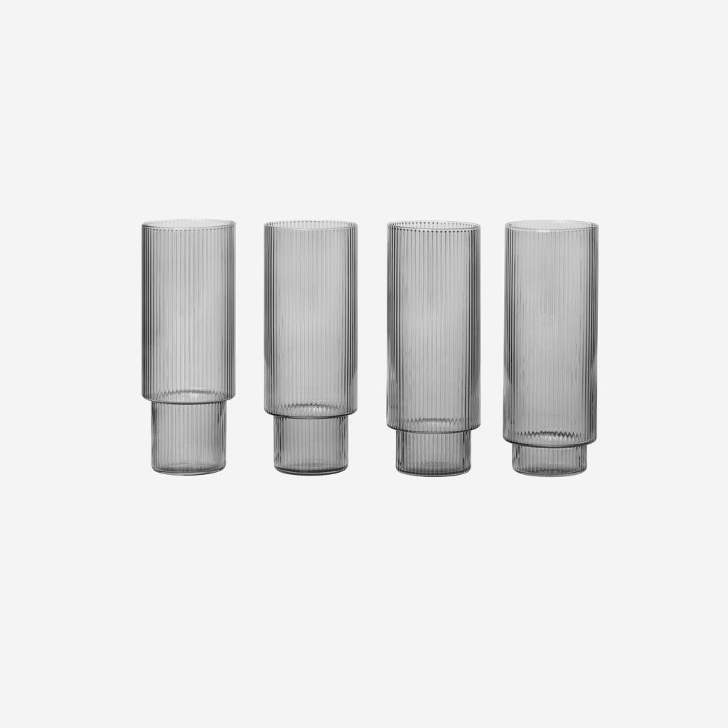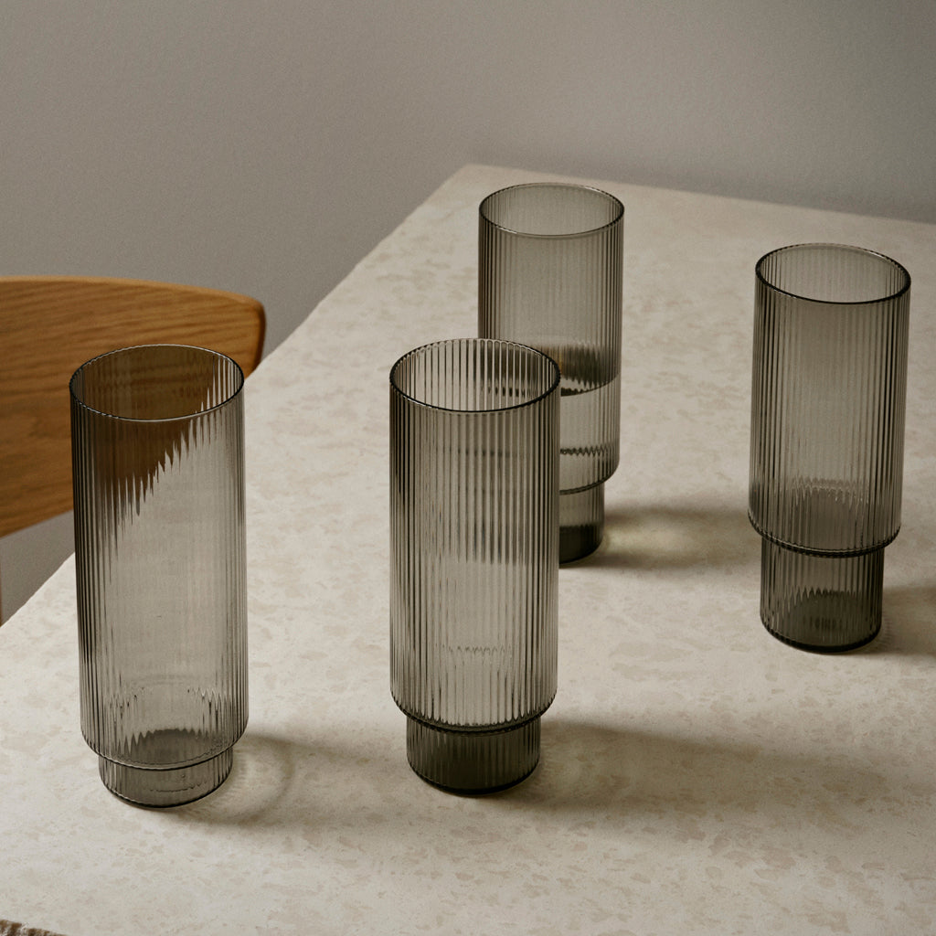 Ferm Living’s Ripple glasses are a skillful and powerful expression of sophistication. Detailed with thin vivid vertical ripples, the long drink glasses add both aesthetic and functional elements for serving drinks and cocktails. The set consists of four tall glasses, each with its own form.