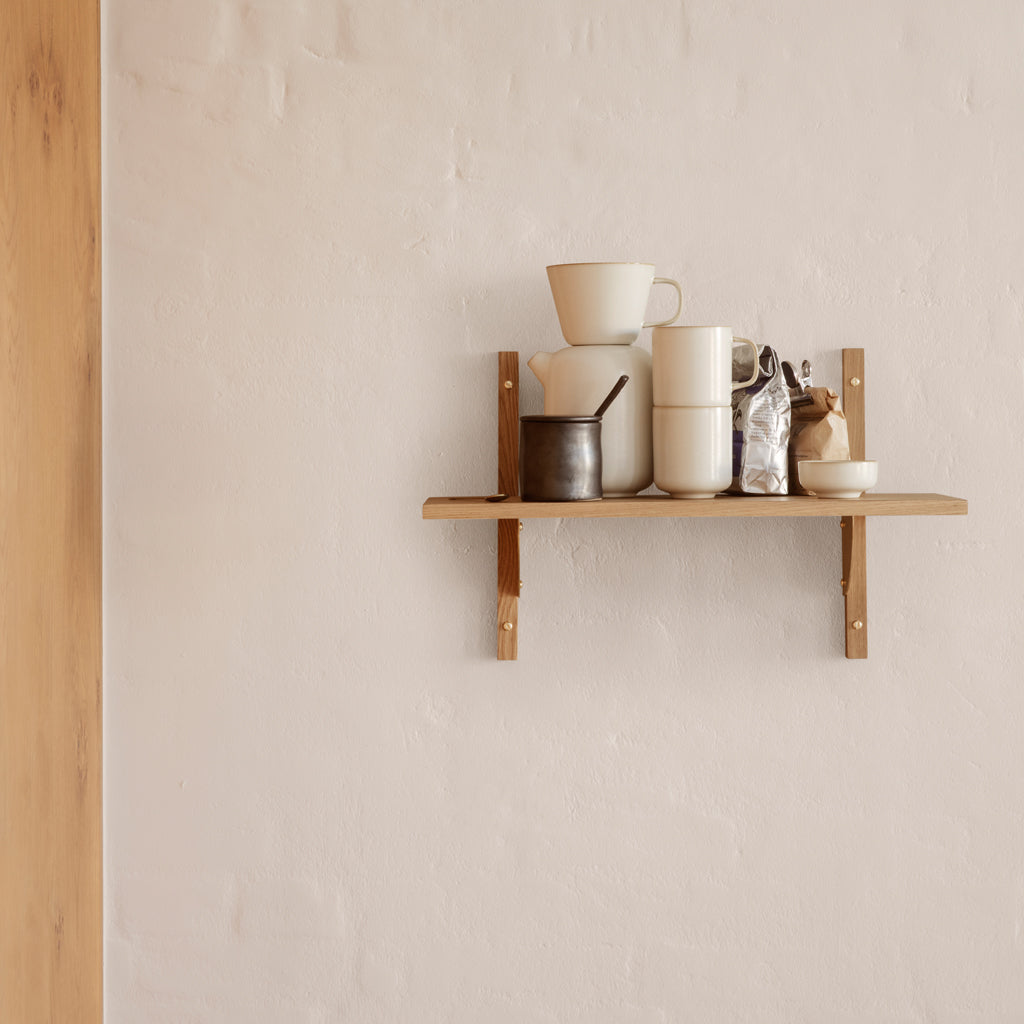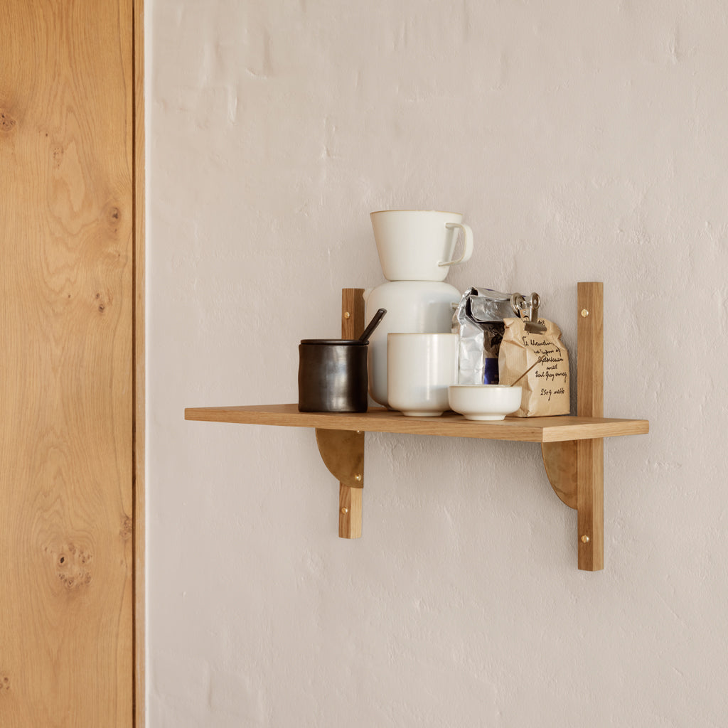 A new and modern take on Mid-century shelving units, Sector is defined by its sturdy simplicity and classic combination of wood and brass – available with natural oak veneer or black stained ash veneer shelves, and polished brass or blackened brass brackets. The shelf attaches to a wall with the accompanying solid wood uprights with visible screws. Use it to display favourite objects in a living room or storage jars in a kitchen.