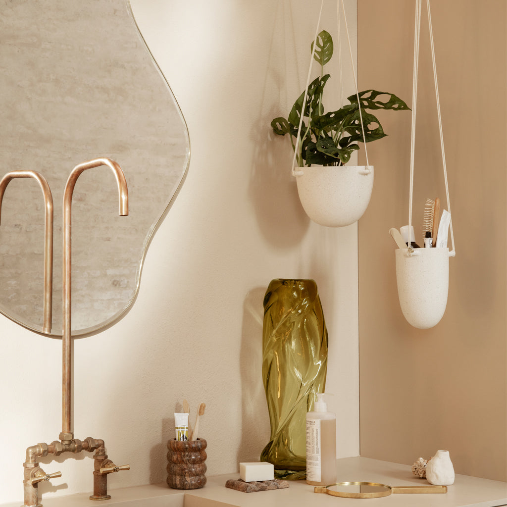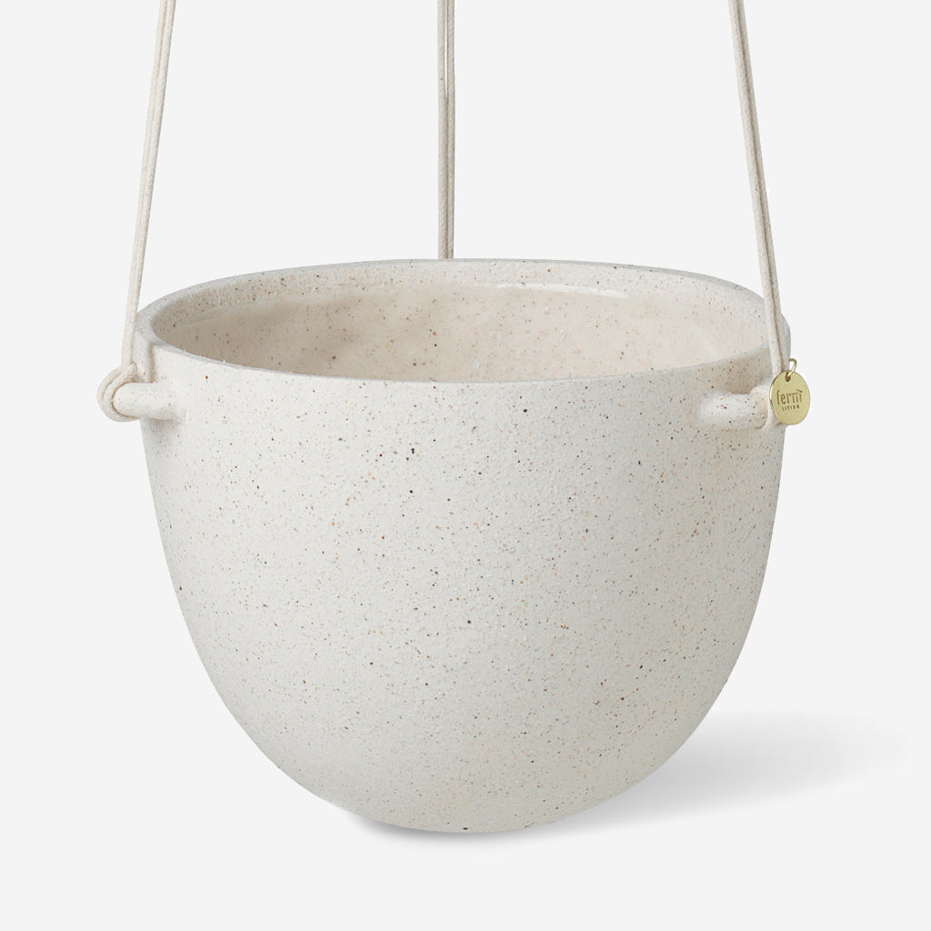 Made with a distinct sort of stoneware that features a grainy, raw texture, the Speckle line presents an organic, handmade look and feel. This hanging version carries on the fluid silhouette with spherical pots suspended by twisted cotton rope. The ample rope length means that the height is easily adjusted to the desired location in your home.
