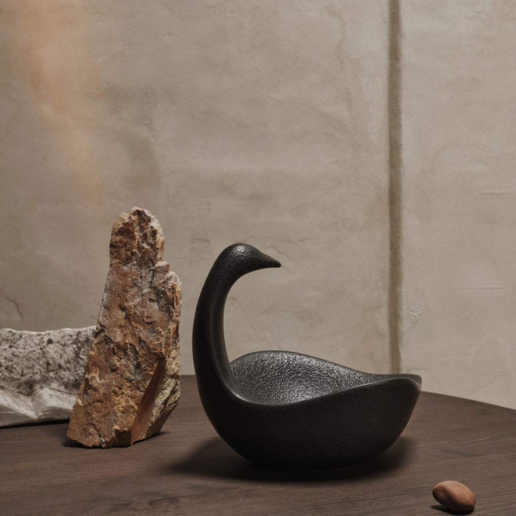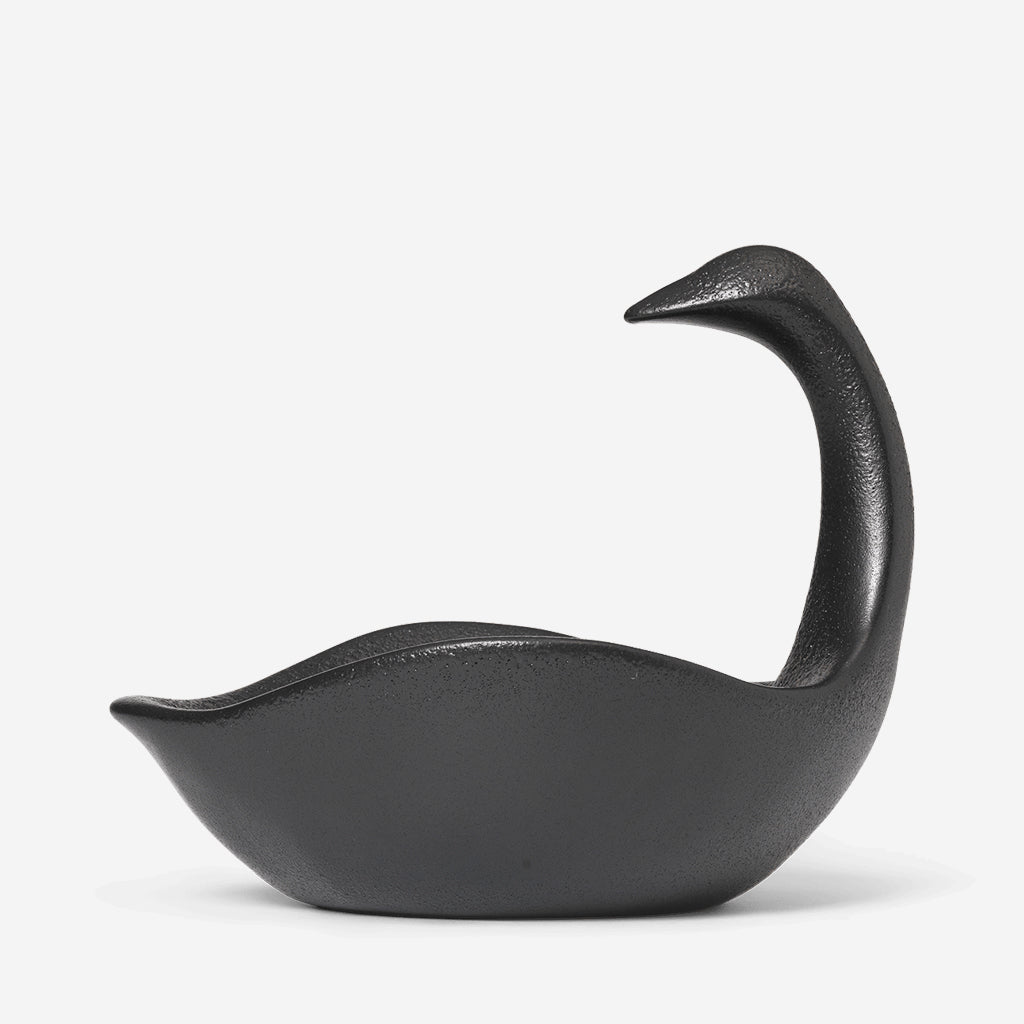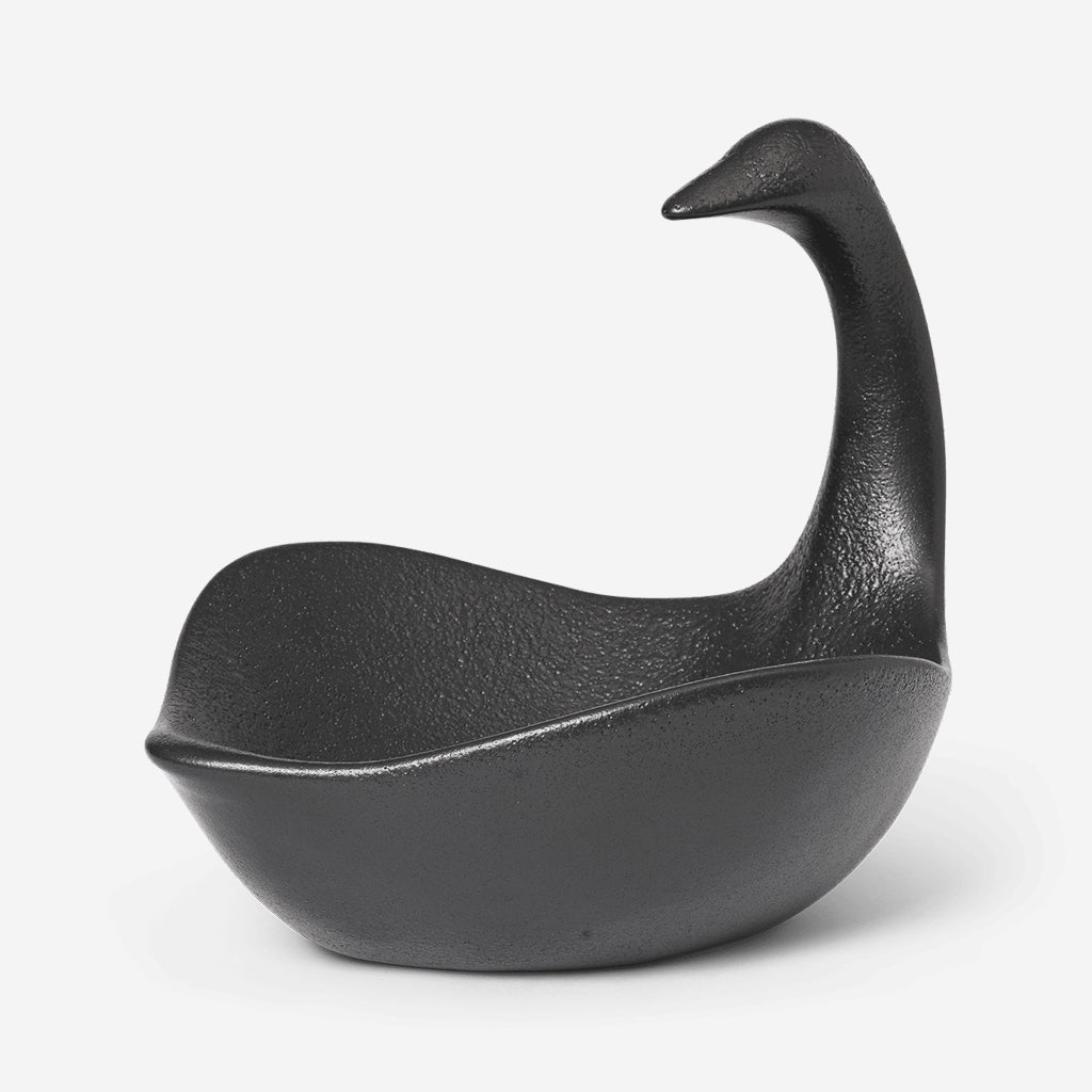 Inspired by vintage references, the Swan Centrepiece embodies timeless elegance and romantic charm, evoking a sense of nostalgia and sophistication. This exquisite piece serves as a decorative element while also offering practical functionality. Its spacious body and elongated neck provide ample space, creating a visually striking display that doubles as a functional serving dish. Crafted from black glazed ceramic, this centrepiece is food-safe, making it a perfect addition to any table setting.