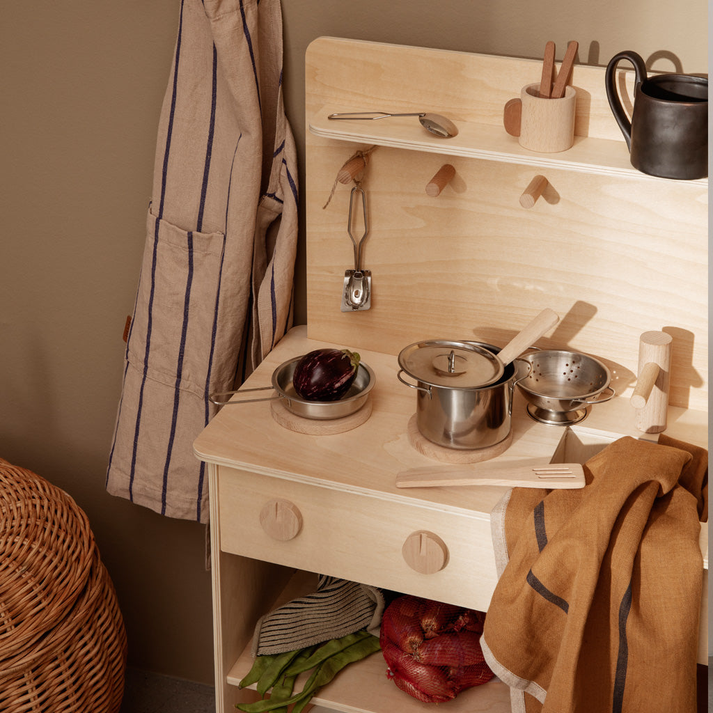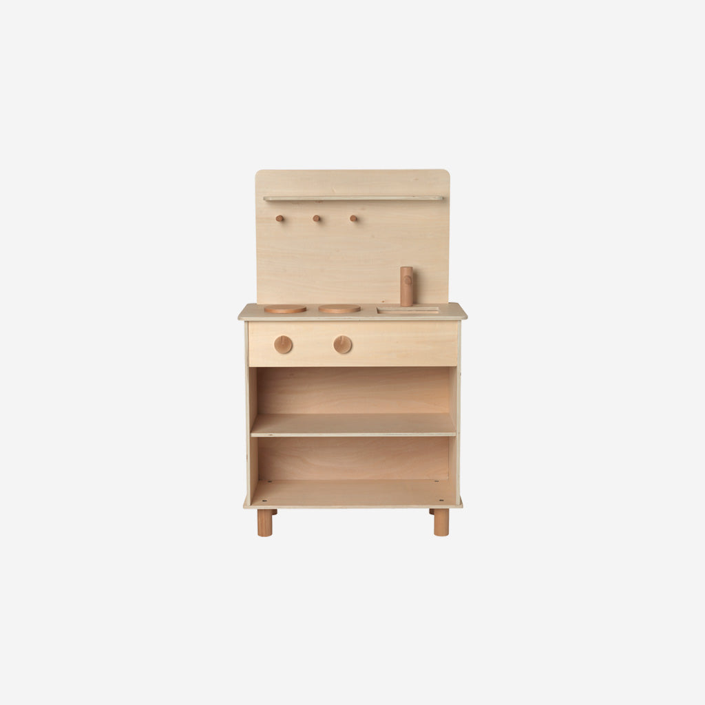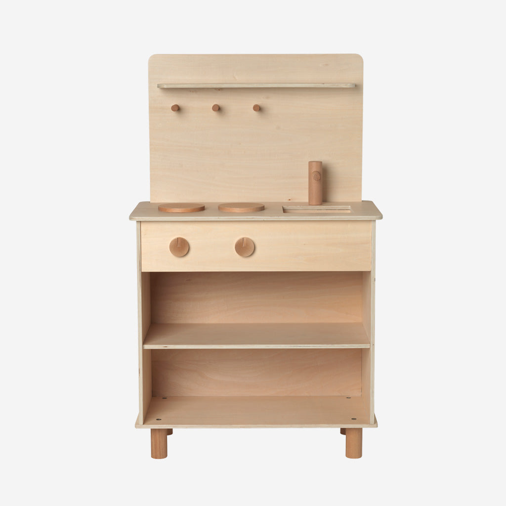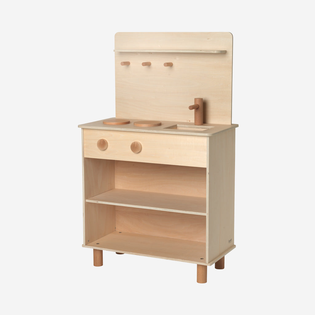 This small play kitchen can never have too many cooks. Practice preparing your favourite meals or make up new, fanciful recipes. Made of natural plywood, it leaves room for childish imagination while being a contemporary and stylish choice which can be placed anywhere in the home. The kitchen has a sink with a tap, two hot plates, three hooks for all your utensils, and storage shelves. The details are made in natural, yet lightly toned solid beech wood to make them stand out from the rest.
