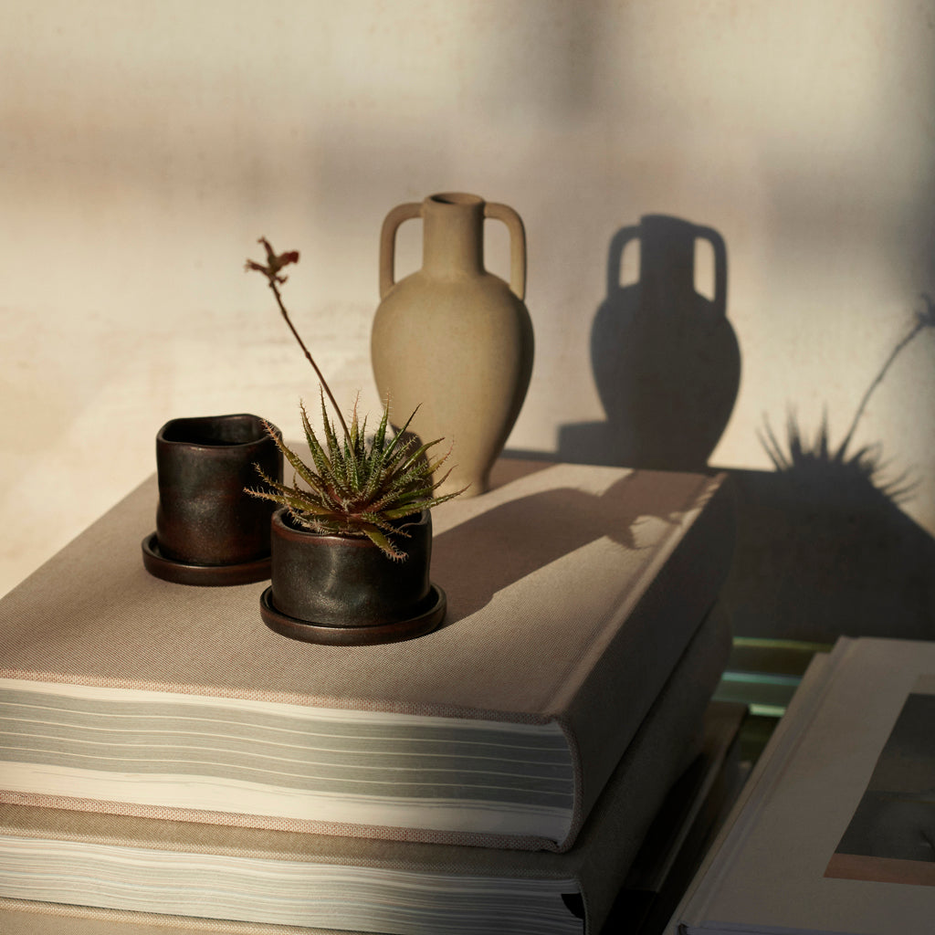 Featuring glazed outer surfaces and artfully uneven edges, this set of Uneru Mini Pots with matching saucers will provide any space with a warm, tactile expression. Made from stoneware, the endearing miniature pots will make the ideal home for smaller plants. The Uneru Mini Pots arrive in a lovely wooden box, making them an ideal gift for plant enthusiasts.