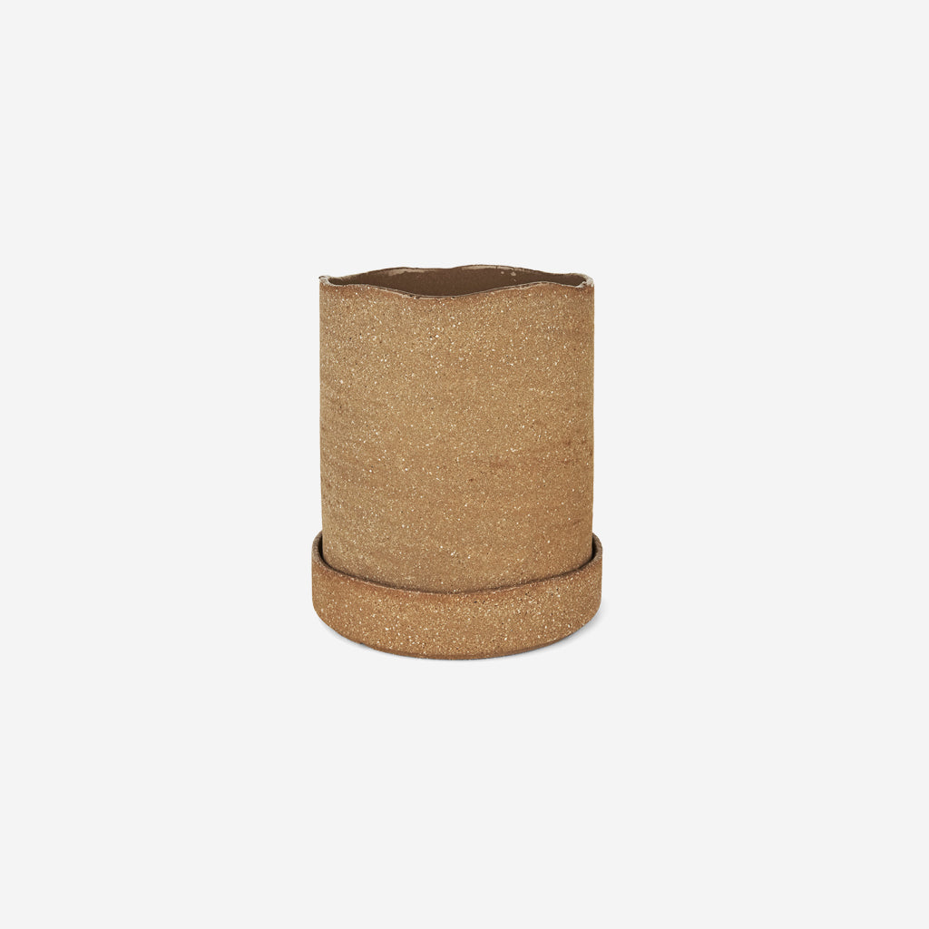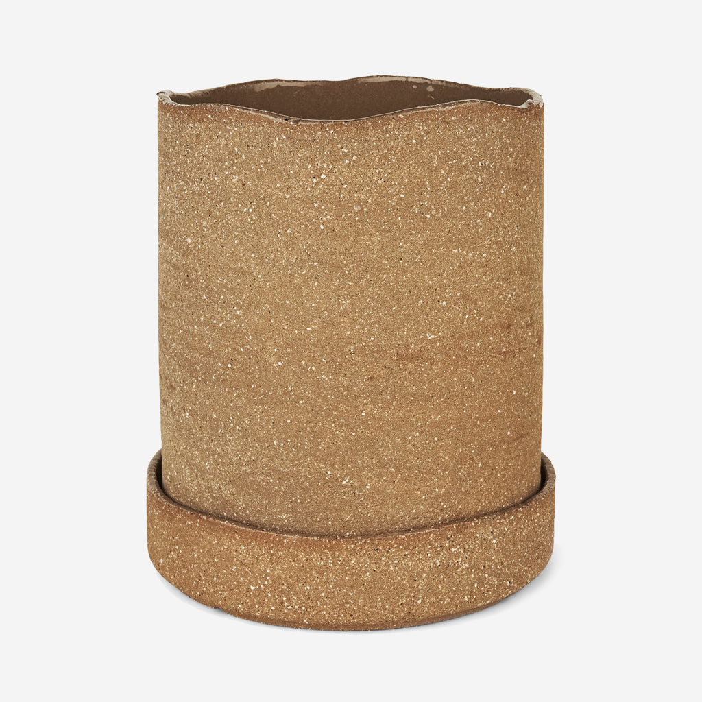 Featuring an unglazed, rough outer surface and an artfully uneven edge, the Uneru Pot and matching saucer will provide any space with a warm, tactile expression. Made from 30-40% recycled clay, the inside of the pot has been glazed, making it the ideal home for your favourite plants.