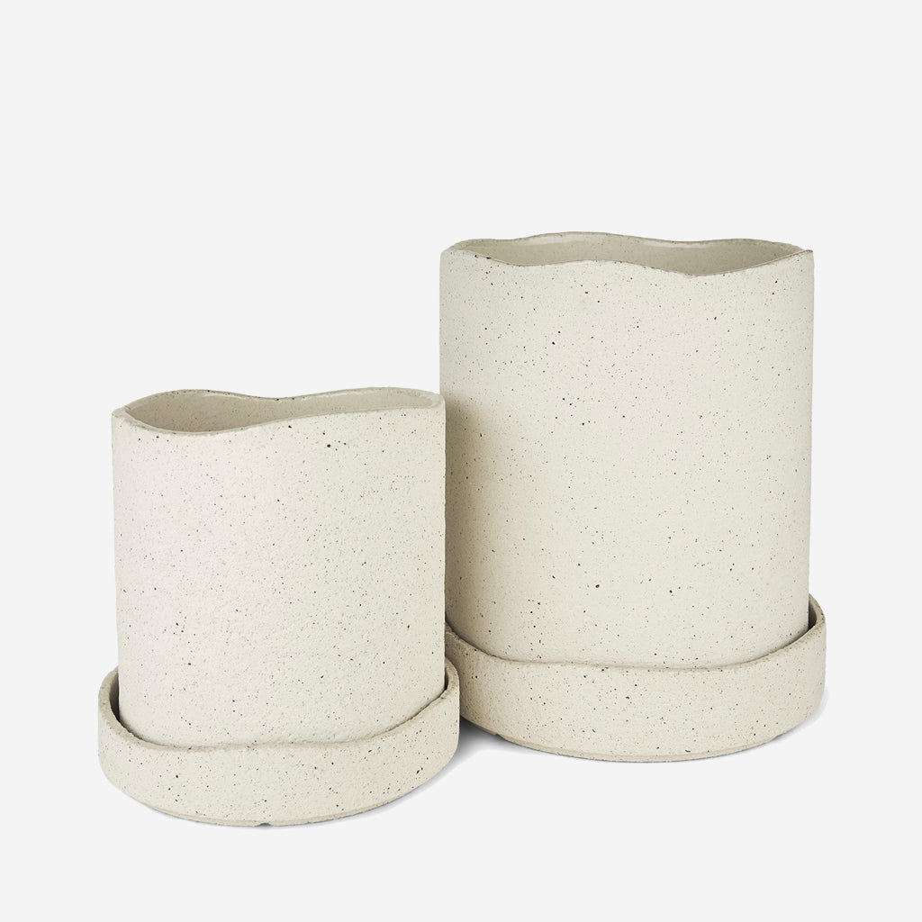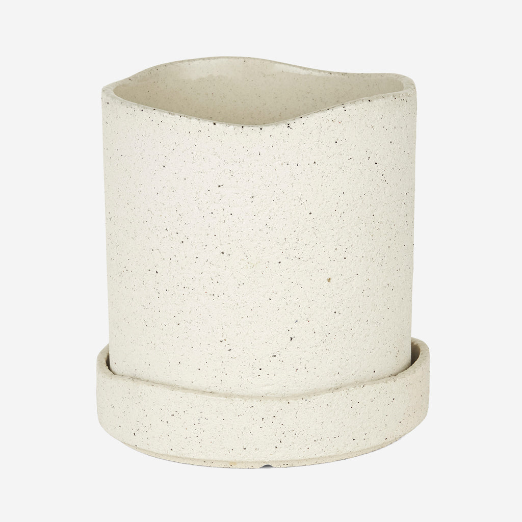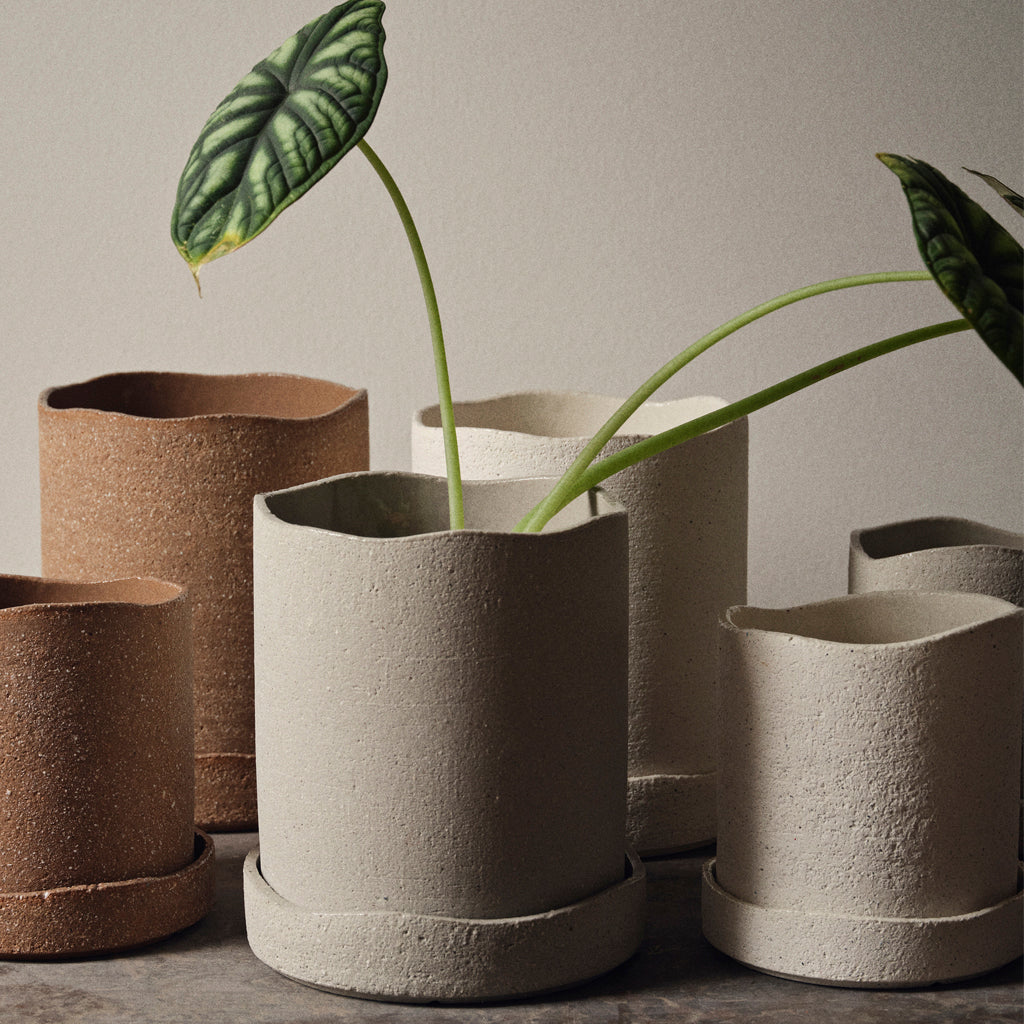Featuring an unglazed, rough outer surface and an artfully uneven edge, the Uneru Pot and matching saucer will provide any space with a warm, tactile expression. Made from 30-40% recycled clay, the inside of the pot has been glazed, making it the ideal home for your favourite plants.