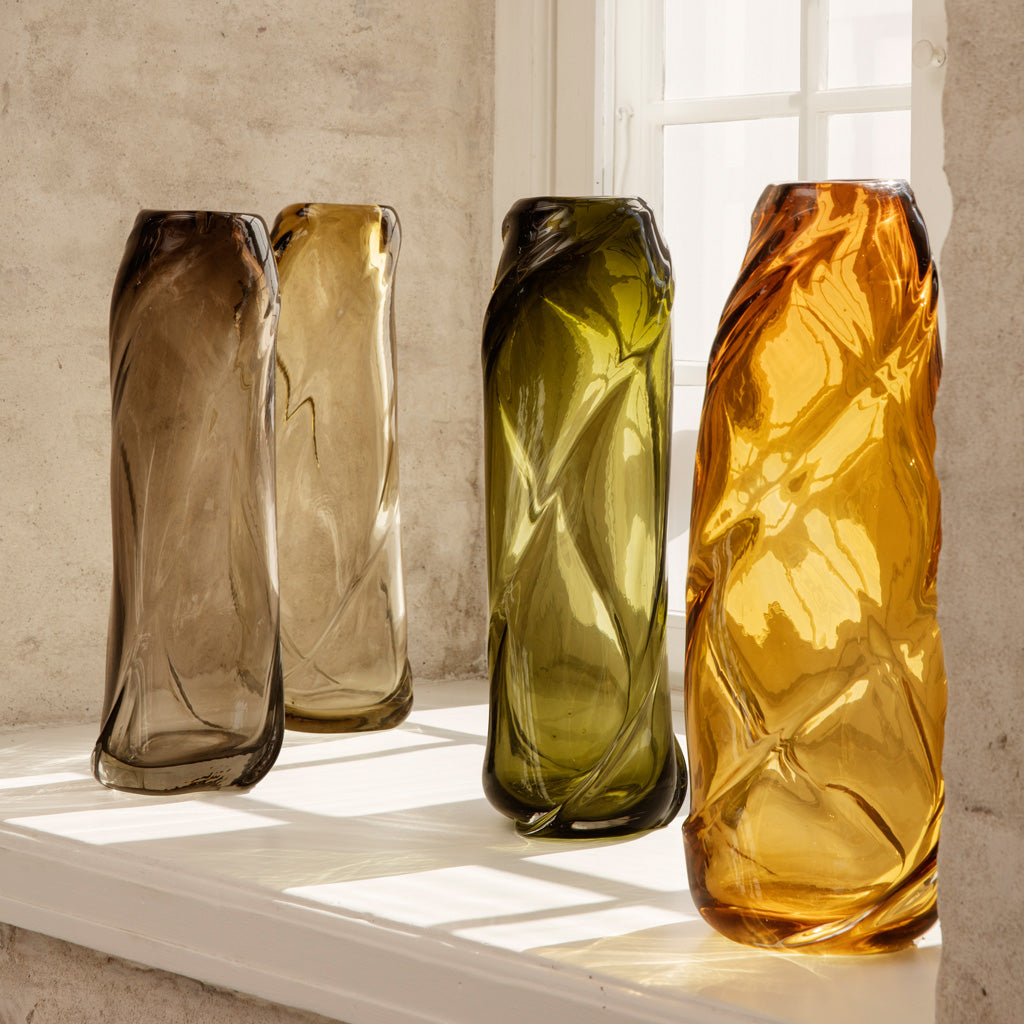 The mouth blown and oversized Water Swirl Vase recalls a whirl of cascading liquid. With its translucent coloured glass, the vase achieves a light and effortless, almost dancing, expression despite being crafted from solid, massive glass. Fill the vase with flowers or stalks, or style it solo and enjoy how the sun filters through the transparent glass. Enjoy the unique twists and curves of each individual piece, as no two vases are identical.