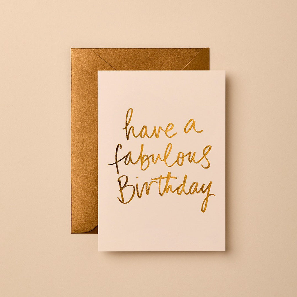 Luxury, gold foil Have A Fabulous Birthday greeting card. Kind to the planet, heavy weight card stock with a blank interior. Matched with an antique gold envelope in a cello sleeve. Made in Australia
