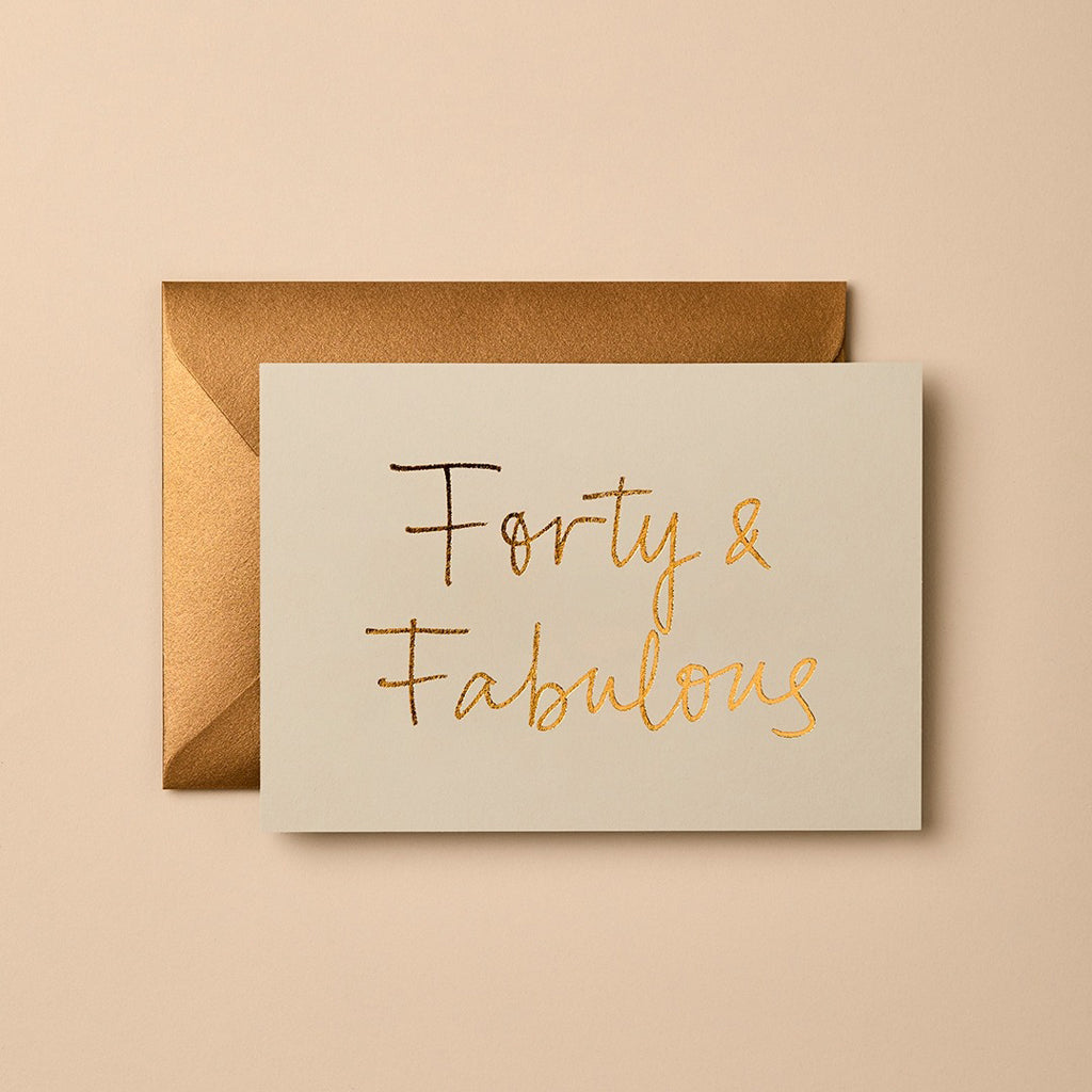 Luxury, gold foil Forty And Fabulous Birthday greeting card. Kind to the planet, heavy weight card stock with a blank interior. Matched with an antique gold envelope in a cello sleeve. Made in Australia