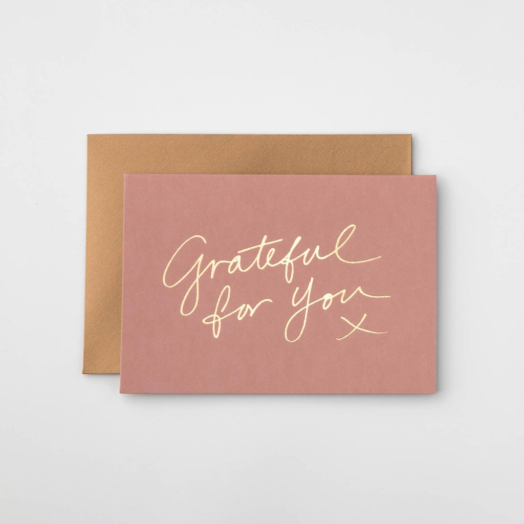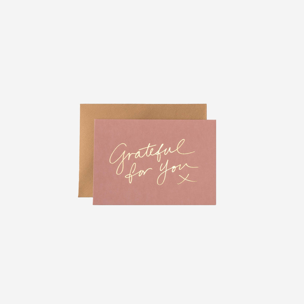 Luxury, gold foil Grateful For You greeting card. Kind to the planet, heavy weight card stock with a blank interior. Matched with an antique gold envelope in a cello sleeve. Made in Australia