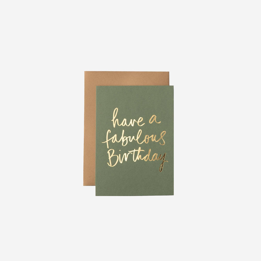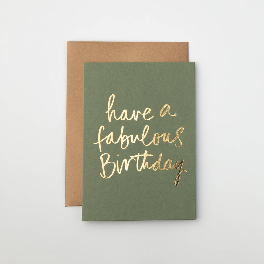 Luxury, gold foil Have A Fabulous Birthday greeting card. Kind to the planet, heavy weight card stock with a blank interior. Matched with an antique gold envelope in a cello sleeve. Made in Australia