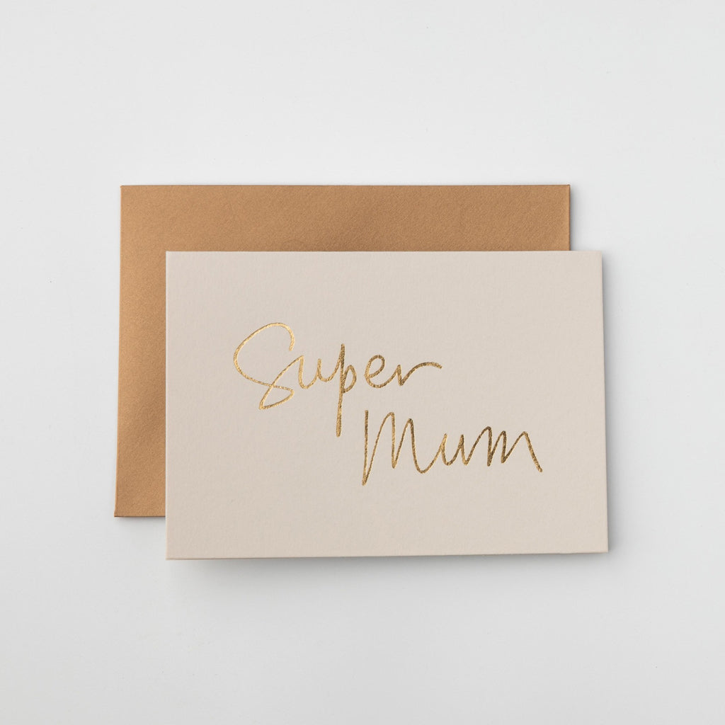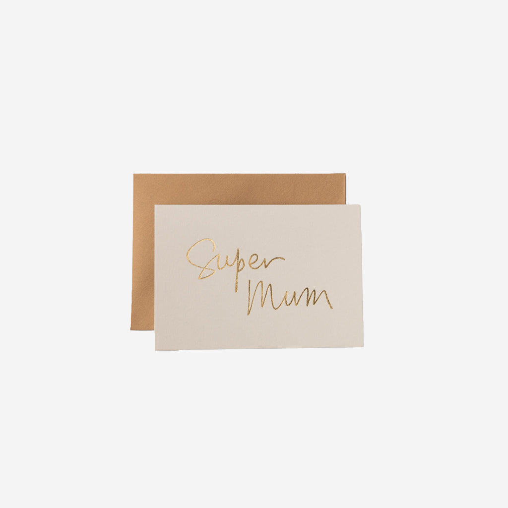 Luxury, gold foil Super Mum greeting card. Kind to the planet, heavy weight card stock with a blank interior. Matched with an antique gold envelope in a cello sleeve. Made in Australia