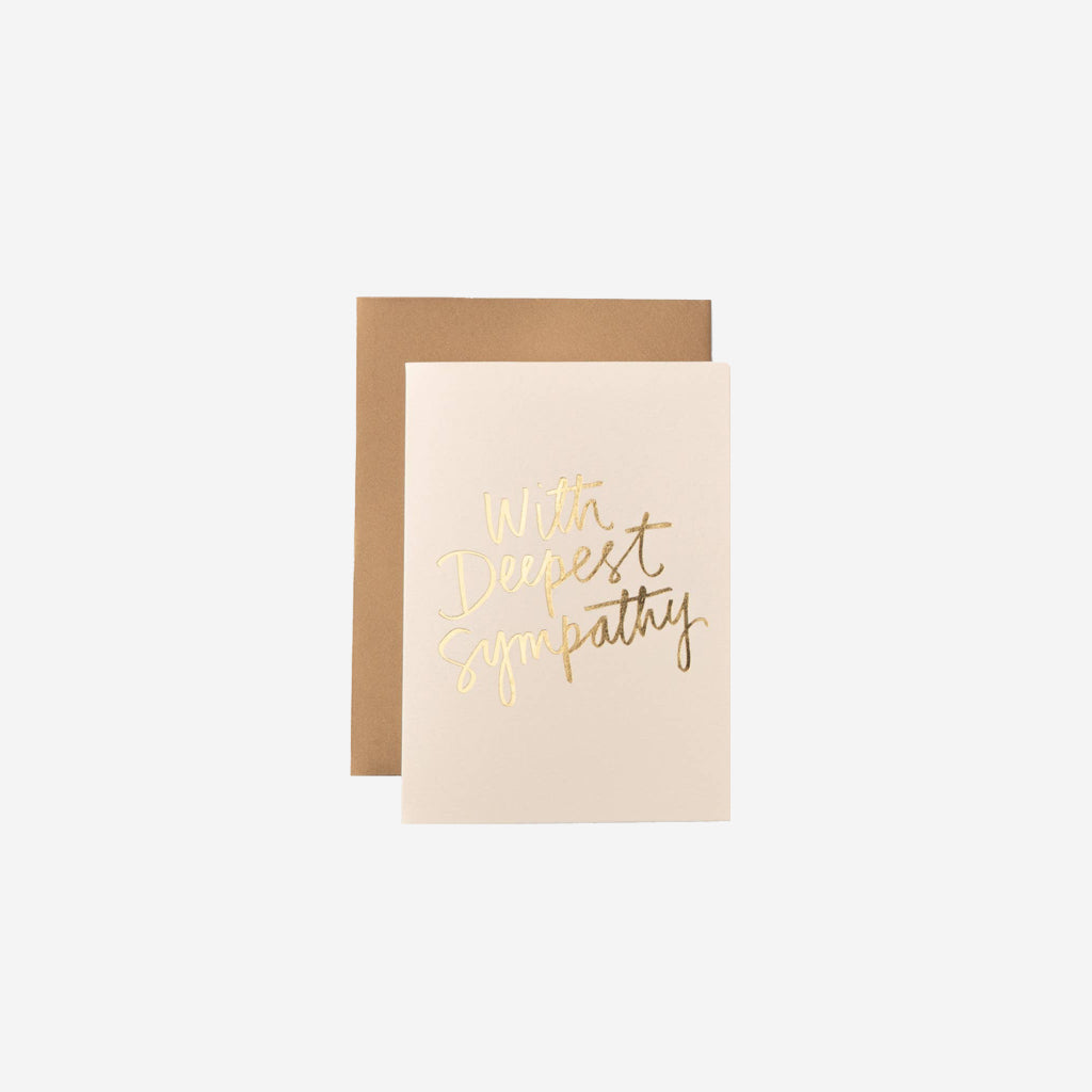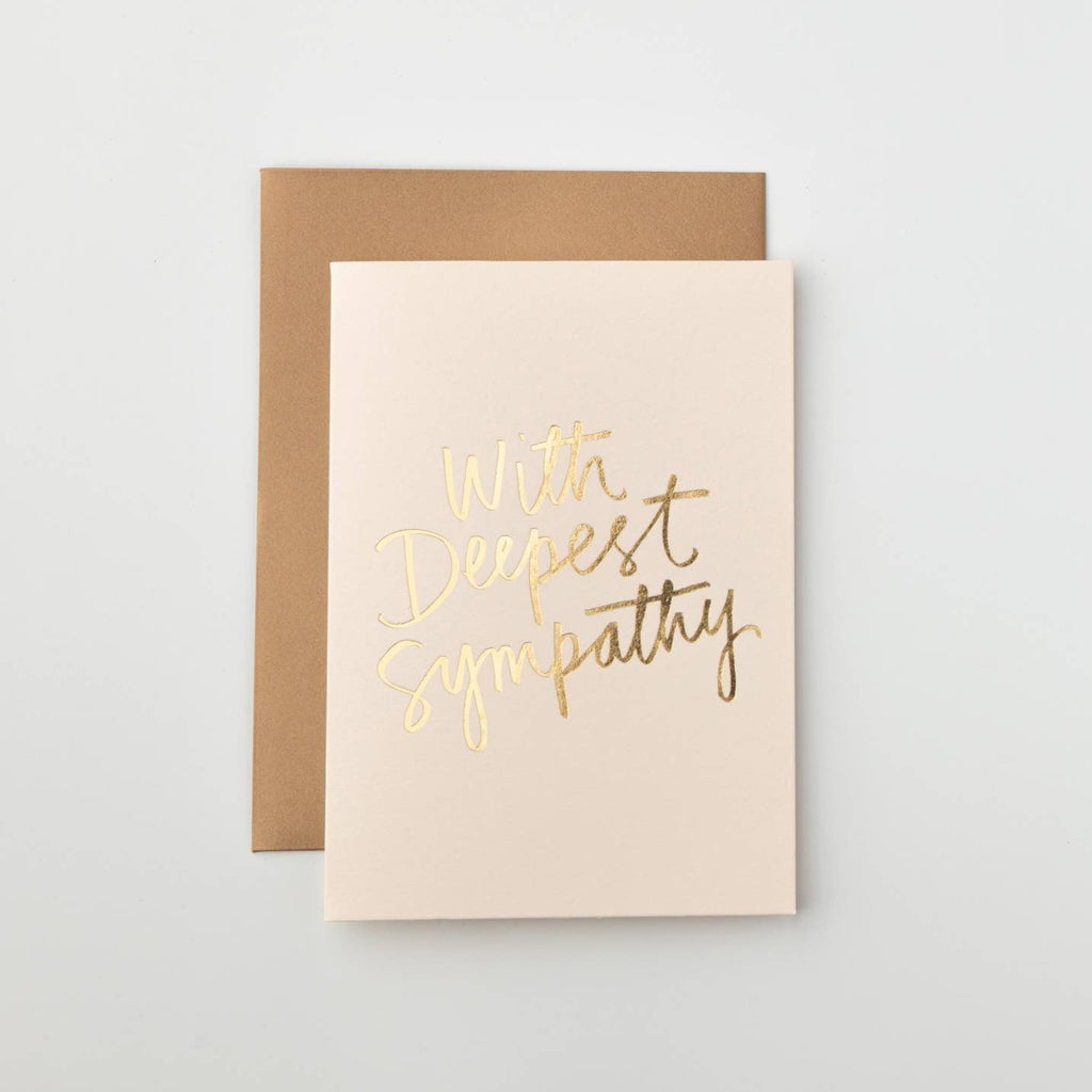 Luxury, gold foil With Deepest Sympathy greeting card. Kind to the planet, heavy weight card stock with a blank interior. Matched with an antique gold envelope in a cello sleeve. Made in Australia