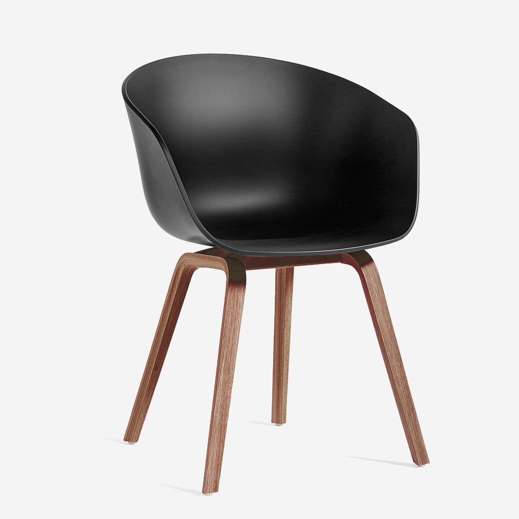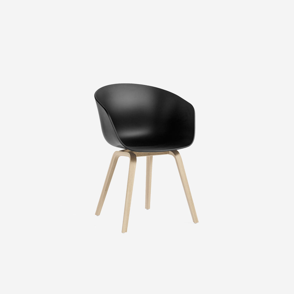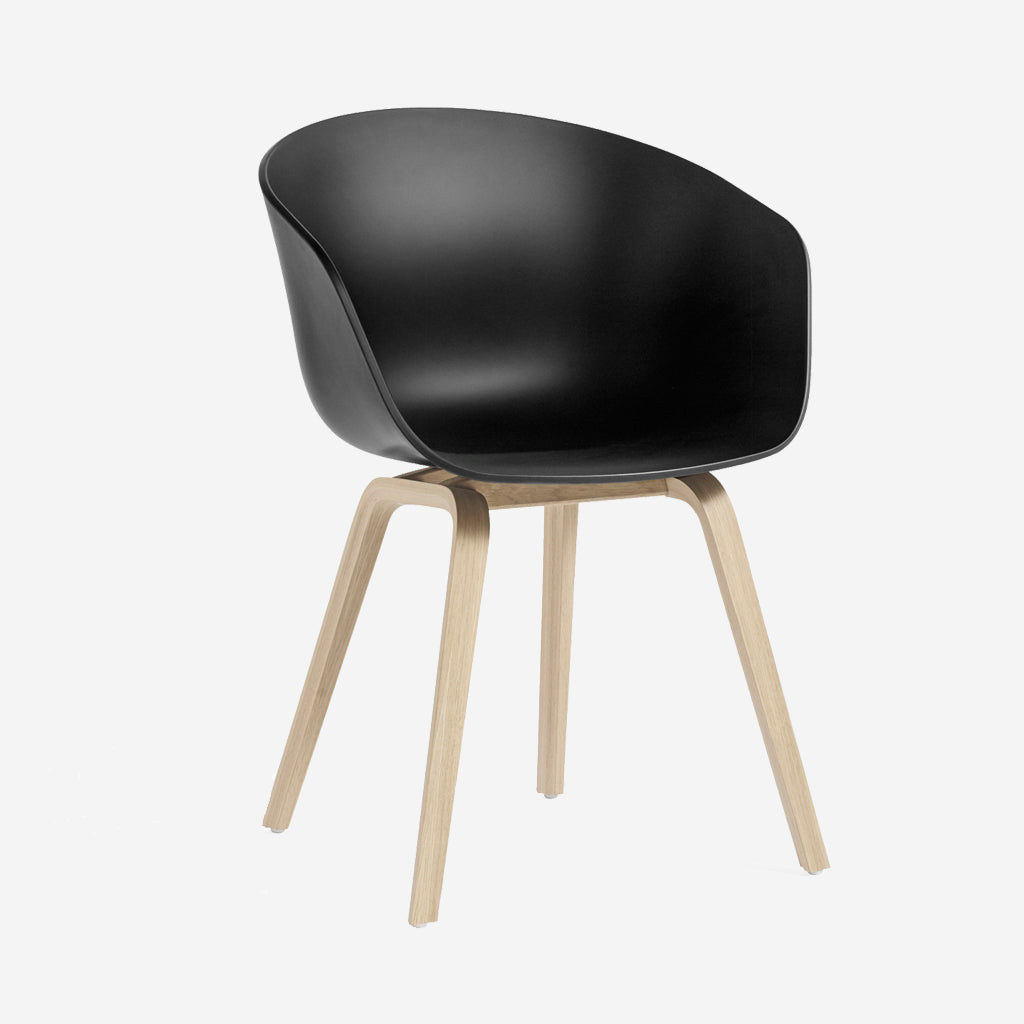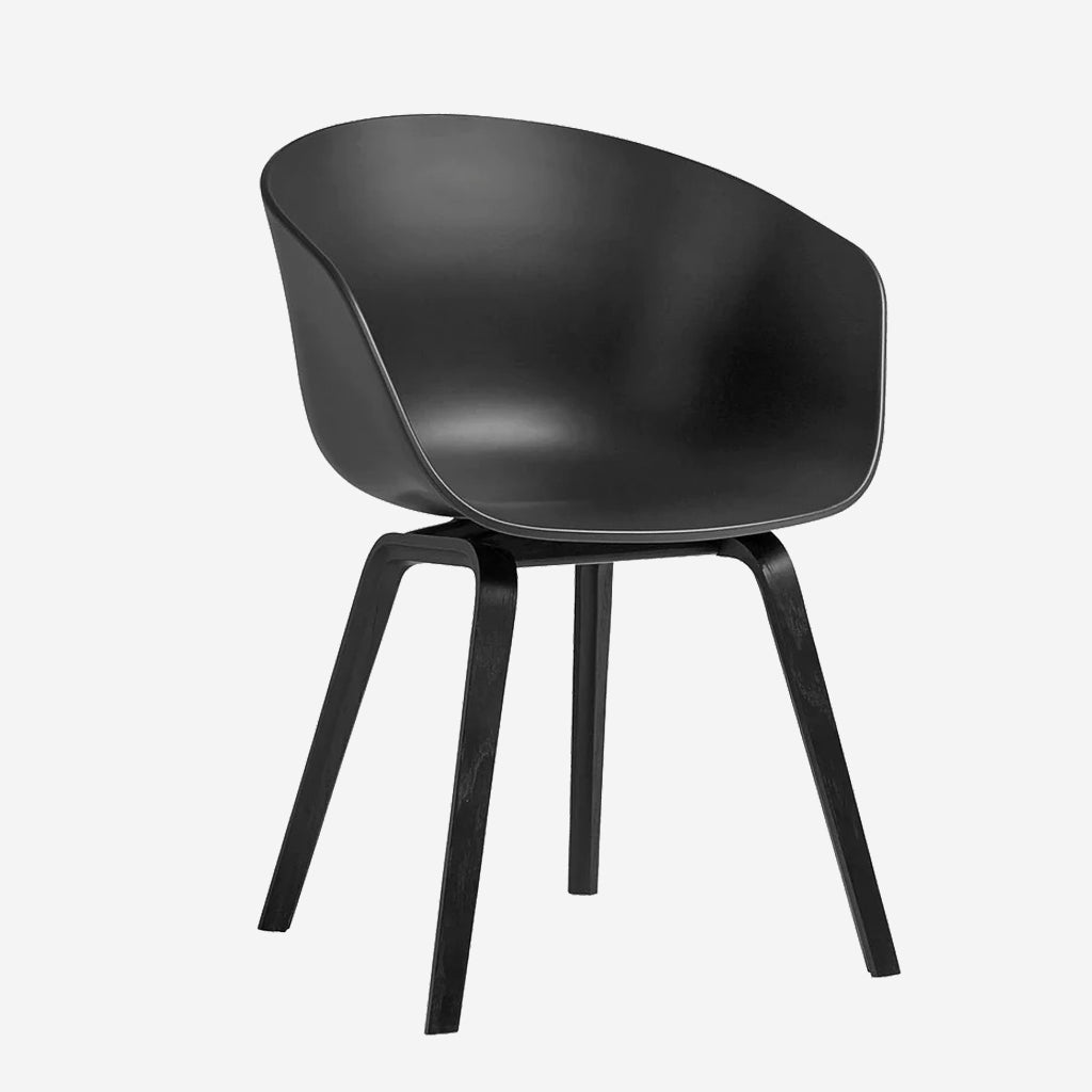 The Black About A Chair AAC22 design by HAY, exudes the functional simplicity that is characteristic of this entire series. The solid shell comprises a curved back with armrests in polypropylene, providing excellent comfort and a soft, unified silhouette, while the four-legged wooden base adds a timeless, classic expression, ensuring greater stability and a longer lifetime. The extensive range of colours, upholstery options and wood choices for the frame and legs offer the opportunity to create almost infinite design combinations.
