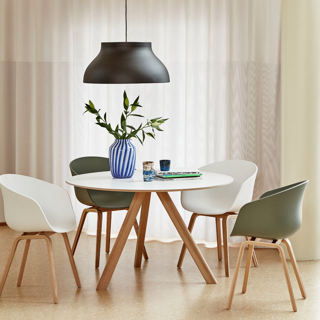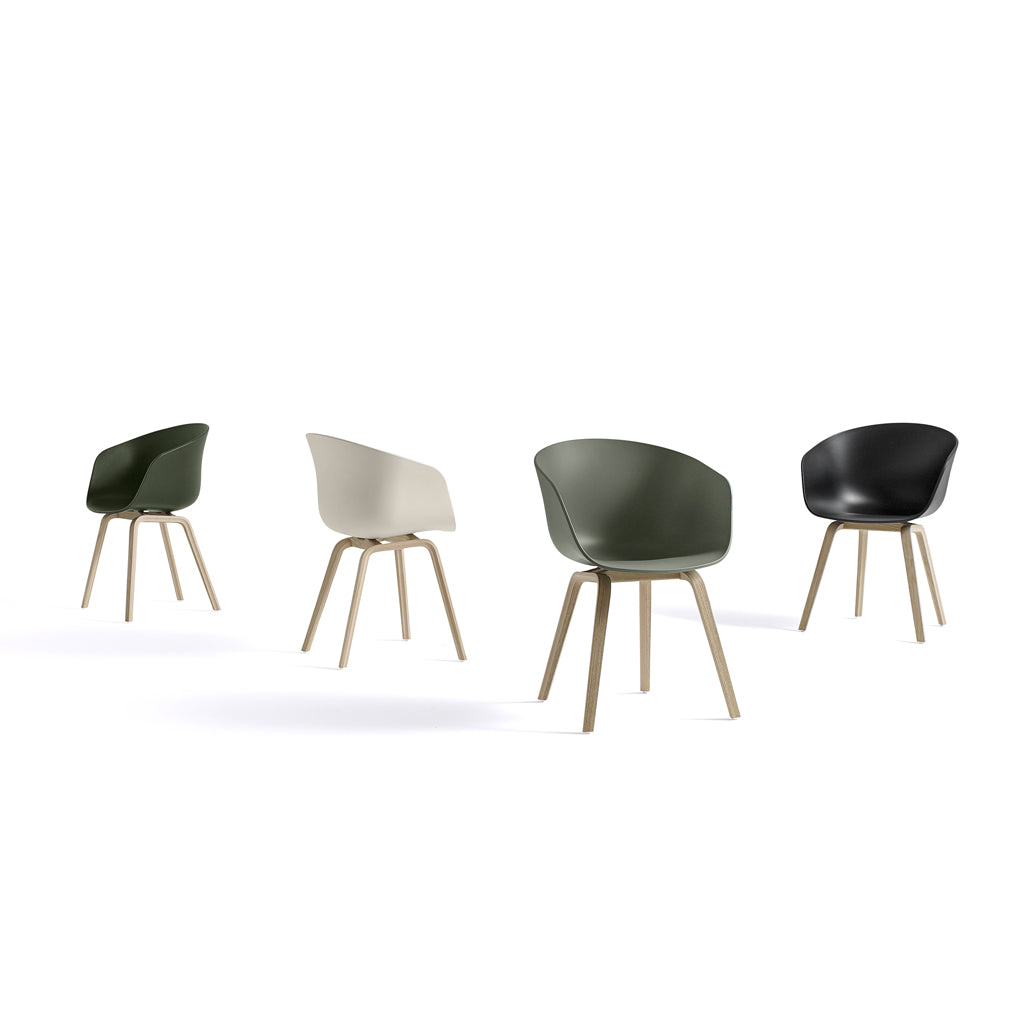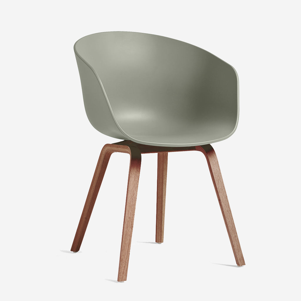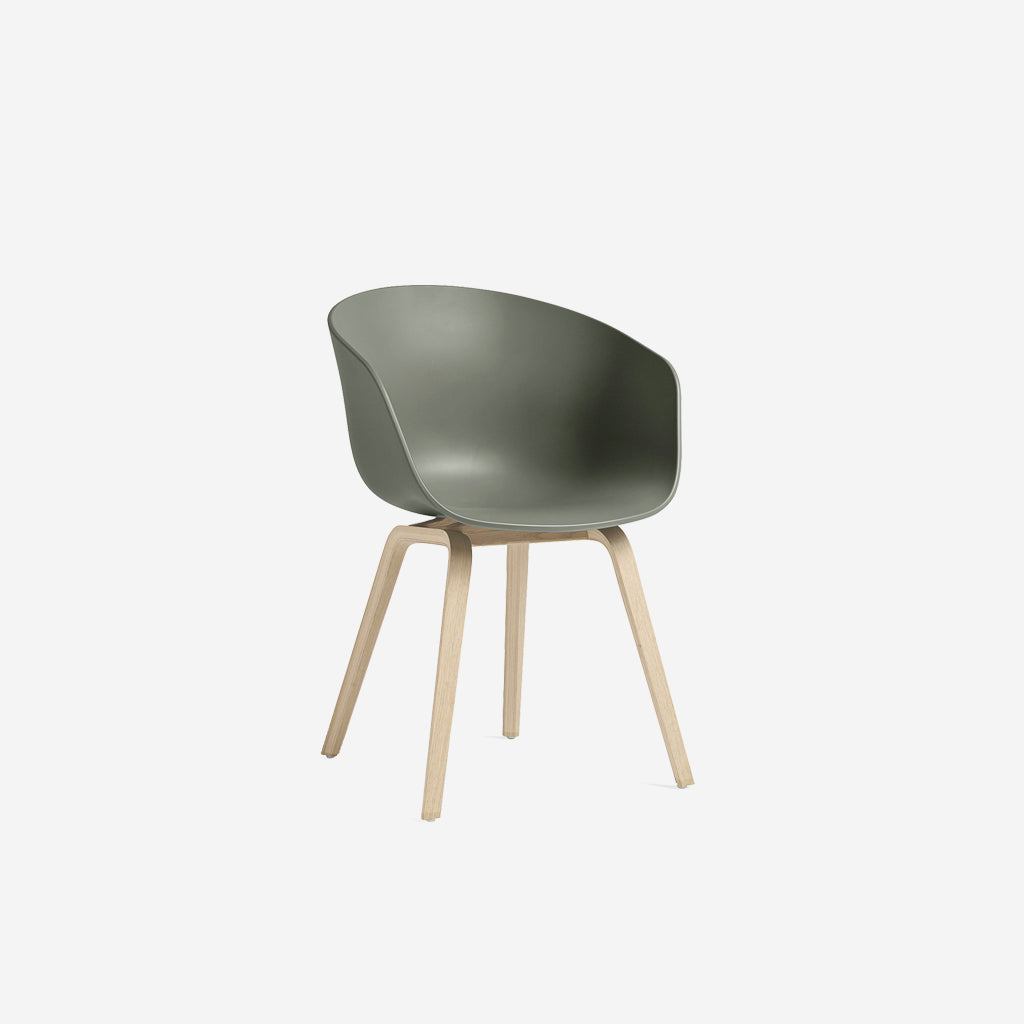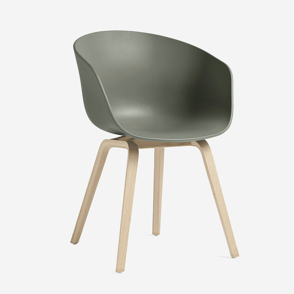 The Dusty Green About A Chair AAC22 design by HAY, exudes the functional simplicity that is characteristic of this entire series. The solid shell comprises a curved back with armrests in polypropylene, providing excellent comfort and a soft, unified silhouette, while the four-legged wooden base adds a timeless, classic expression, ensuring greater stability and a longer lifetime. The extensive range of colours, upholstery options and wood choices for the frame and legs offer the opportunity to create almost infinite design combinations.