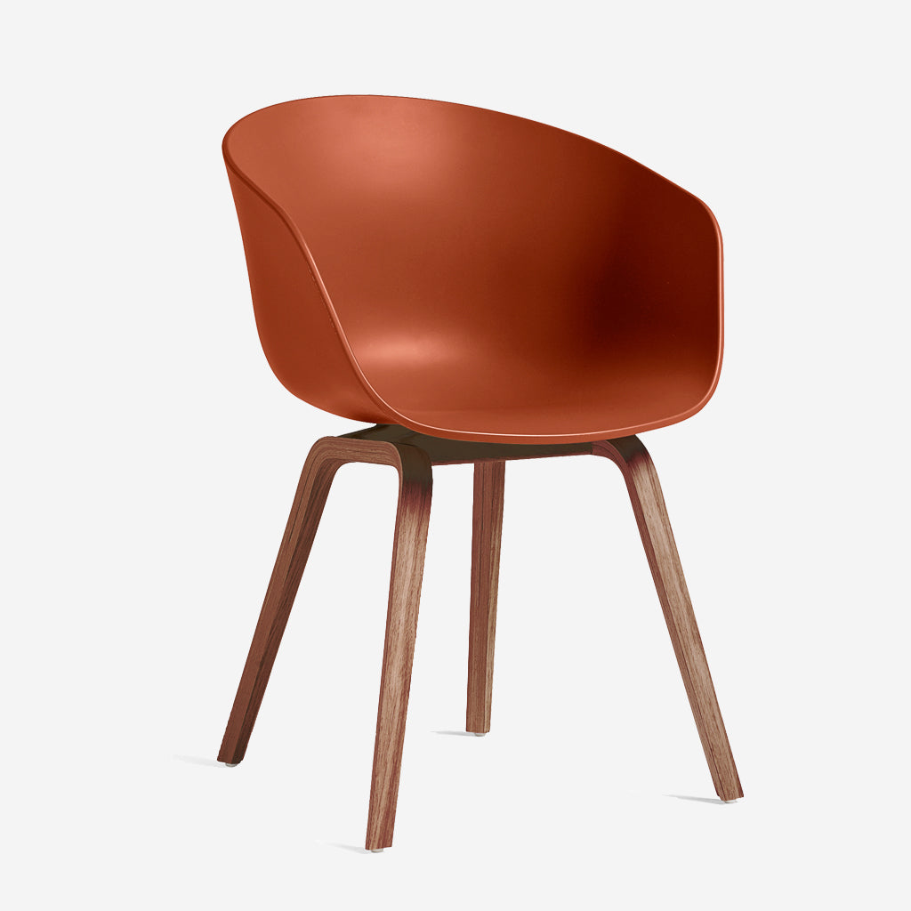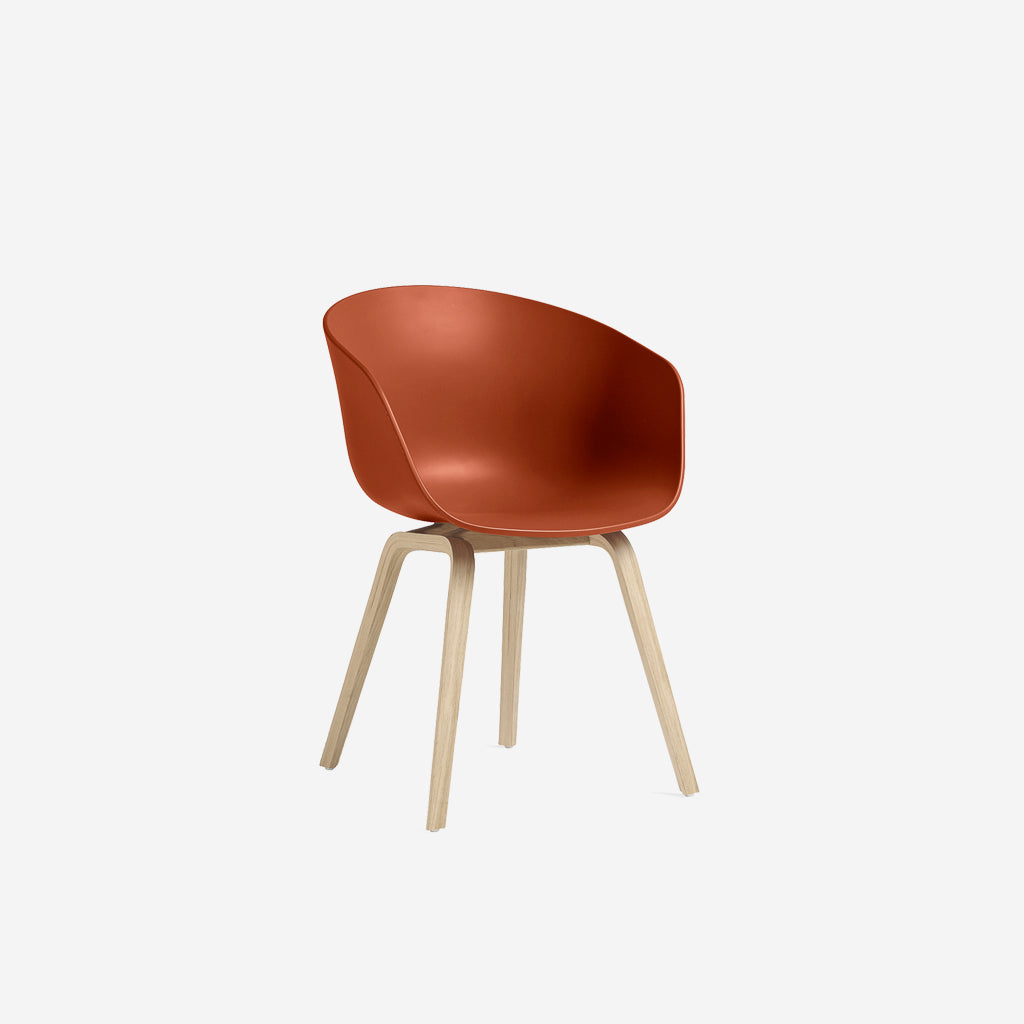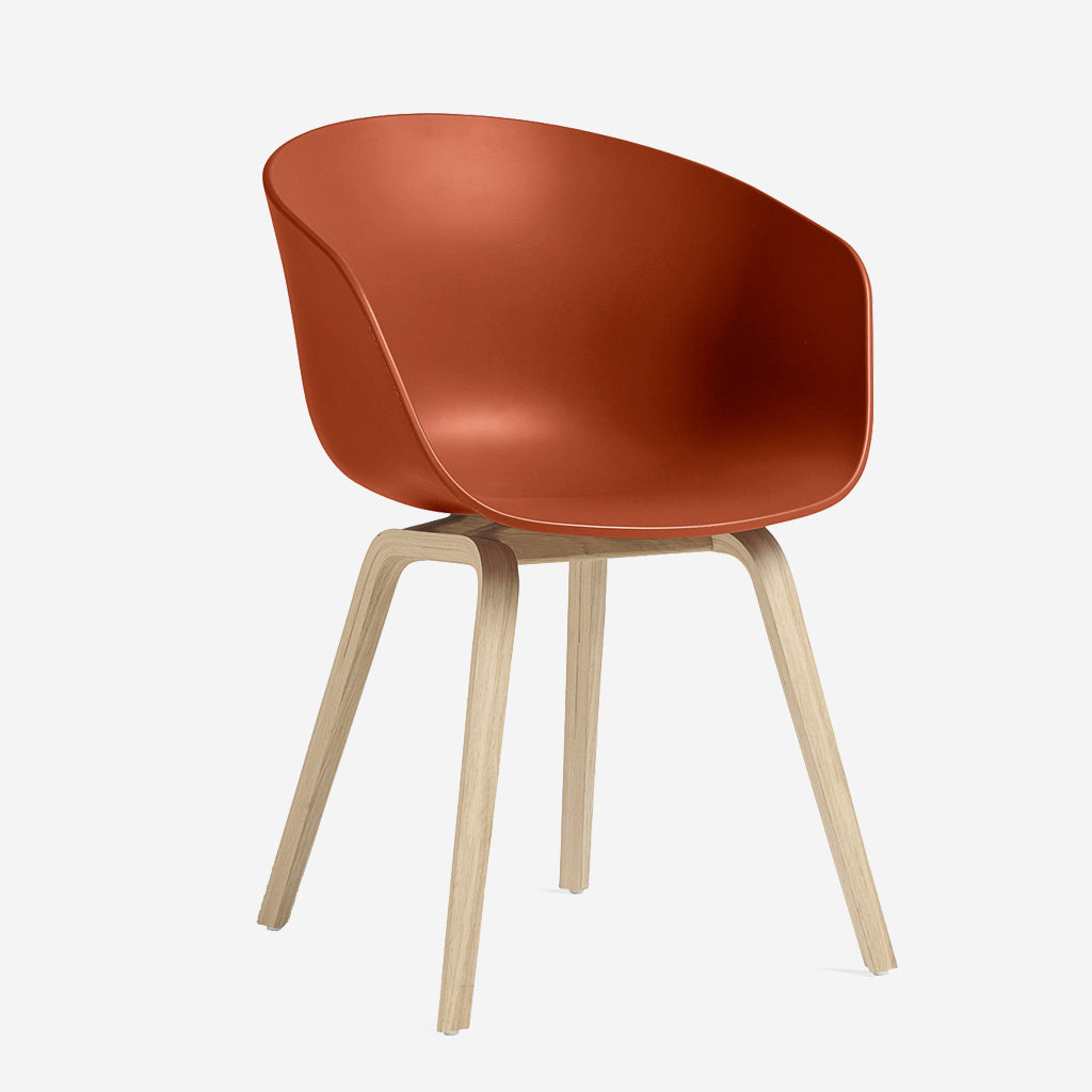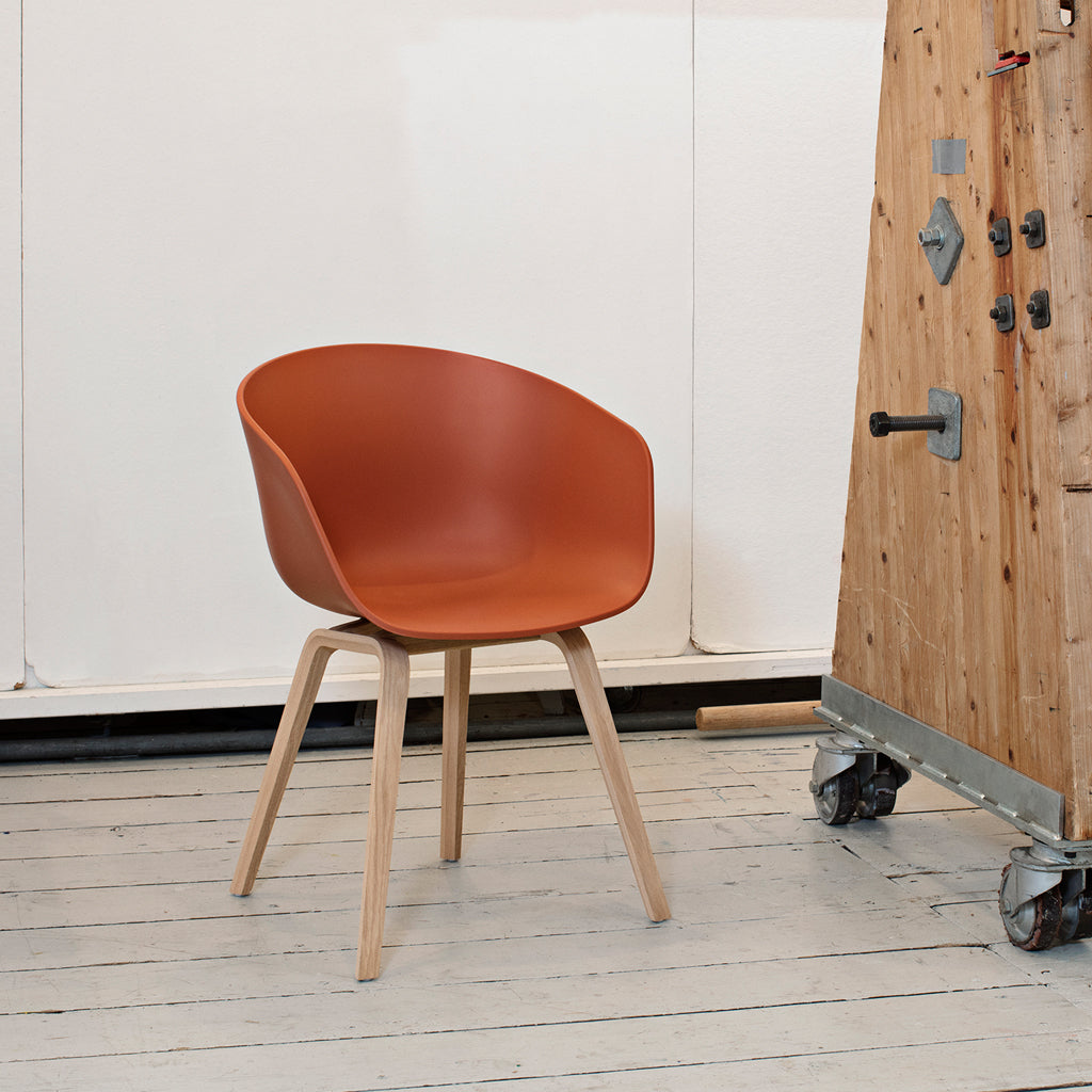 The Orange About A Chair AAC22 design by HAY, exudes the functional simplicity that is characteristic of this entire series. The solid shell comprises a curved back with armrests in polypropylene, providing excellent comfort and a soft, unified silhouette, while the four-legged wooden base adds a timeless, classic expression, ensuring greater stability and a longer lifetime. The extensive range of colours, upholstery options and wood choices for the frame and legs offer the opportunity to create almost infinite design combinations.