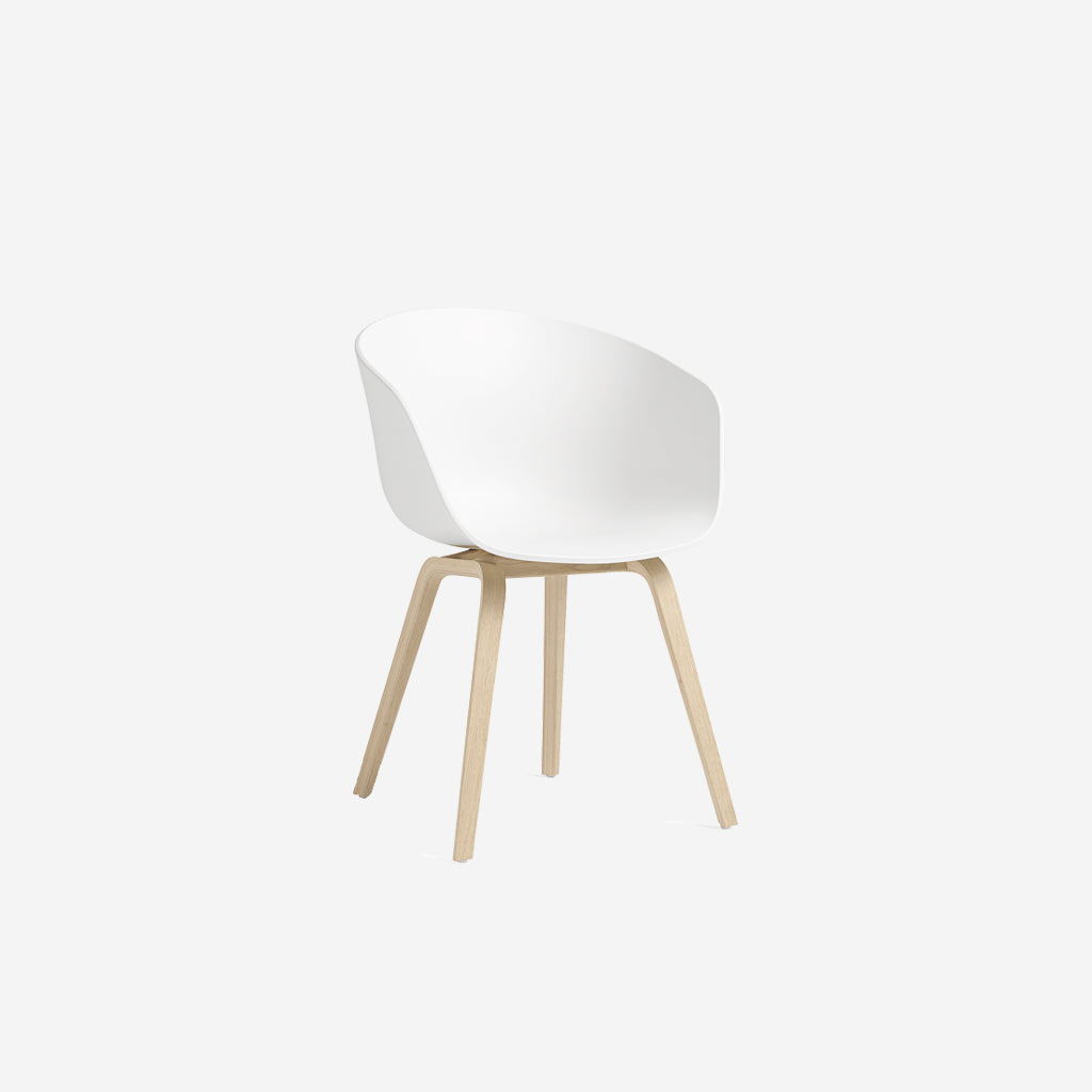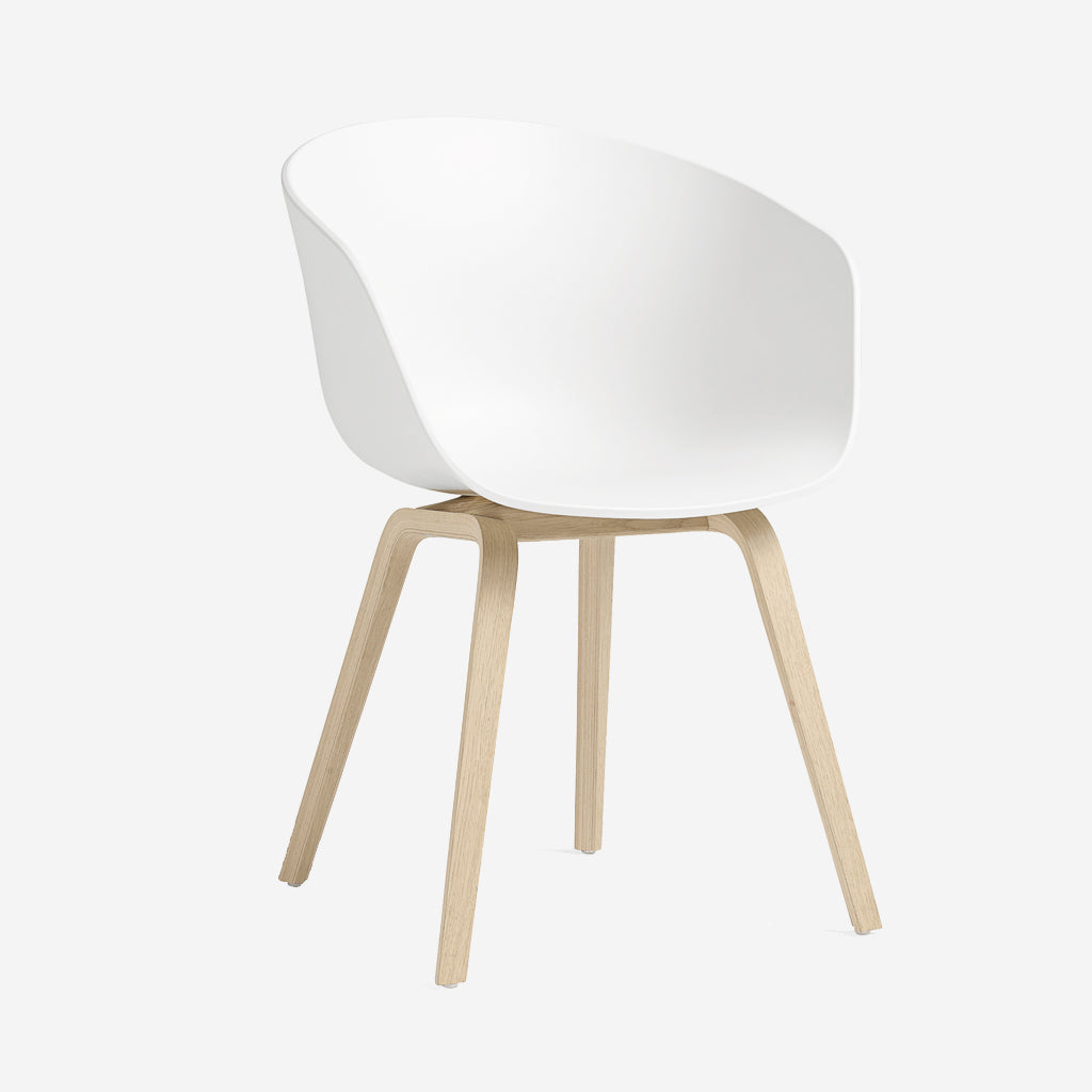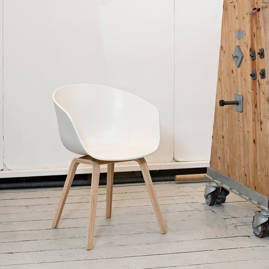 The White About A Chair AAC22 design by HAY, exudes the functional simplicity that is characteristic of this entire series. The solid shell comprises a curved back with armrests in polypropylene, providing excellent comfort and a soft, unified silhouette, while the four-legged wooden base adds a timeless, classic expression, ensuring greater stability and a longer lifetime. The extensive range of colours, upholstery options and wood choices for the frame and legs offer the opportunity to create almost infinite design combinations.