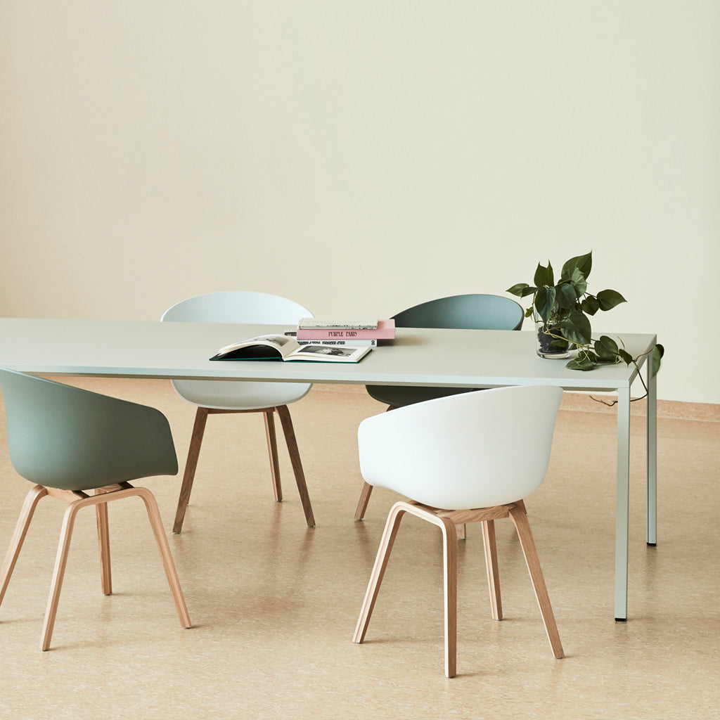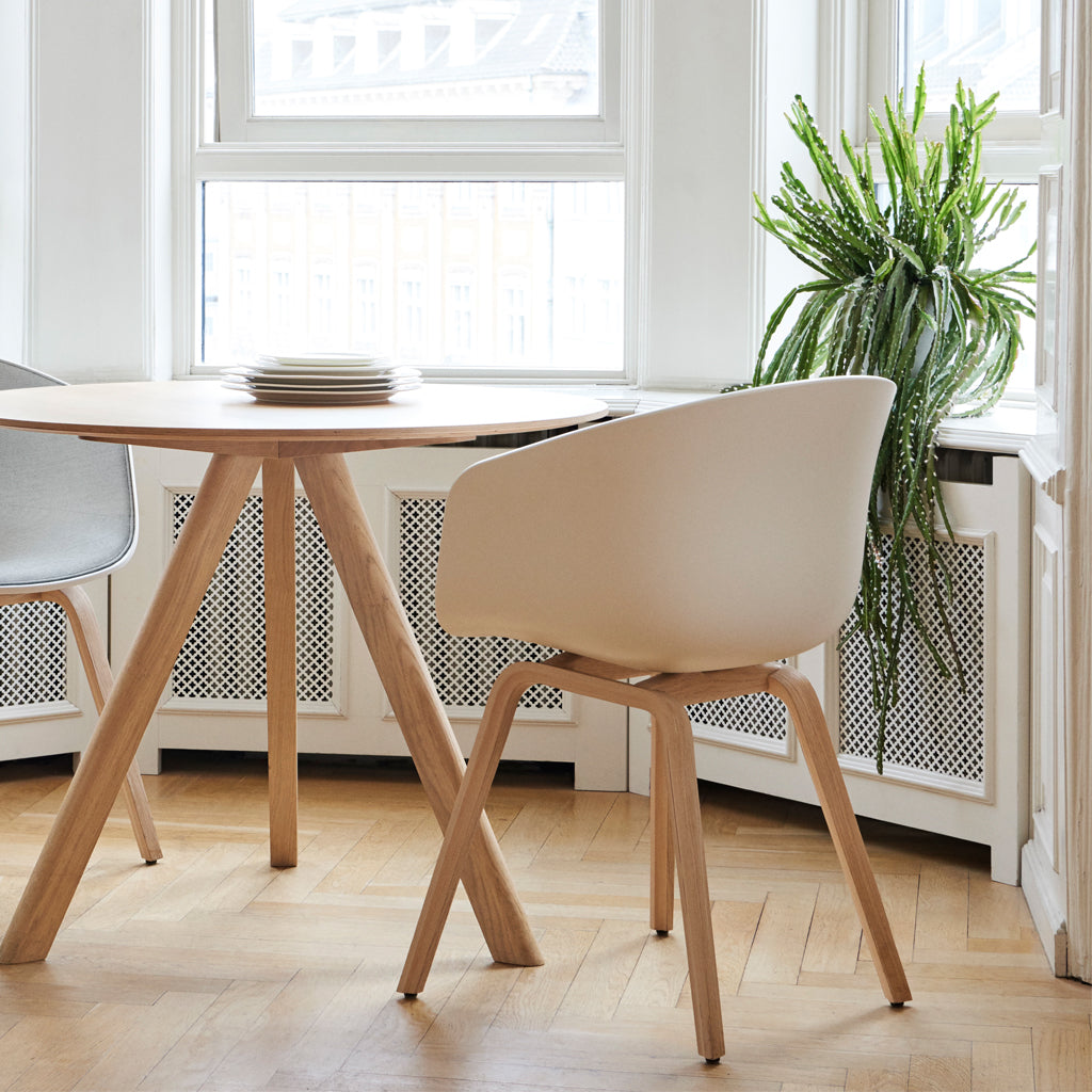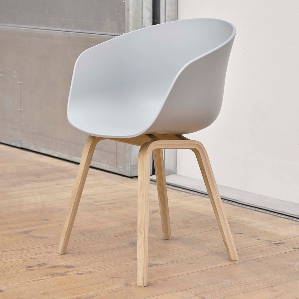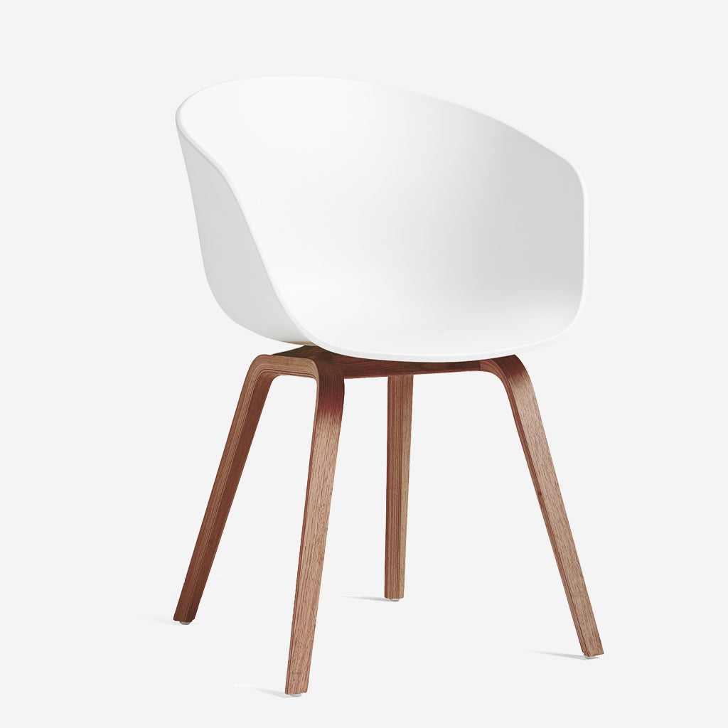 The White About A Chair AAC22 design by HAY, exudes the functional simplicity that is characteristic of this entire series. The solid shell comprises a curved back with armrests in polypropylene, providing excellent comfort and a soft, unified silhouette, while the four-legged wooden base adds a timeless, classic expression, ensuring greater stability and a longer lifetime. The extensive range of colours, upholstery options and wood choices for the frame and legs offer the opportunity to create almost infinite design combinations.