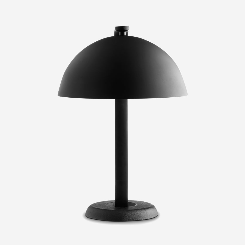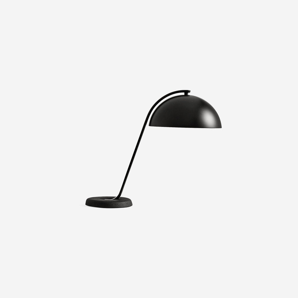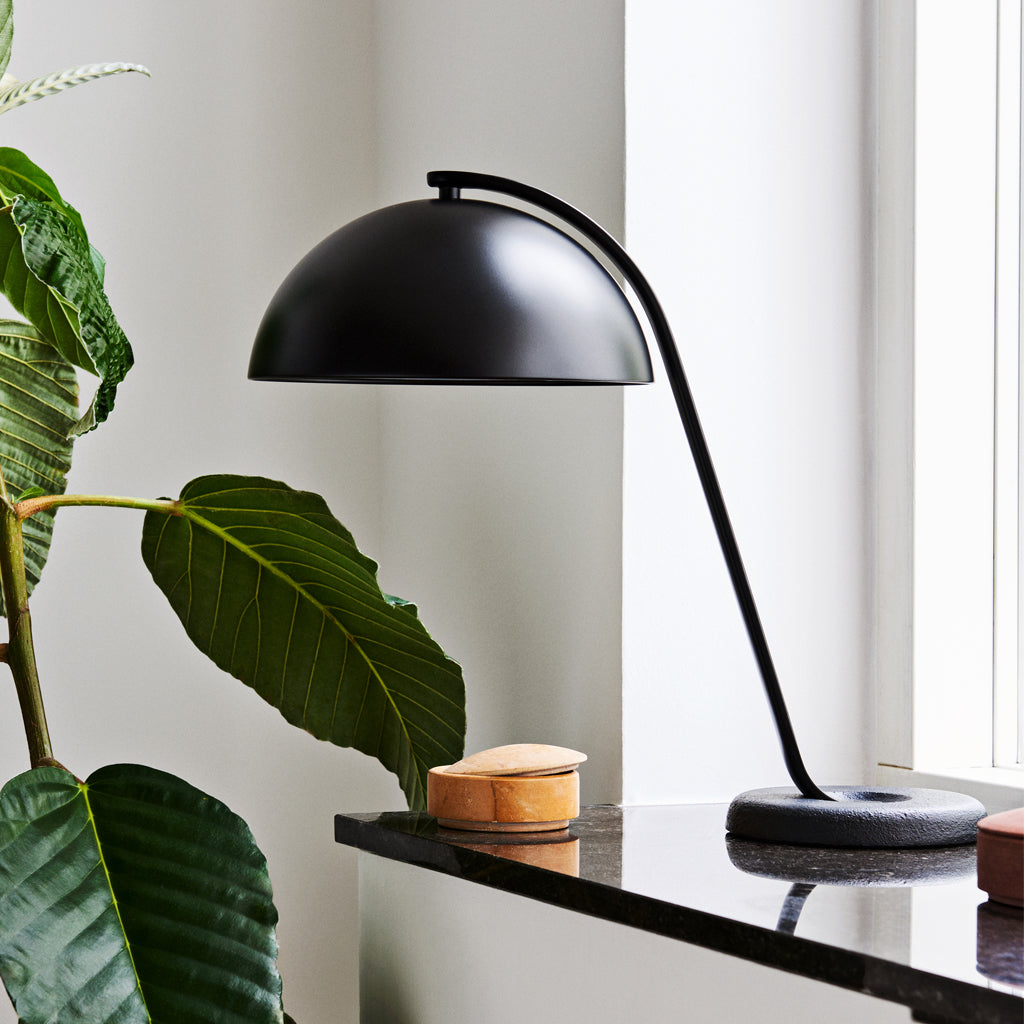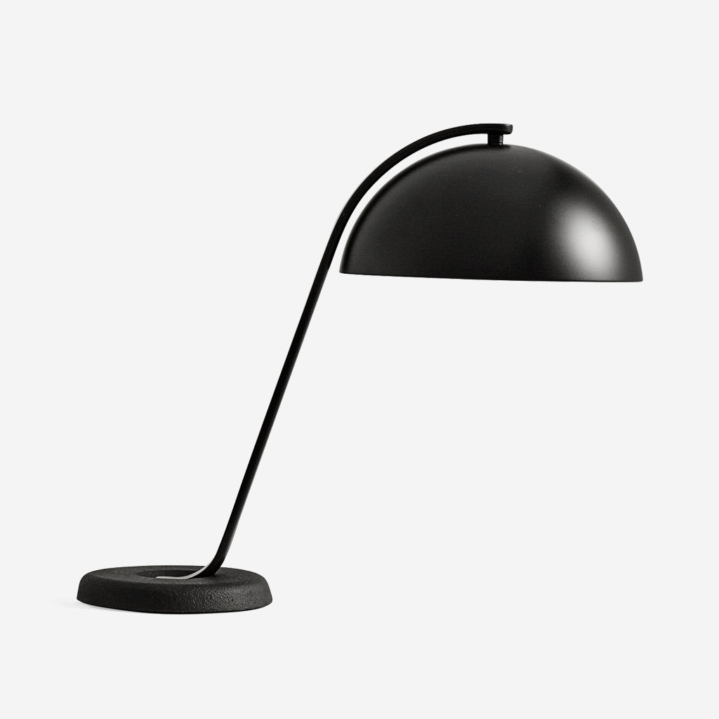 Cloche Table Lamp plays with visual imbalance to create a distinct shape. It features a domed shade, an angled, powder-coated aluminium arm, and an off-centre, cast-iron base. The shade creates a decorative and directional lighting solution for a variety of office and home settings.