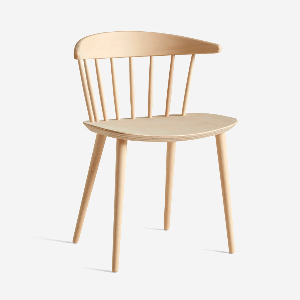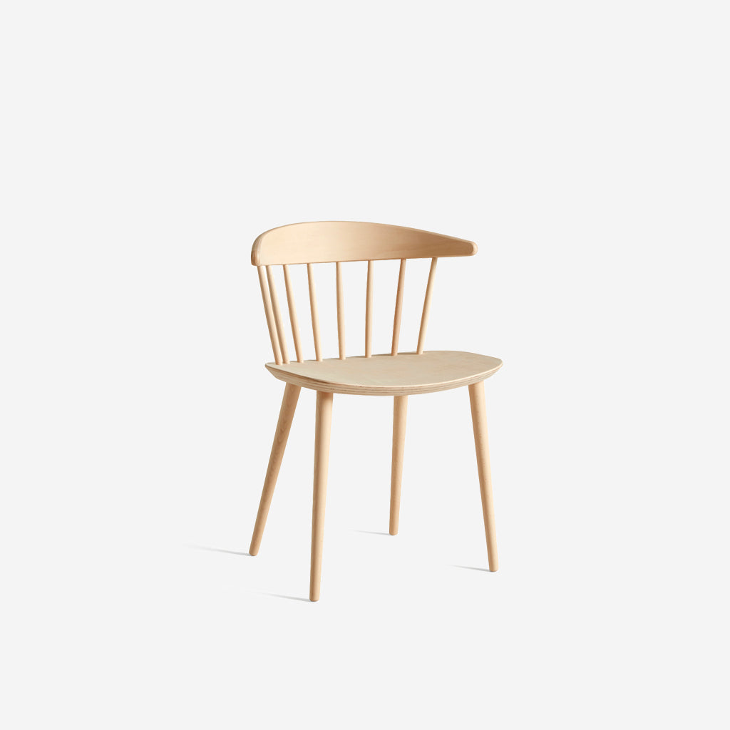 With its wide back and seat combined with the light, vertical graphic expression, J104 resembles a cross between a dining chair and an easy chair. In this unique composition, although the broad seat takes up visual space, the spindle structure of the back lightens the overall impression and makes J104 a sculptural classic.