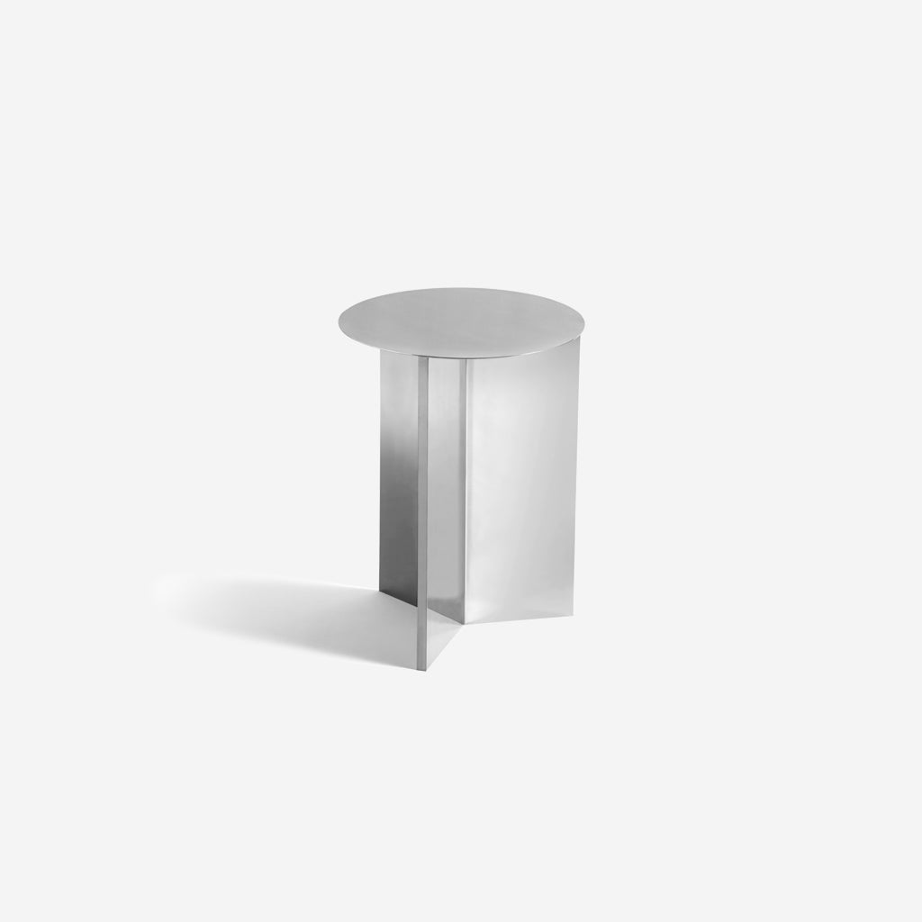 The Slit Table is a successful translation of paper origami crossing over into the metal universe. The name comes from the moment that a slit is produced when the plate frame is folded beneath the tabletop.