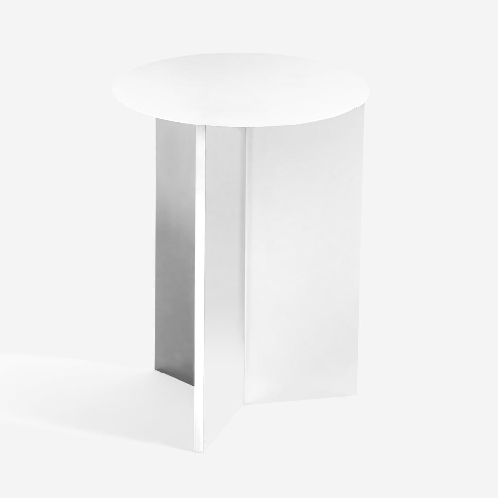 The Slit Table is a successful translation of paper origami crossing over into the metal universe. The name comes from the moment that a slit is produced when the plate frame is folded beneath the tabletop.