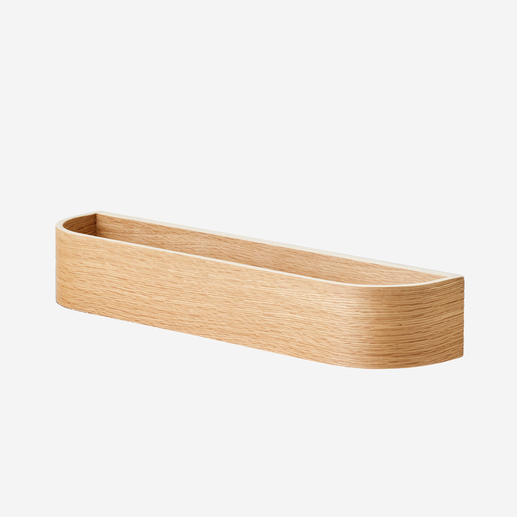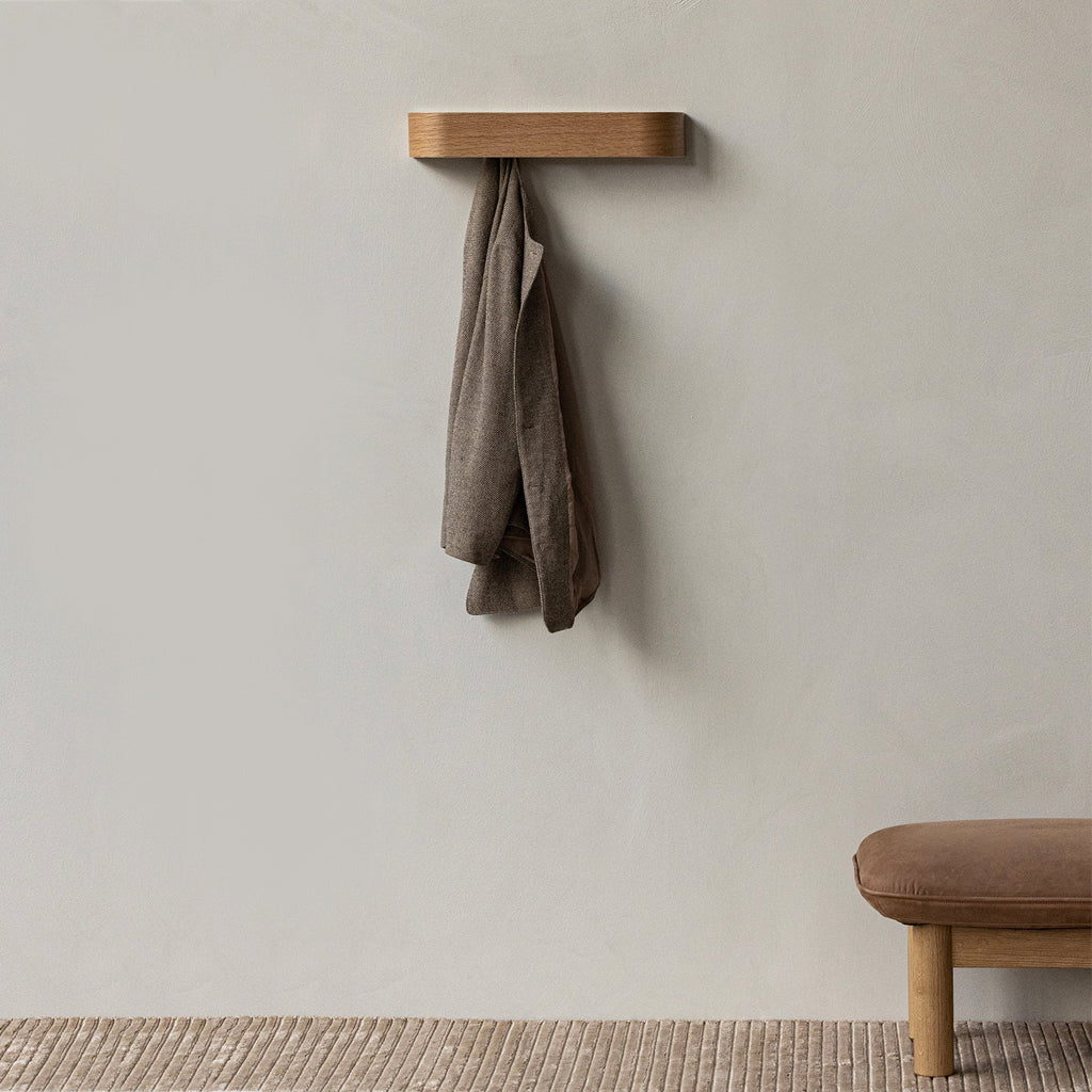 With its careful combination of gently rounded edges, warm wood and discreet functionality, the Epoch Clothes Rack offers streamlined storage for spaces large and small. Designed for Audo by Nina Bruun and crafted in natural or dark stained oak, the wall-mounted rack features hidden clothing hooks, and the space-saving design can be suspended alone or in rows of multiples.