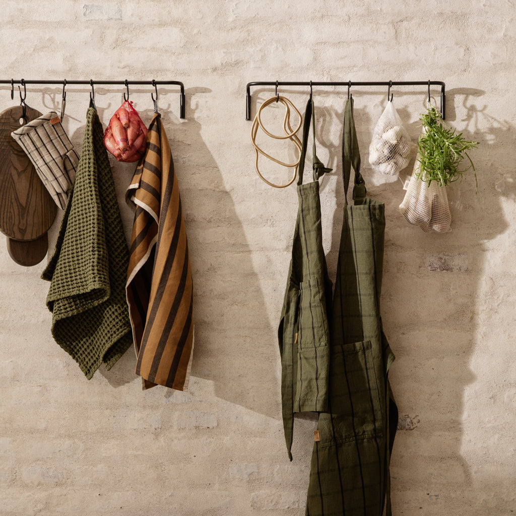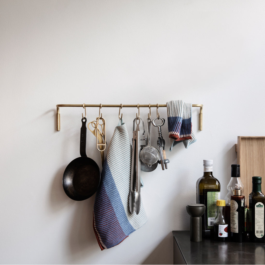 A light and beautiful storage solution for your kitchen tools and textiles, the kitchen rod lets you clear the table easily. Use it with the hooks to make room for more – use one of the hooks for decorations or memorabilia to mix up the expression of your rod. The kitchen rod is made of metal with a black coating and comes with six hooks.