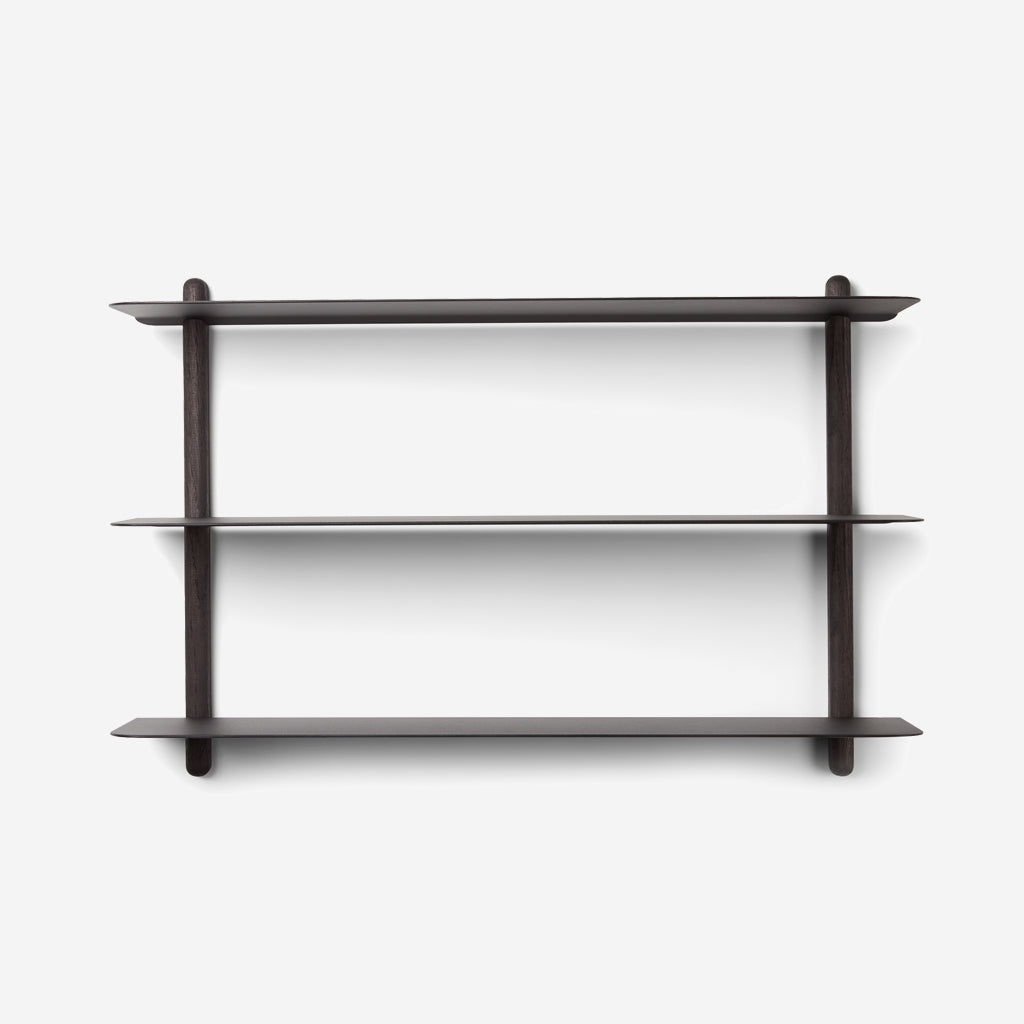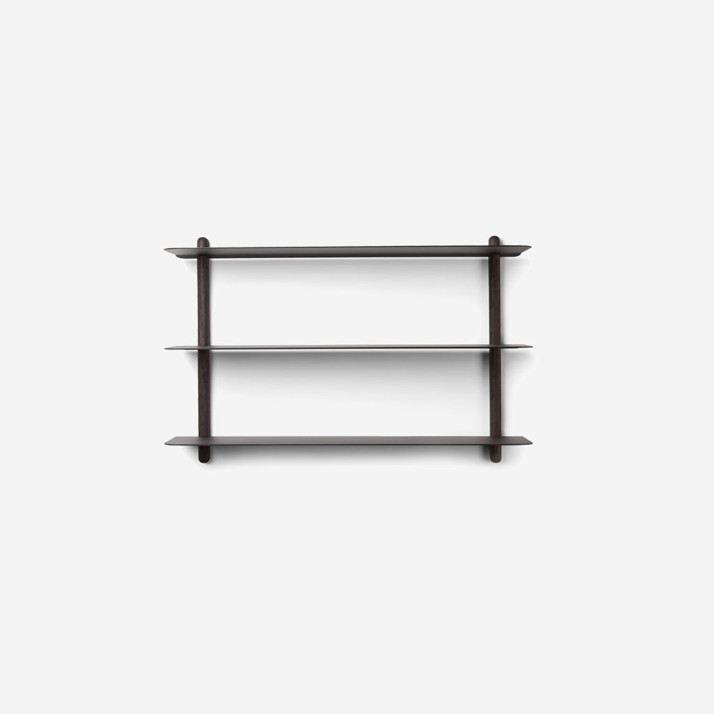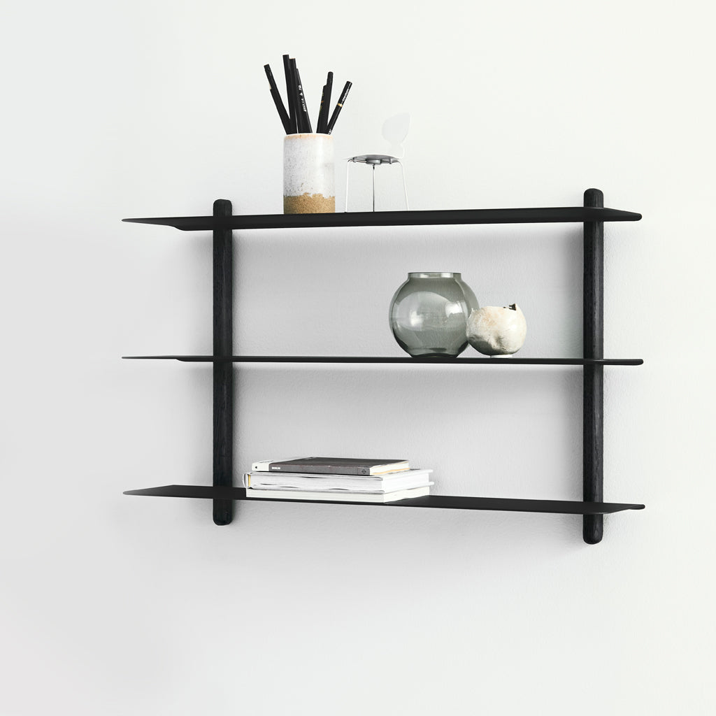 With its nordic expression, Nivo is subtle in its appearance and convincing in its simplicity. Nivo is a minimalistic wall shelf designed with no unnecessary details and only clean lines, hanging lightly and elegantly on the wall. Every component has been carefully thought out both in terms of design, form and function. There are no visible screws and the shelves are smoothly plugged in to the wooden poles, that have slits made exactly to fit.