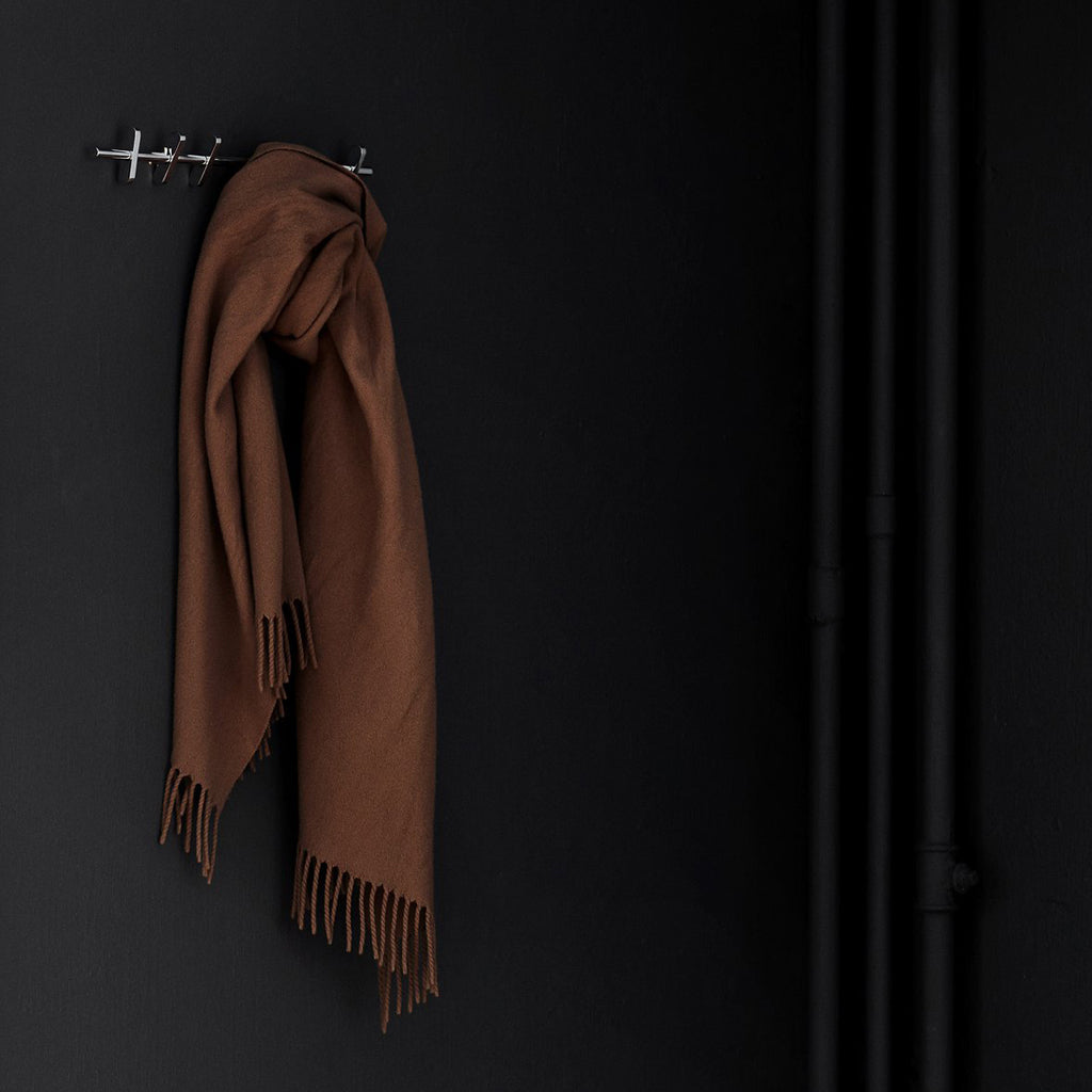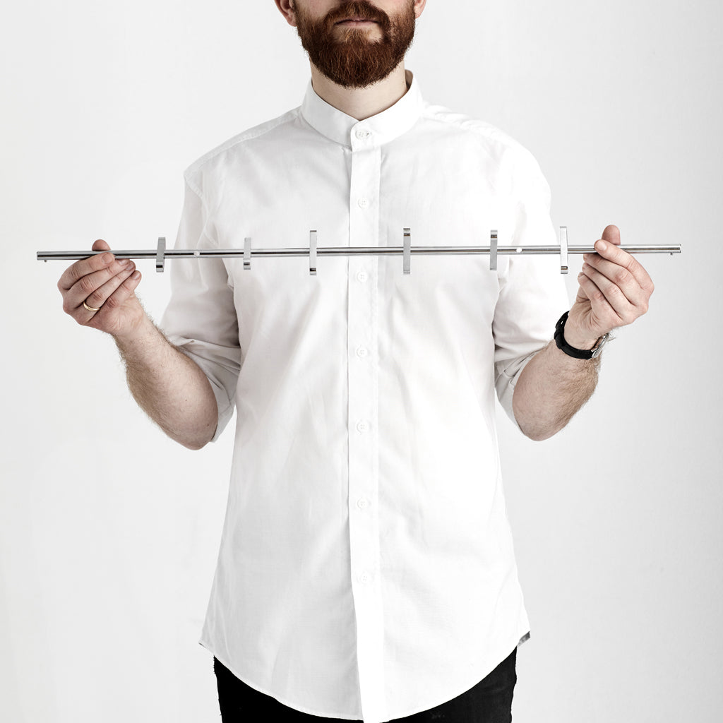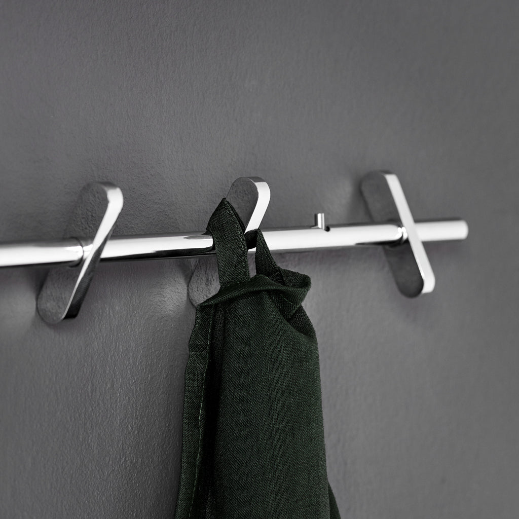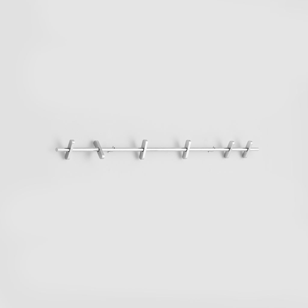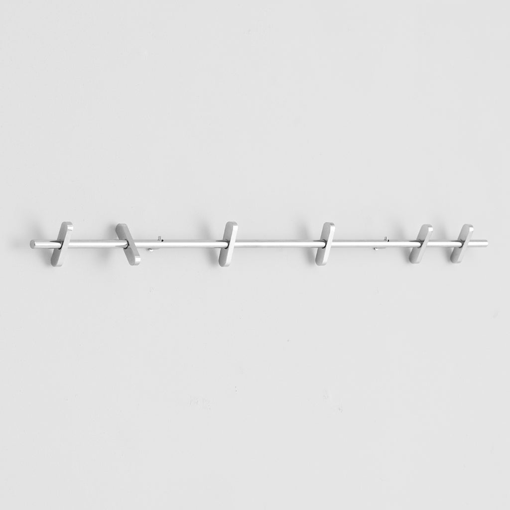 Coat Rack consists of a single metal rod and 4-6 pegs. The pegs simply slide on to the rod, and are loose in fitting, allowing the pegs to be moved around as needed. The rod itself is attached to the wall by way of sliding it over 2 L hooks. The detail of how that connection works is what holds the rod in place.