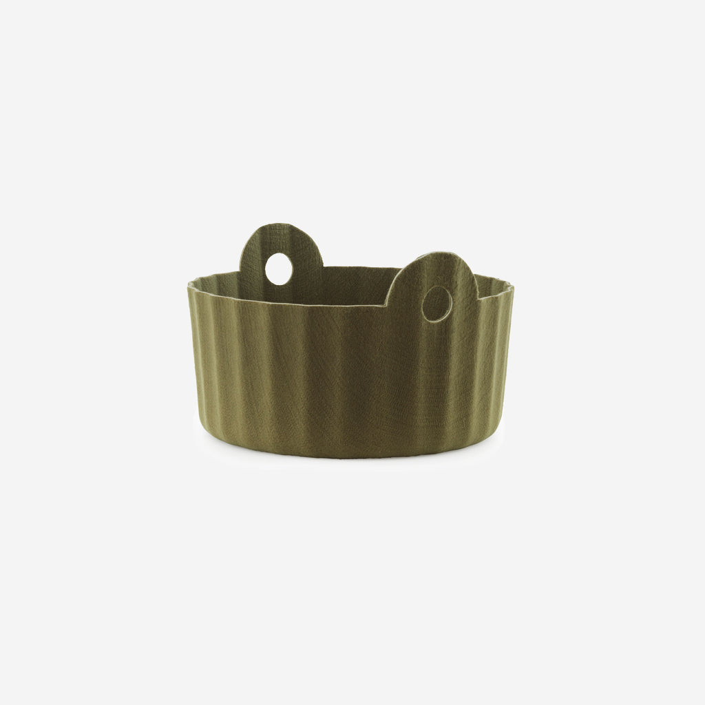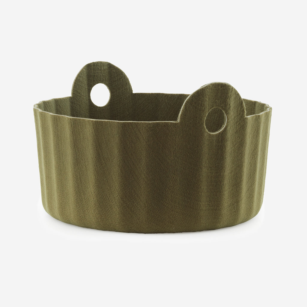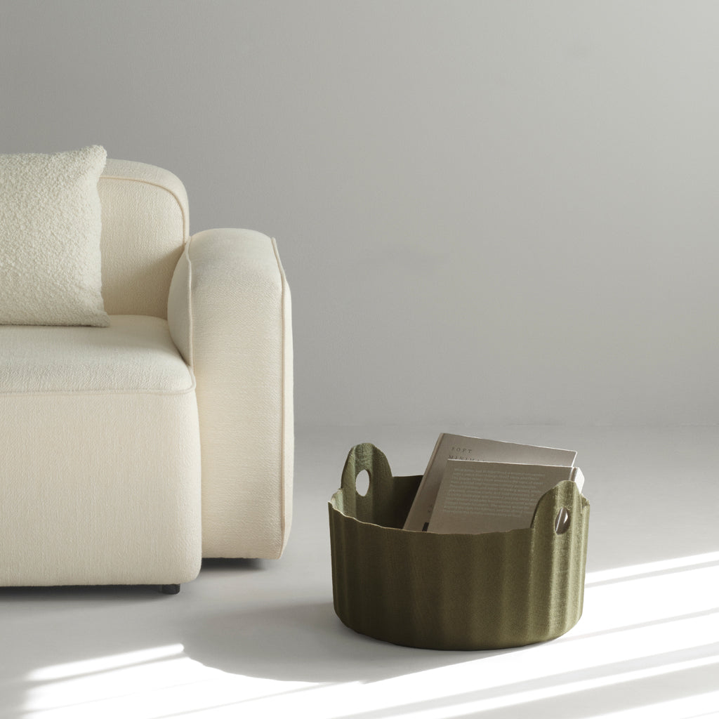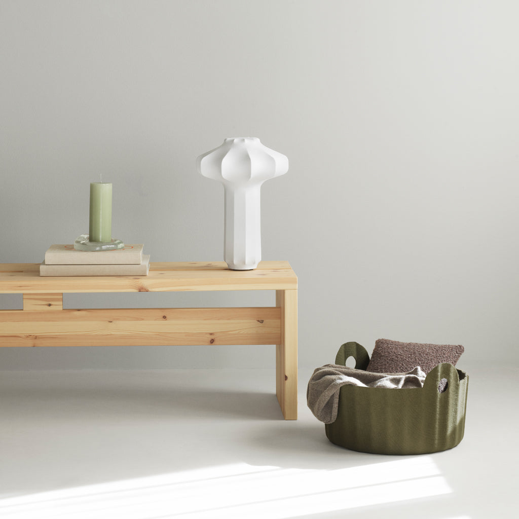 Colu Basket combines a contemporary aesthetic with practical functionality, crafted from recycled PET felt – a soft yet durable material derived from discarded post-consumer plastic bottles. Inspired by the timeless elegance of Roman columns, Baptiste Vandaele translates classical architecture into a modern storage solution. The basket’s distinctive, rhythmic repetition of hollowed arches flow seamlessly into integrated handles, embodying the designer’s core philosophy of ‘form follows function.’
