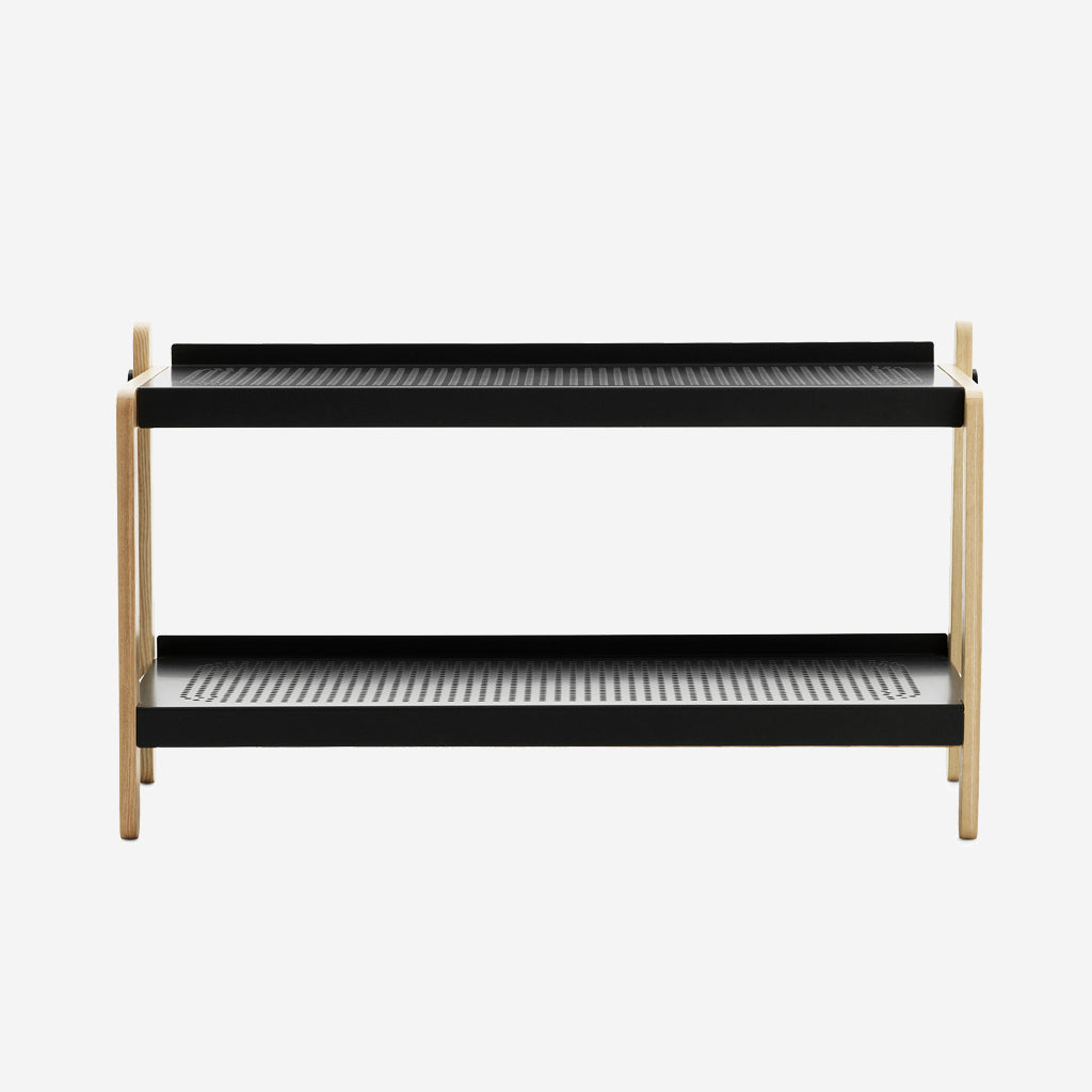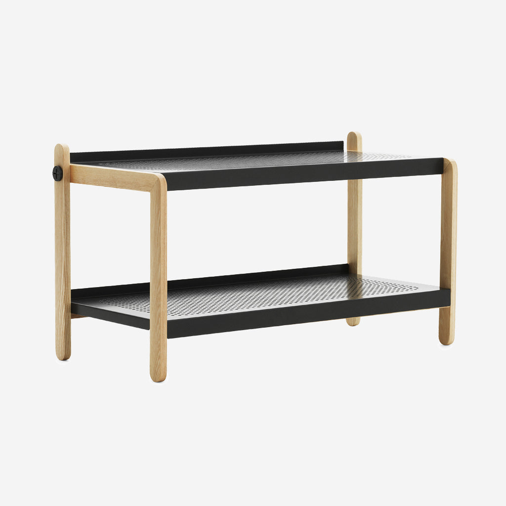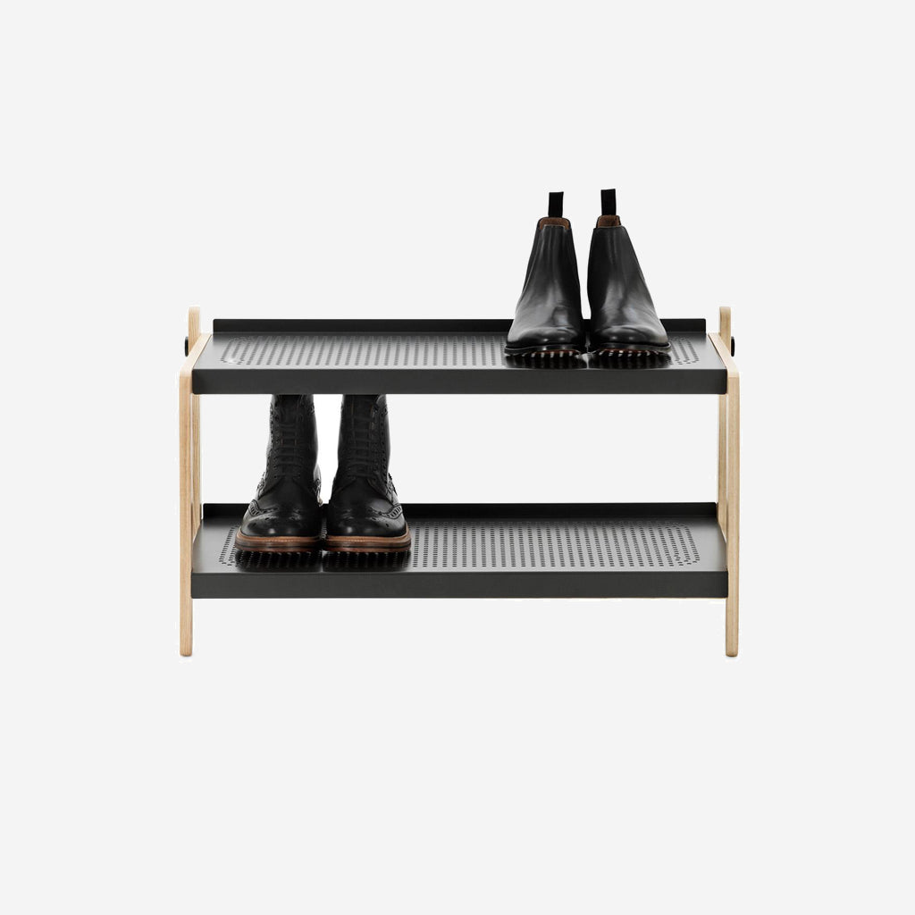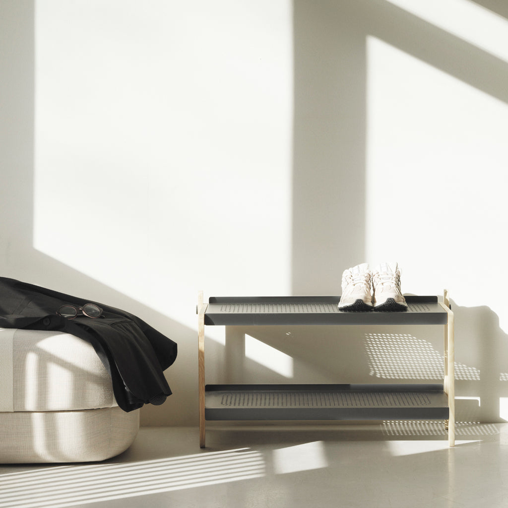 Sko is a shoe rack with both an industrial and simple feel and is made with robust, Scandinavian materials. Sko has been designed without any unnecessary components. It consists of a wooden frame with two perforated steel shelves held together by accentuated screws. Sko is available in ash, with shelves in a pure white or intense dark grey and is perfect for places where extra storage space is needed for shoes and boots, such as the hallway and bedroom
