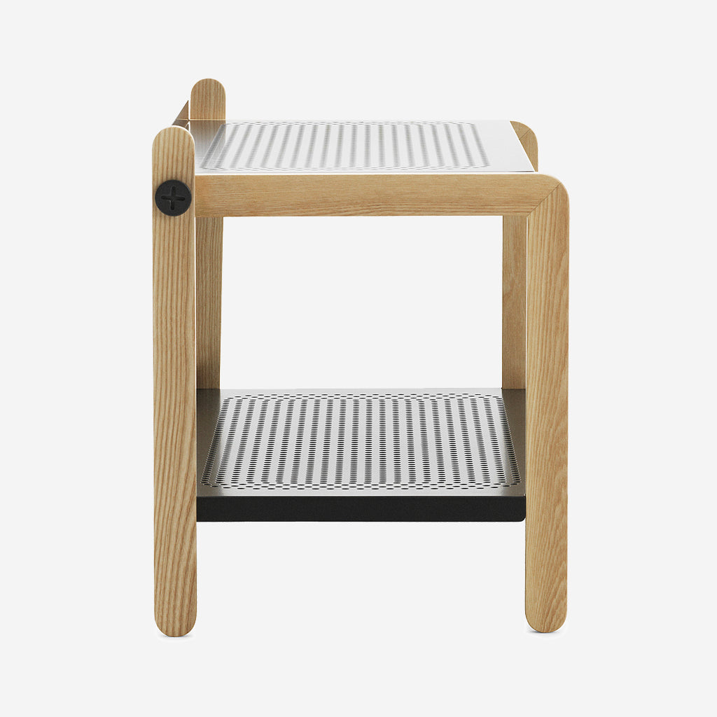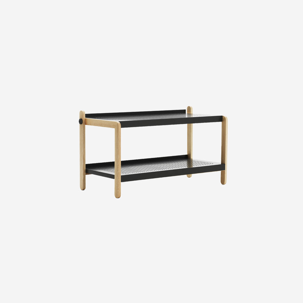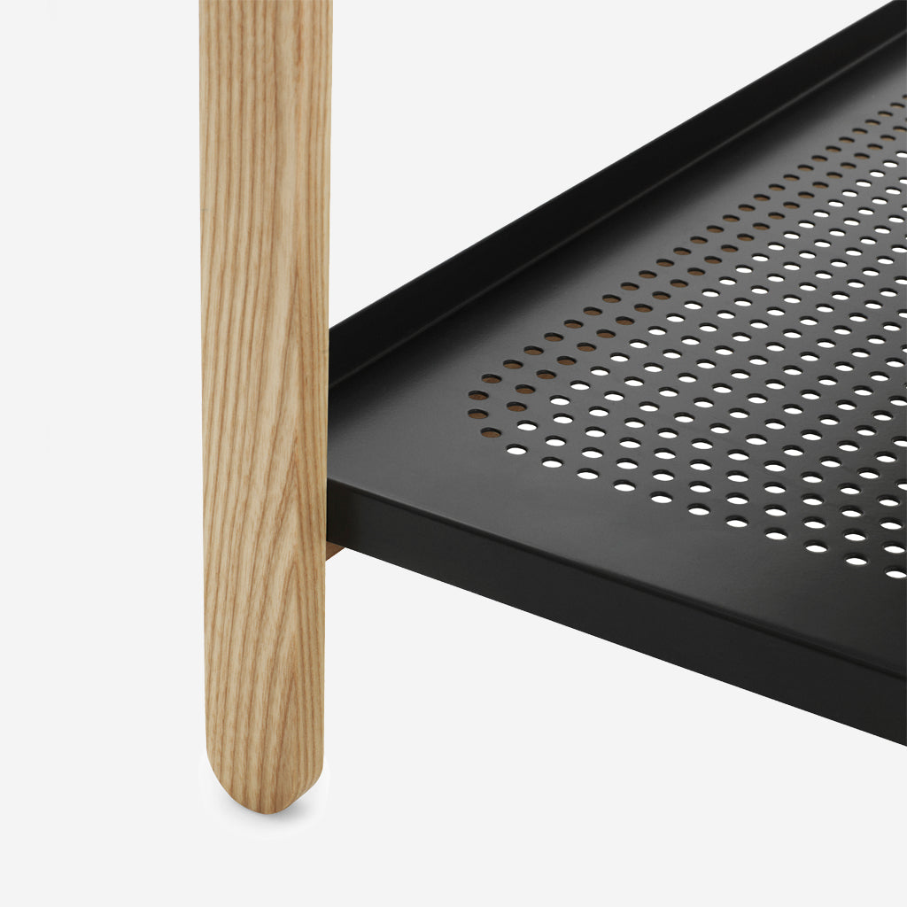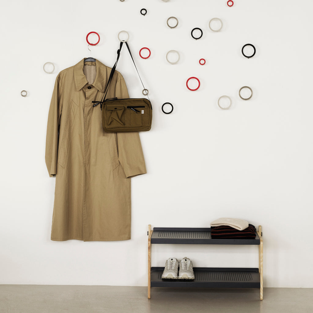 Sko is a shoe rack with both an industrial and simple feel and is made with robust, Scandinavian materials. Sko has been designed without any unnecessary components. It consists of a wooden frame with two perforated steel shelves held together by accentuated screws. Sko is available in ash, with shelves in a pure white or intense dark grey and is perfect for places where extra storage space is needed for shoes and boots, such as the hallway and bedroom