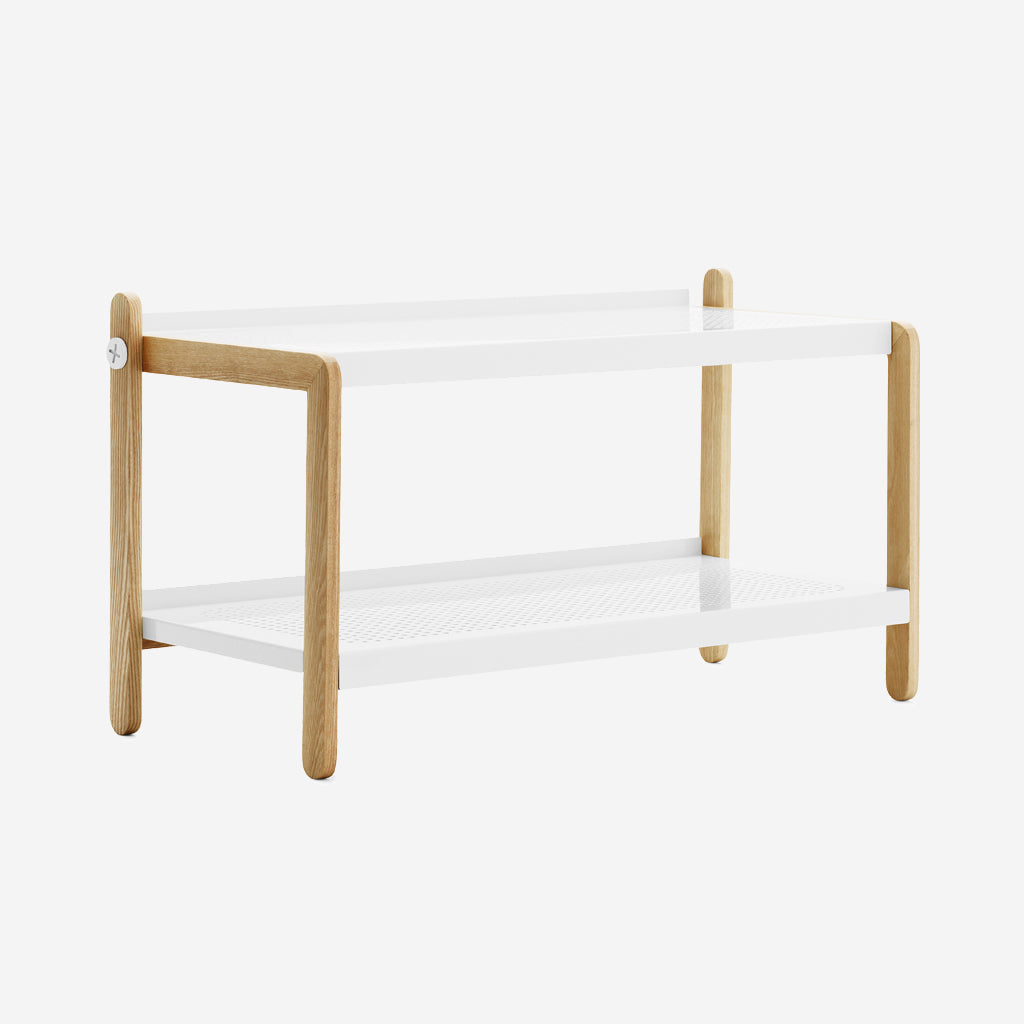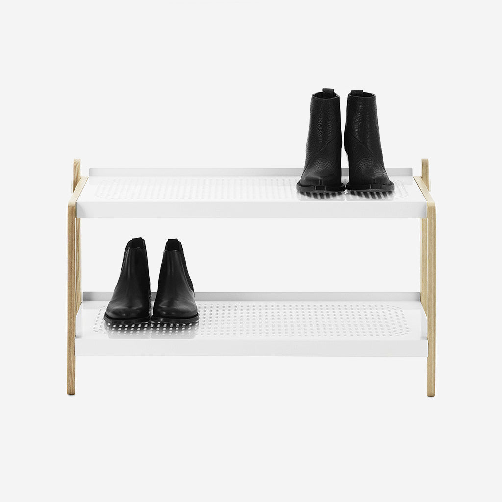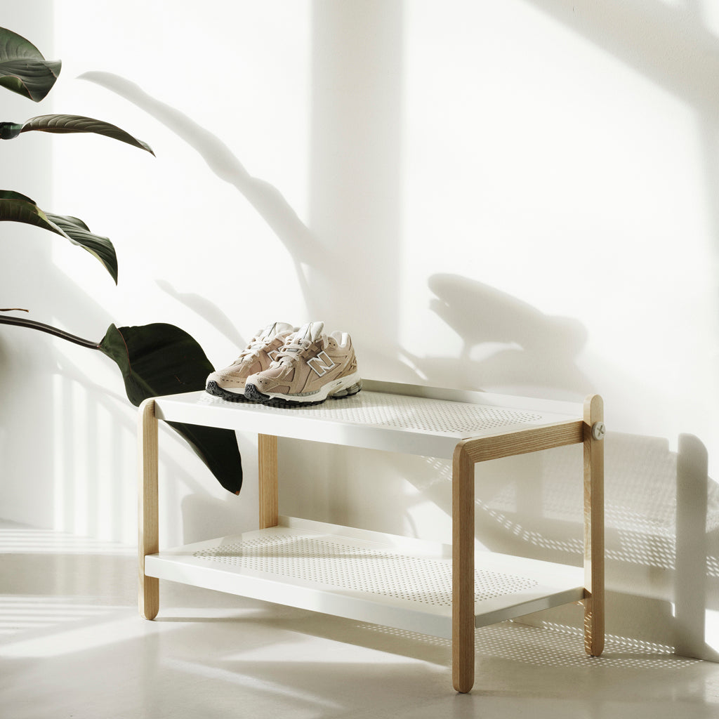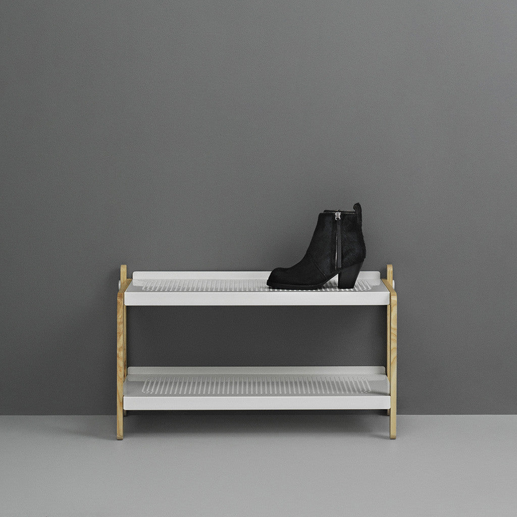 Sko is a shoe rack with both an industrial and simple feel and is made with robust, Scandinavian materials. Sko has been designed without any unnecessary components. It consists of a wooden frame with two perforated steel shelves held together by accentuated screws. Sko is available in ash, with shelves in a pure white or intense dark grey and is perfect for places where extra storage space is needed for shoes and boots, such as the hallway and bedroom