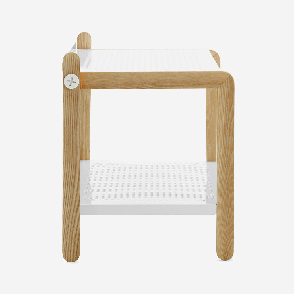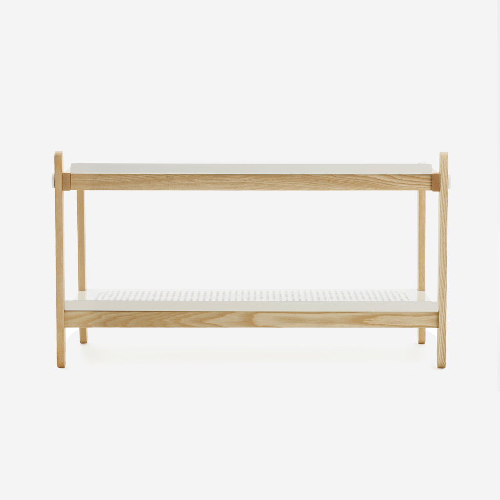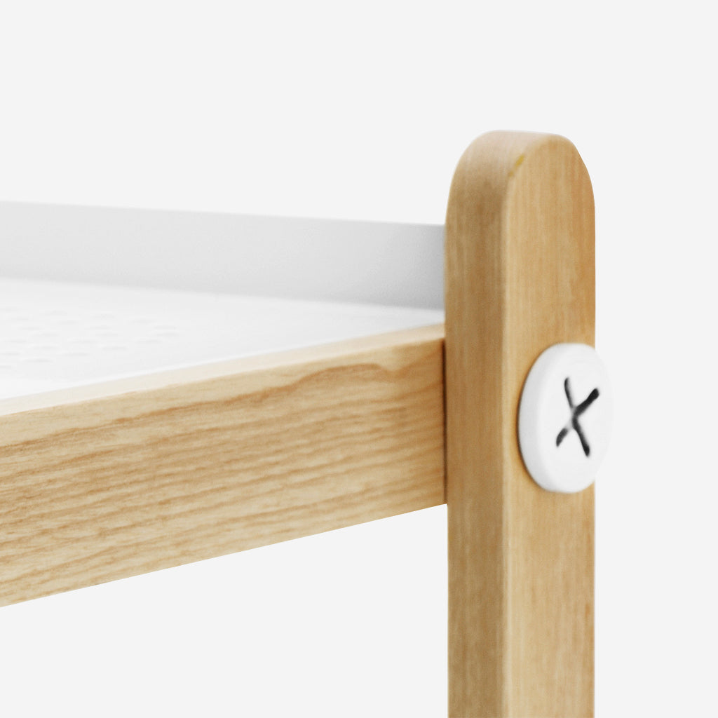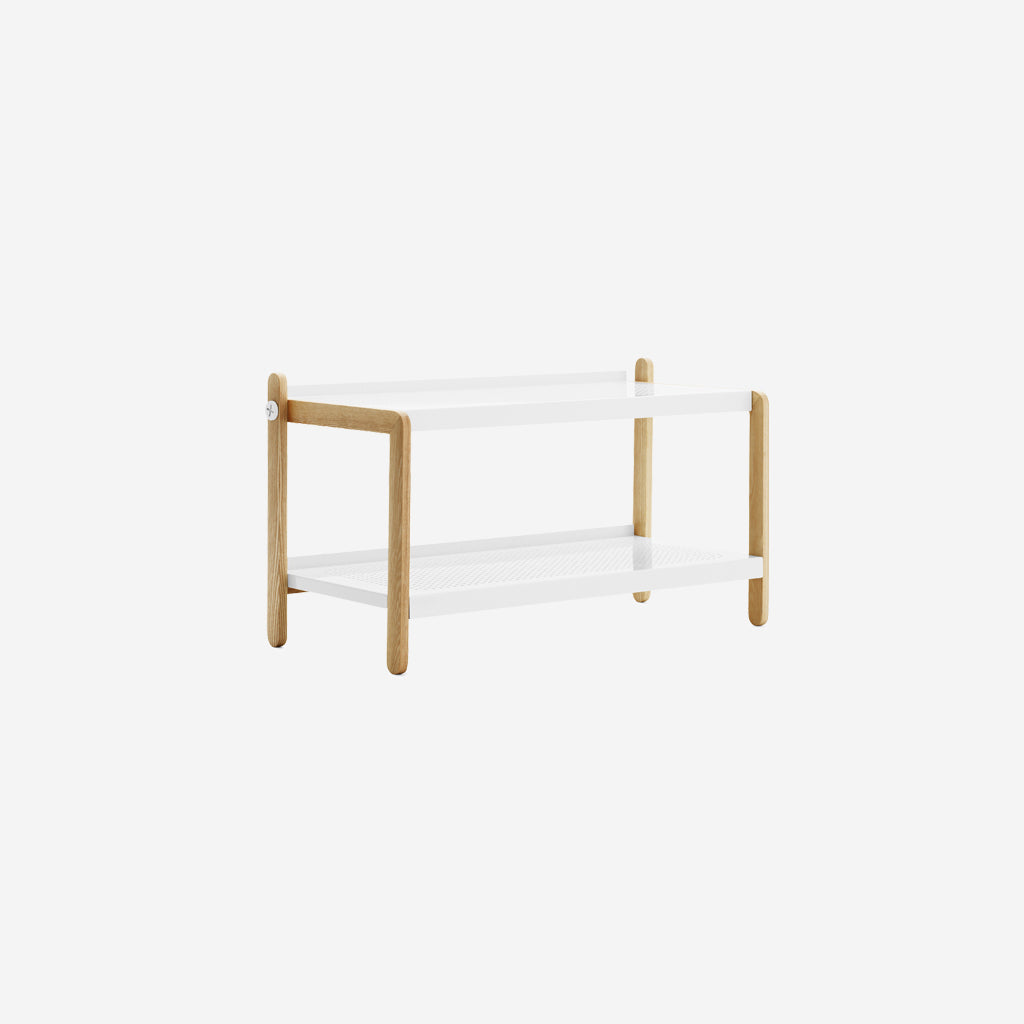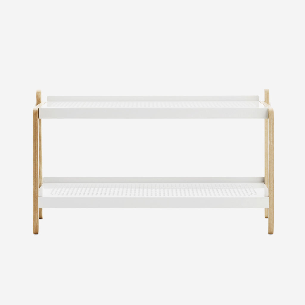 Sko is a shoe rack with both an industrial and simple feel and is made with robust, Scandinavian materials. Sko has been designed without any unnecessary components. It consists of a wooden frame with two perforated steel shelves held together by accentuated screws. Sko is available in ash, with shelves in a pure white or intense dark grey and is perfect for places where extra storage space is needed for shoes and boots, such as the hallway and bedroom