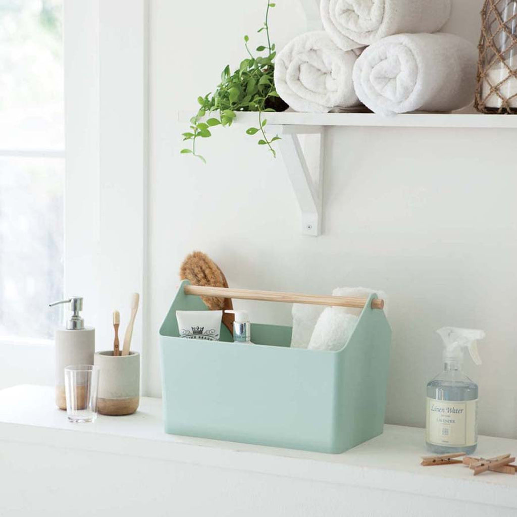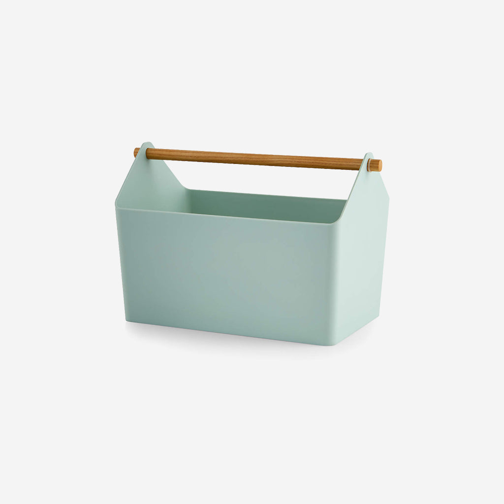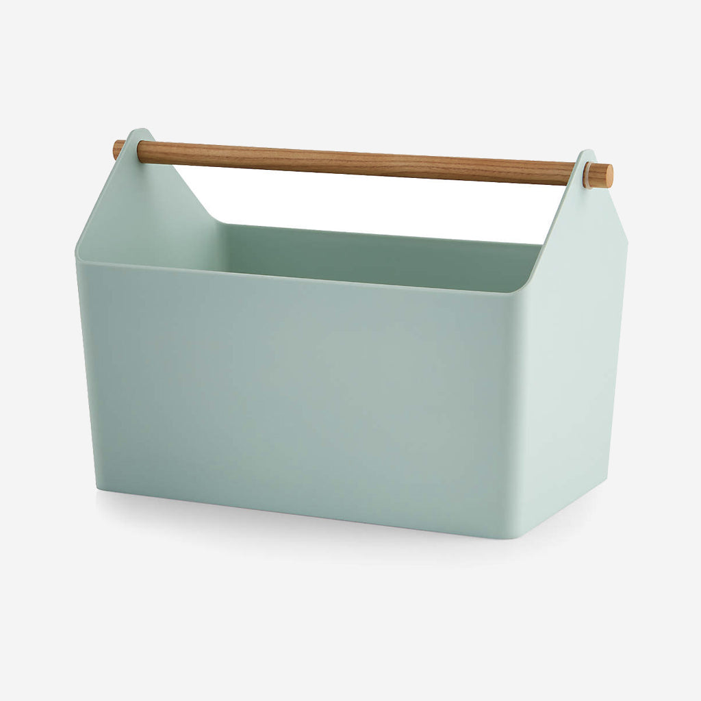 Yamazaki's Storage Caddy in mint is the perfect storage solution for beautifying everything from cleaning products to kids toys. Made of polypropylene with a wooden handle this box looks stylish while keeping things nice and tidy and is comfortable to carry around.