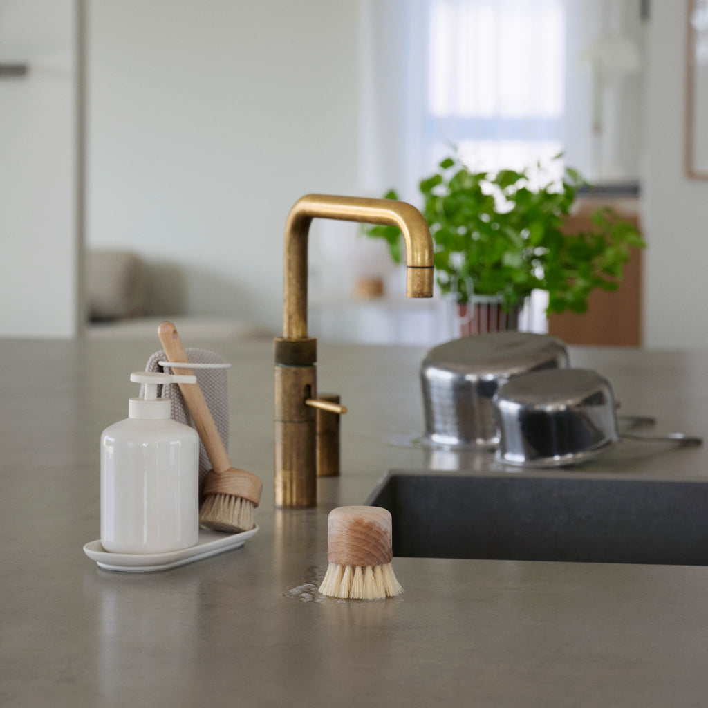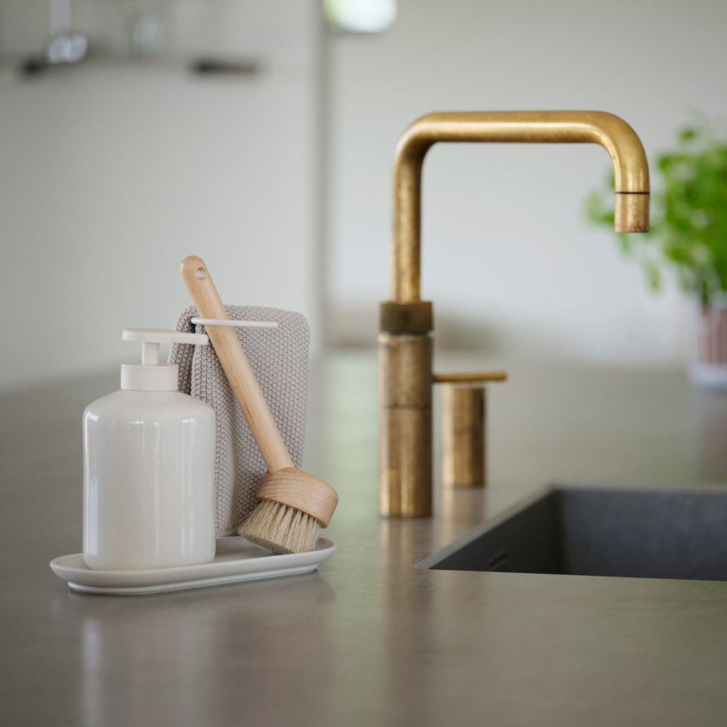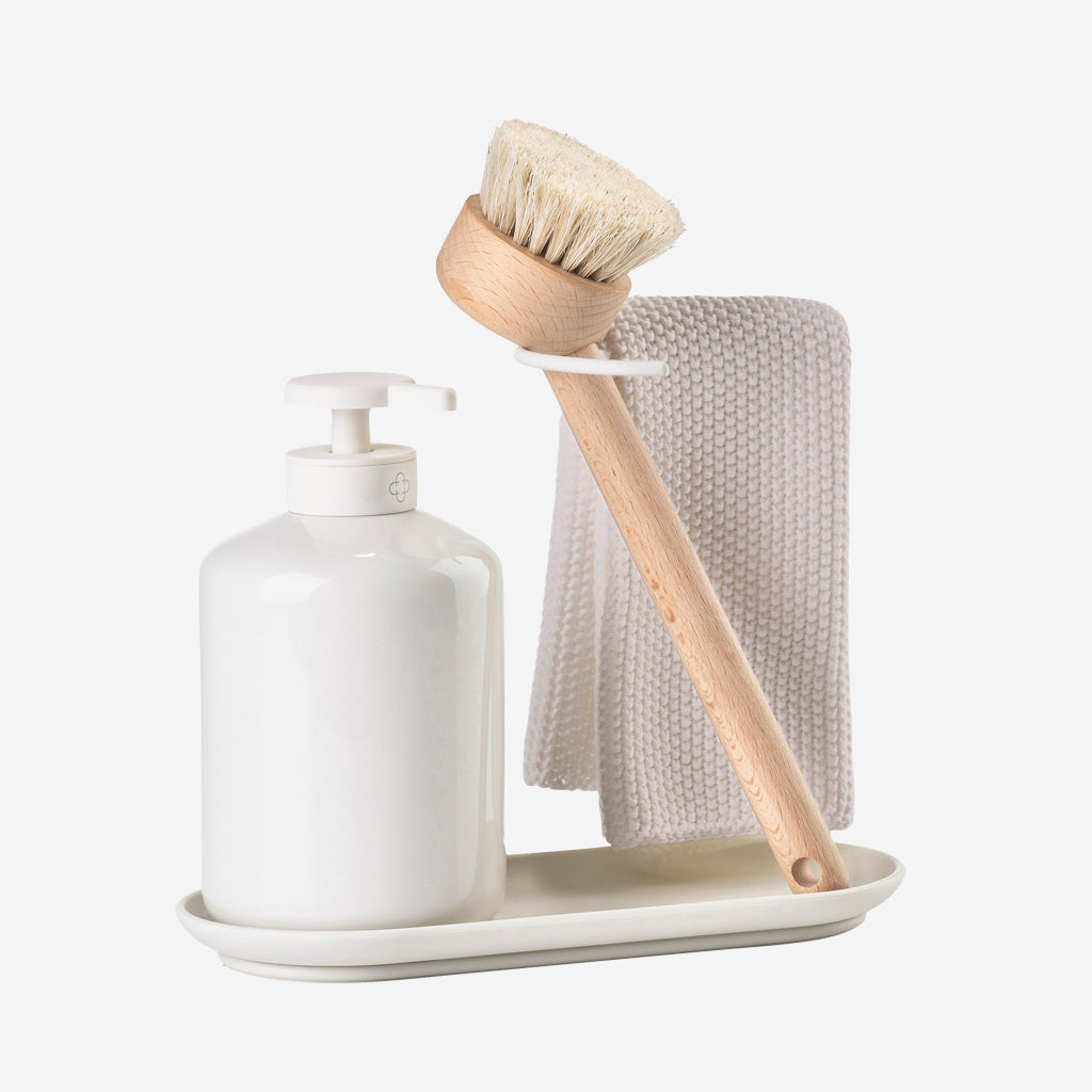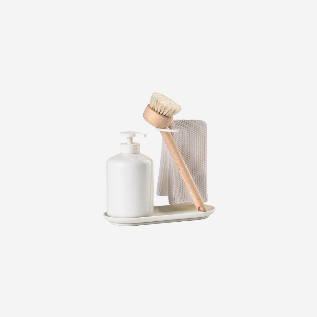 An understated dishwashing set from Zone Denmark fitted with a silicone tray, a decently sized dispenser for soap or dishwashing liquid, a matching dishcloth and brush. Featuring a steel stand, for the brush and cloth the lean on, this stand also acts as a handle when moving around the kitchen.