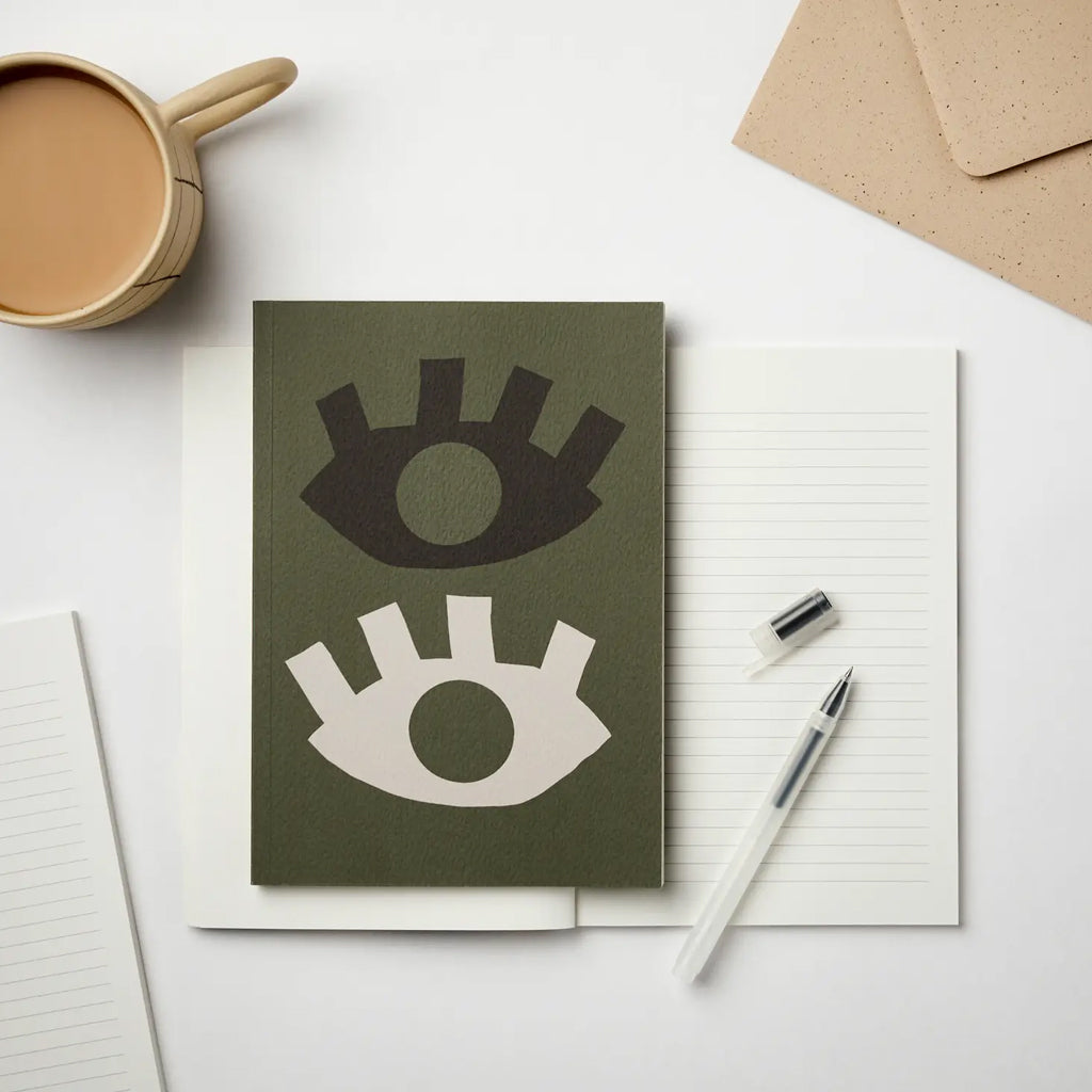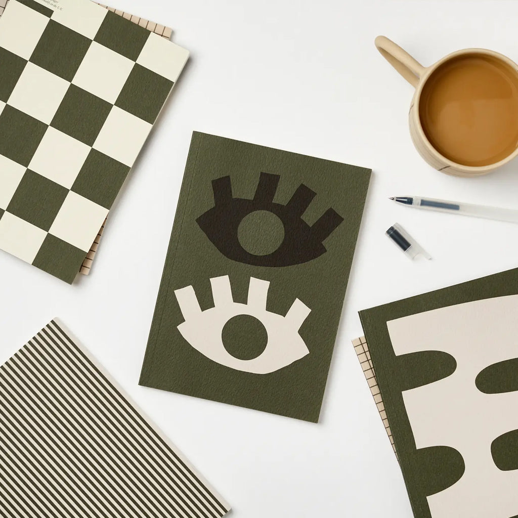 Kinshipped's 'I see you' notebook features a striking abstract design in black, cream and a perfect green for A/W. This particular notebook has 100 alternating ruled and plain pages.