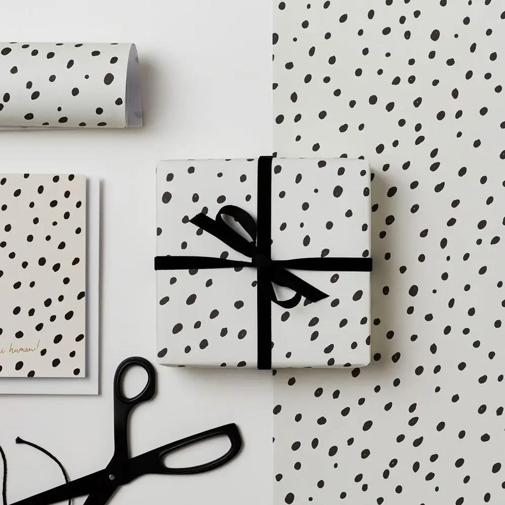 Kinshipped's wrap in light grey with black dots is the perfect weight for folding and creating beautifully wrapped gifts. Using vegetable inks on uncoated and recycled stock, the sheets are large at 70x50cm.