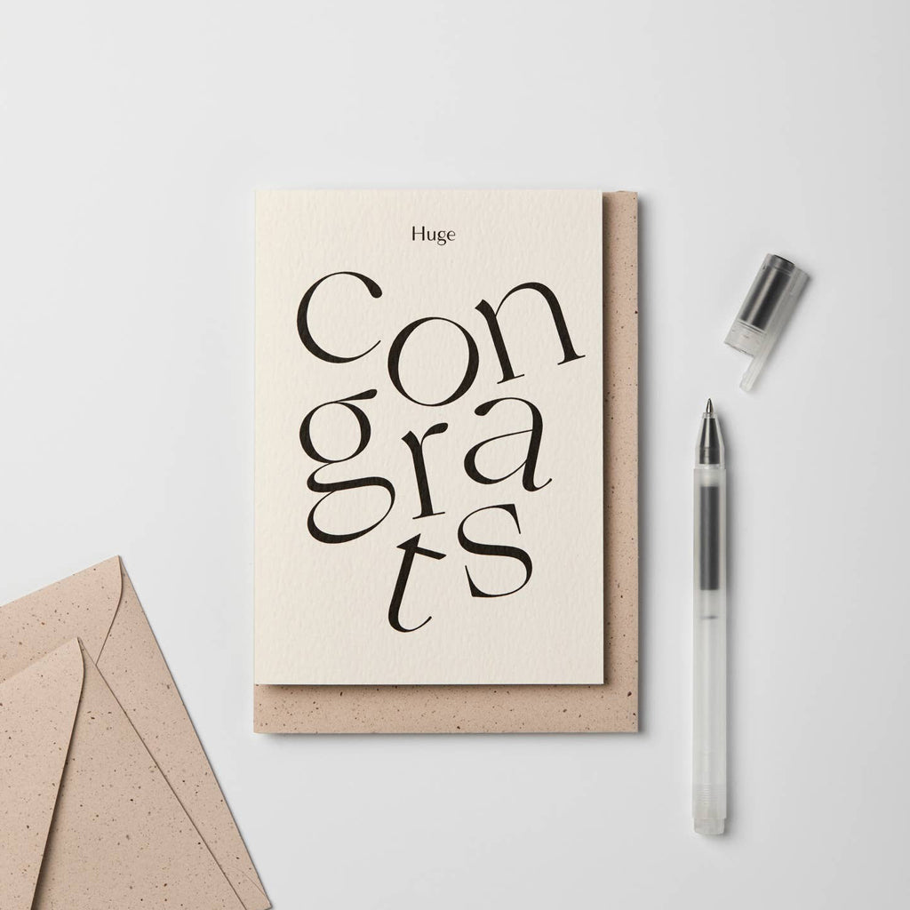 A Serif Type Huge Congrats card from the Serif Type range. A very slightly off-white card with black type collage. Printed on FSC textured stock and accompanied by a luxury cacao envelope. Chic, playful and in a perfect palette to look good with any gift you might give. Printed sustainably in the UK. There is no copy on the outside leaving the words for the sender.
