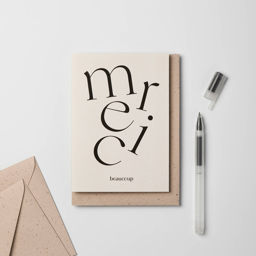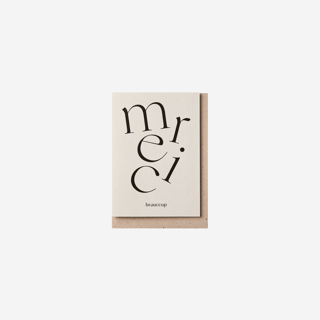A Serif Type Thank You, Merci Beaucoup, card in French for the Parisian in your life. Chic, playful and in a perfect palette to look good with any gift you might give. from the Serif Type range. A very slightly off-white card with black type collage. Printed on FSC textured stock and accompanied by a luxury cacao envelope. Chic, playful and in a perfect palette to look good with any gift you might give. Printed sustainably in the UK. There is no copy on the outside leaving the words for the sender.