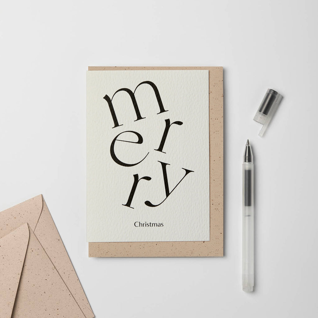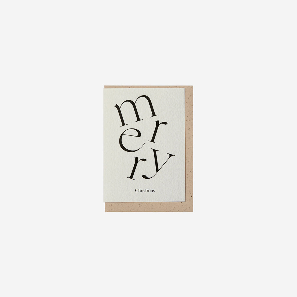 A Serif Type Merry Christmas card from the Serif Type range. A very slightly off-white card with black type collage. Printed on FSC textured stock and accompanied by a luxury cacao envelope. Chic, playful and in a perfect palette to look good with any gift you might give. Printed sustainably in the UK. There is no copy on the outside leaving the words for the sender.