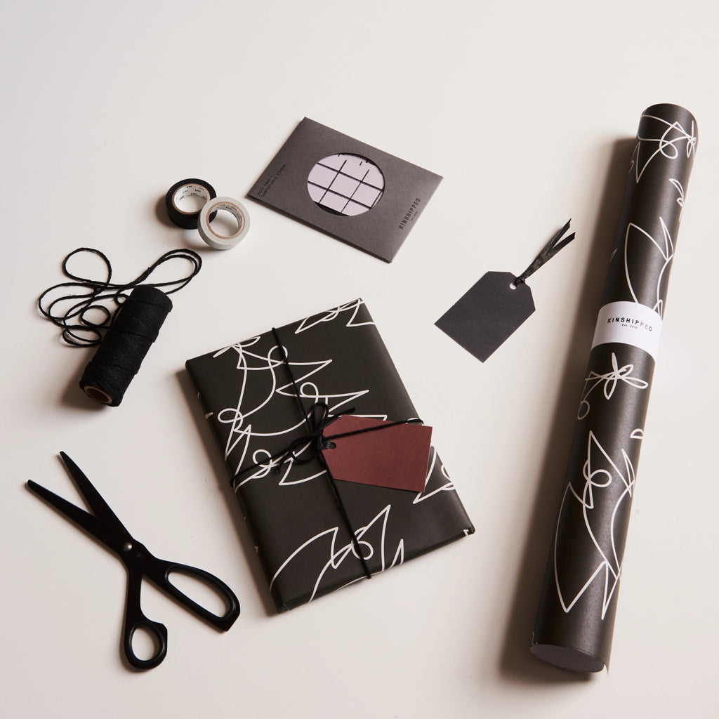Kinshipped's most popular seasonal wrap in black with white lines is the perfect weight for folding and creating beautifully wrapped gifts. Using vegetable inks on uncoated and recycled stock, the sheets are large at 70x50cm.