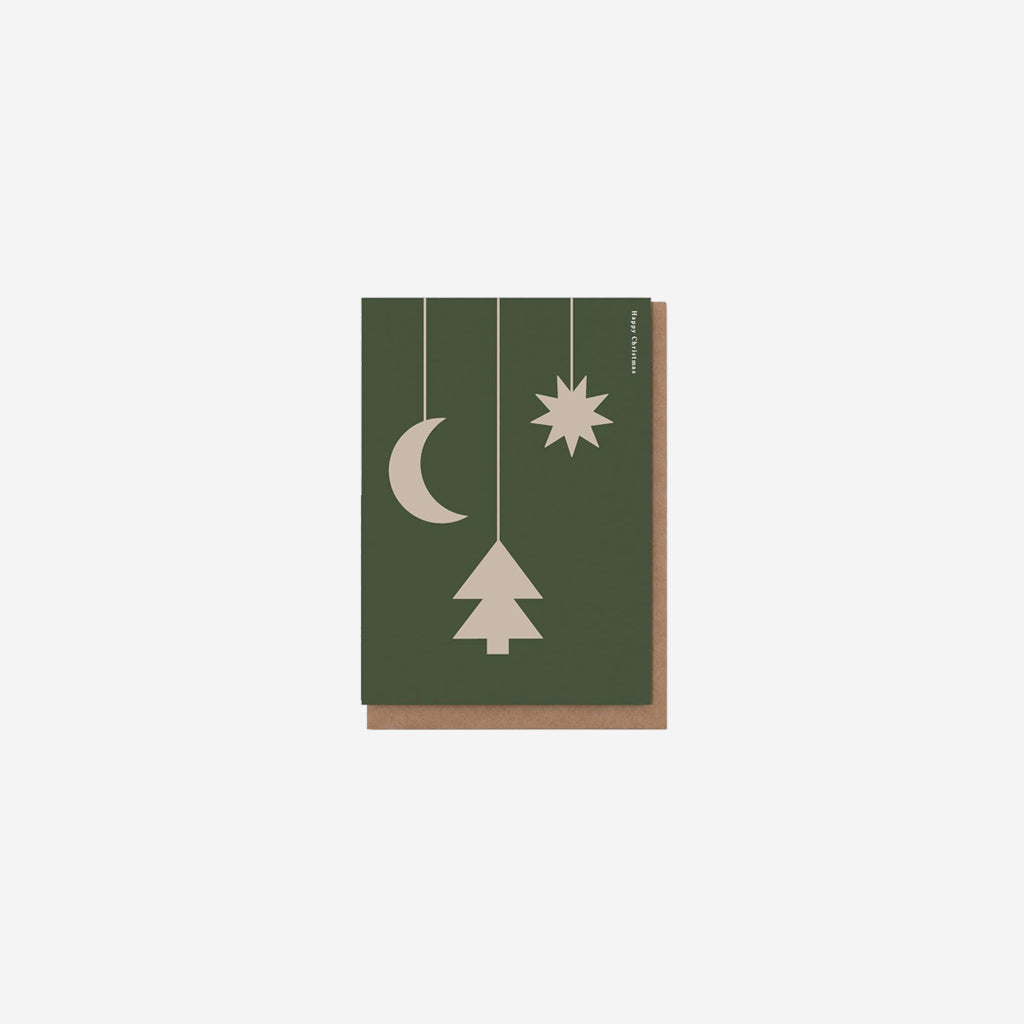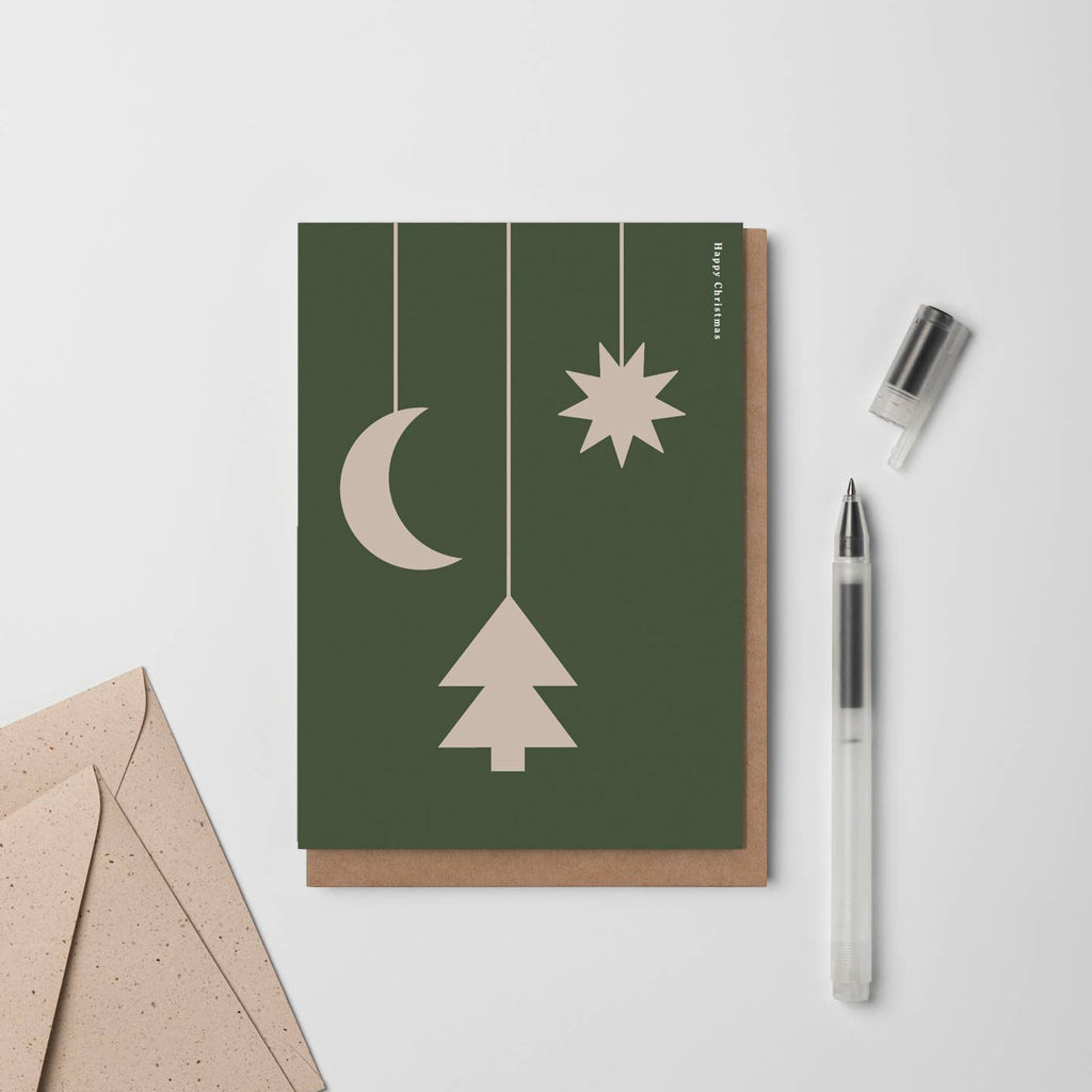 A new colourway for a much loved card, without the special finishes. A lovely rich green and a griege off-white for this simple, scandi, Christmas decoration greeting card. Front reads 'Happy Christmas'.