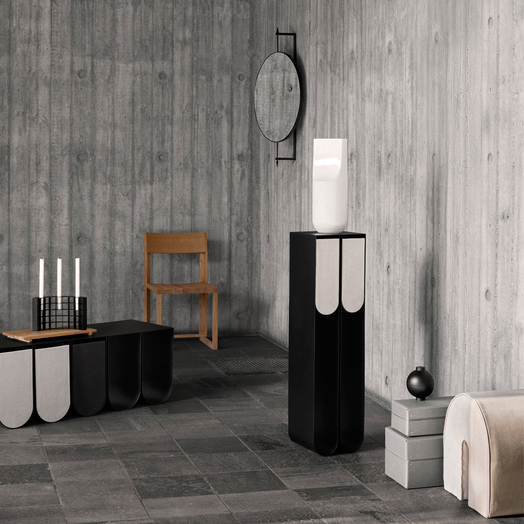 Nothing sets off a treasured art piece like a stand-alone pedestal. The Curved Pedestal has a graphic and minimalistic expression that underlines the displayed objects while subtly claiming its space. The Curved Pedestal is made of thin powder coated metal with four storing frames where separately sold boxes fit elegantly. Curved Pedestal is a part of the Curved series that consists of sculptural timeless signature designs, paying tribute to simplicity.