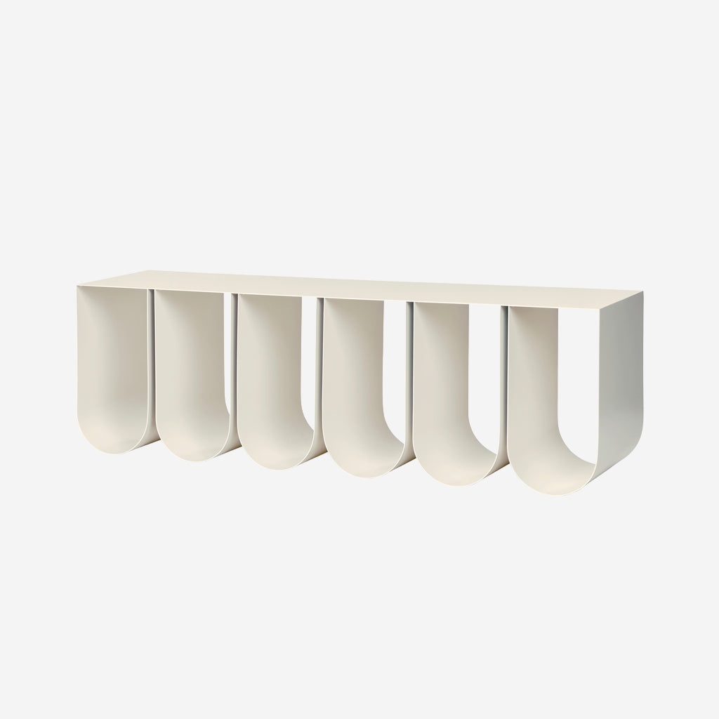 The Curved Wall Shelf is designed with six subtle curves making it a sculptural and minimalistic wall shelf ideal for storing or displaying books, sculptures, or hallway necessities. The Curved Wall shelf is made of thin powder coated metal with six curved storing frames where separately sold boxes fit elegantly. Curved Wall Shelf is a part of the Curved series that consists of sculptural timeless signature designs, paying tribute to simplicity.