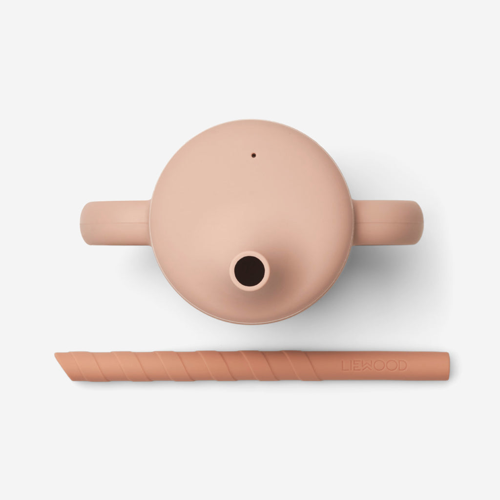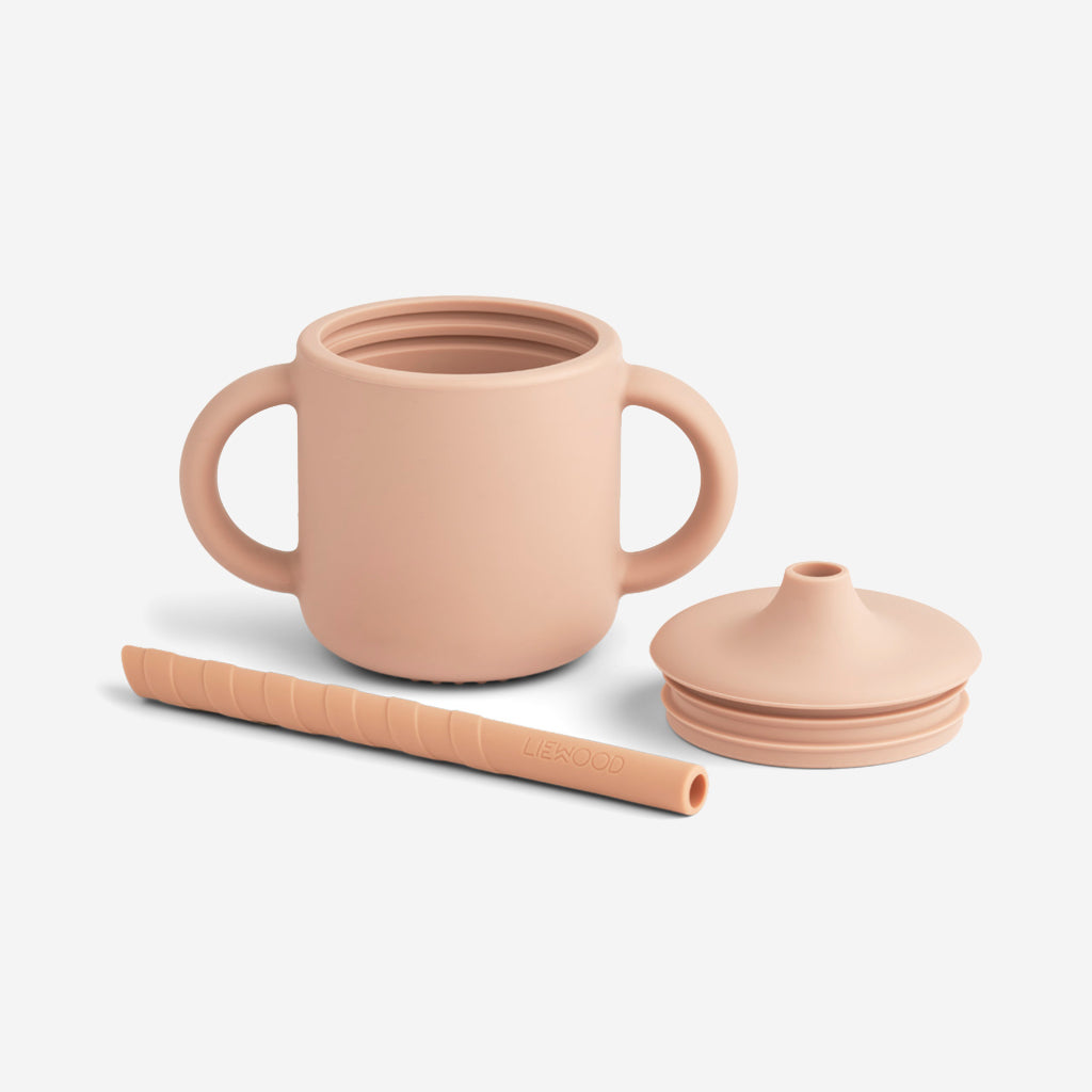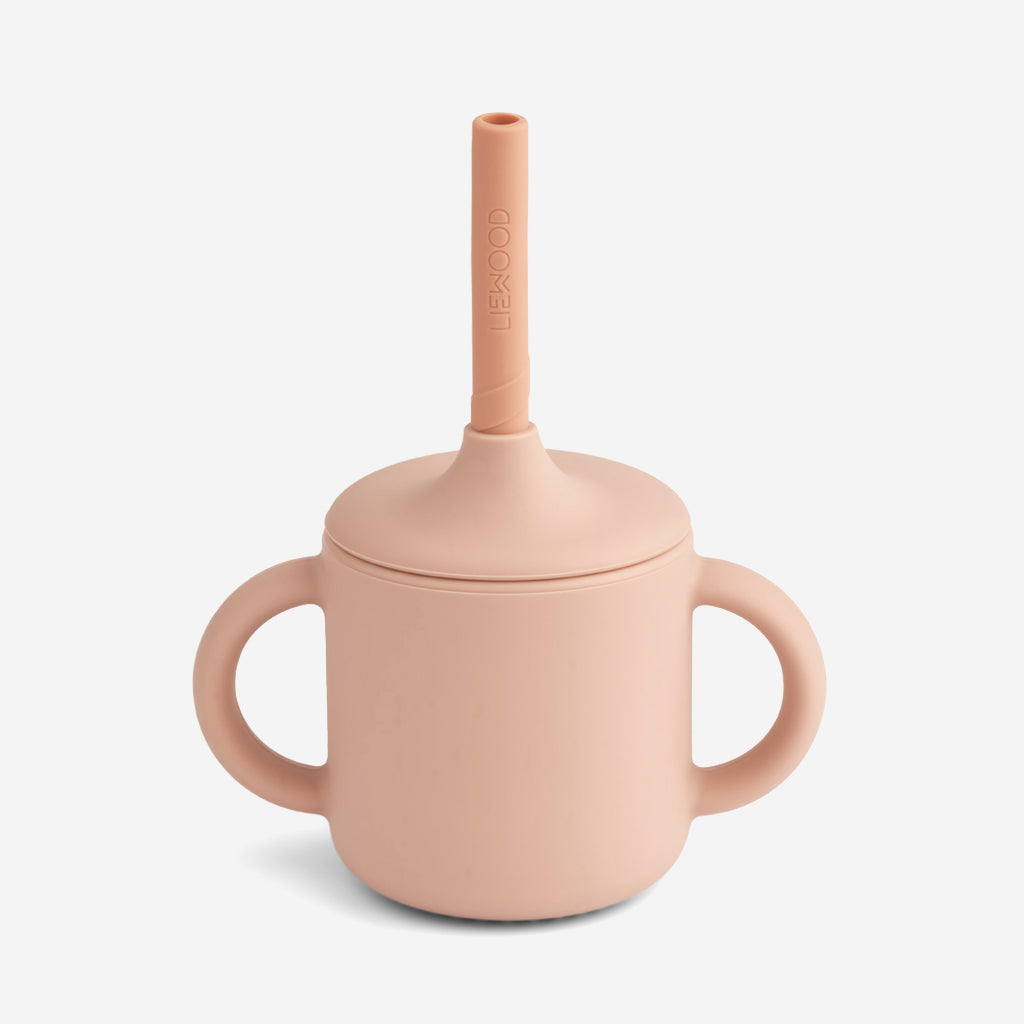 The Liewood Cameron Sippy Cup in rose is a great way for your child to improve their fine motor skills and learn to drink independently. The removable lid has a small spout and can be used with or without the accompanying straw.