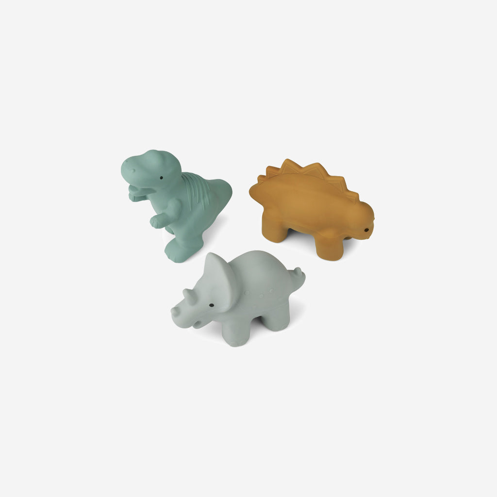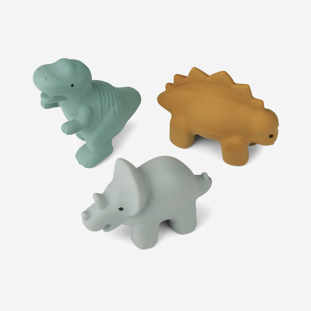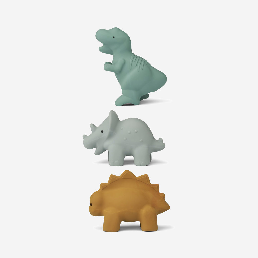 The Liewood David Toys pack, in light blue mix, consists of three toy dinosaurs made from 100% natural rubber guaranteeing hours of entertainment in the bathtub or as toys in the children’s room.